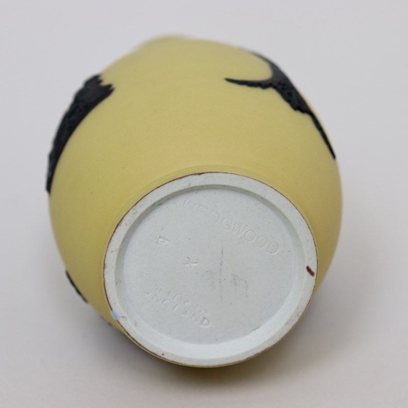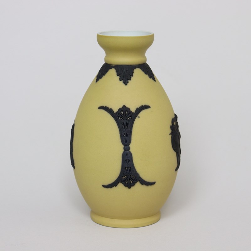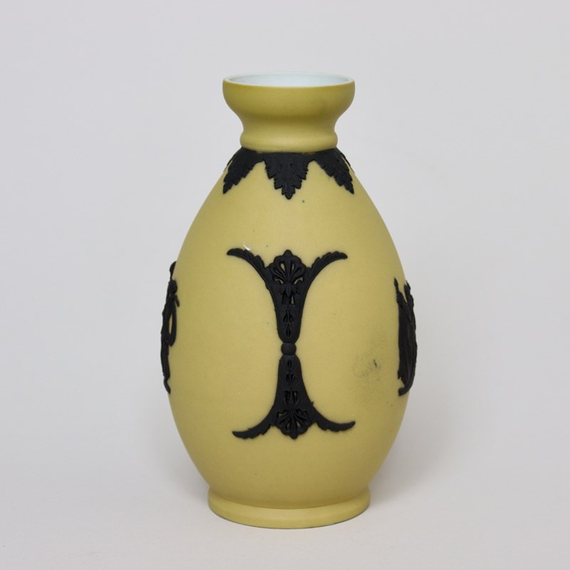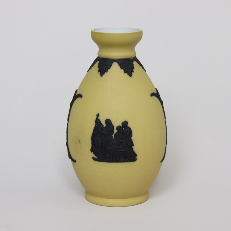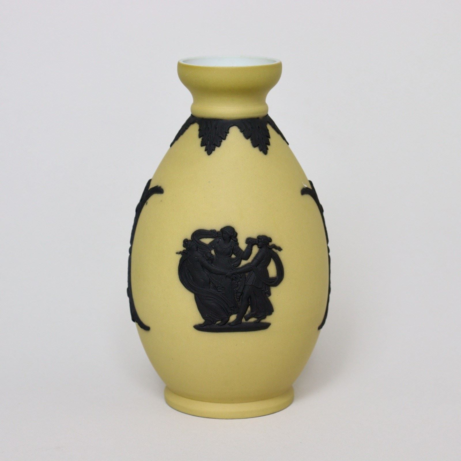 A Wedgwood, yellow and black jasper dip bud vase. This is marked “WEDGWOOD MADE IN ENGLAND” and it dates from c.1920. It is decorated, in black relief against a mustard yellow ground, with three different classical subjects, including the Three Graces. These are set between large anthemion and to the neck of the vase is a band of stiff leaves. It is in excellent condition.
