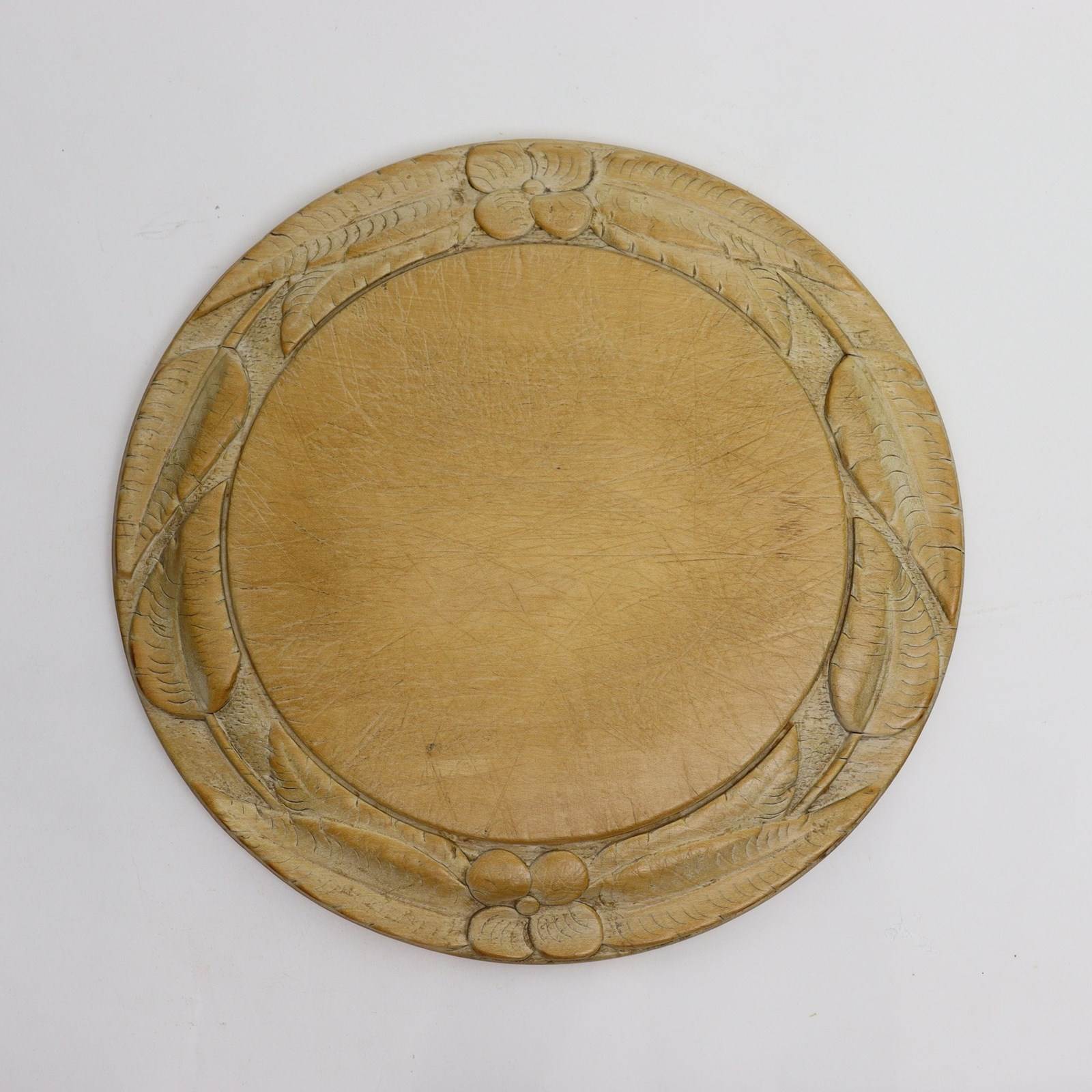 A lovely quality, sycamore breadboard deeply carved with flowers and leaves. This is English and it dates from c.1870. It is very well carved and the carving has good depth and detail. There is slight wear to the carving, giving character. There are knife marks to both the face and the reverse of the board, from use, and a hanging loop has been attached to the back. This does not affect the ability for the board to lay flat for use. The wood has a lovely, pale patina.
