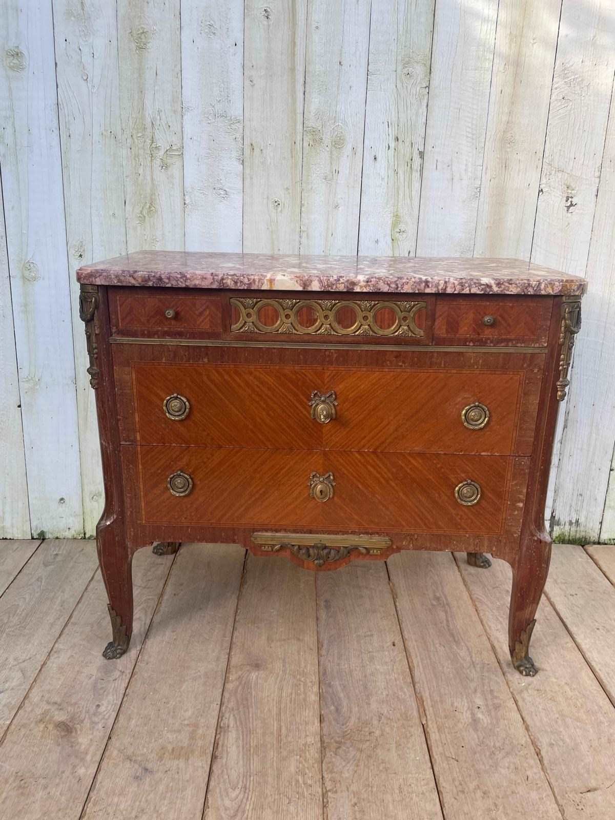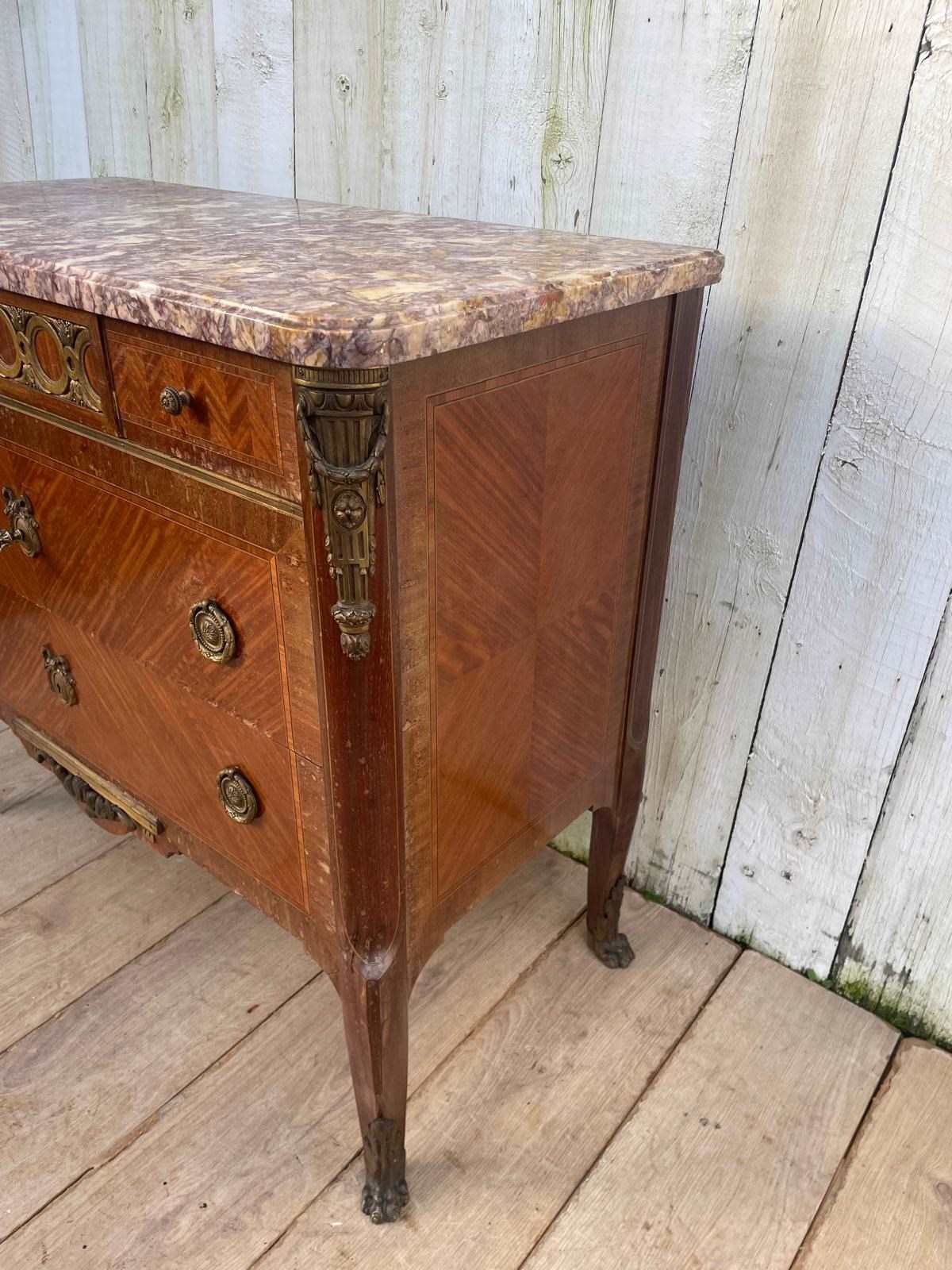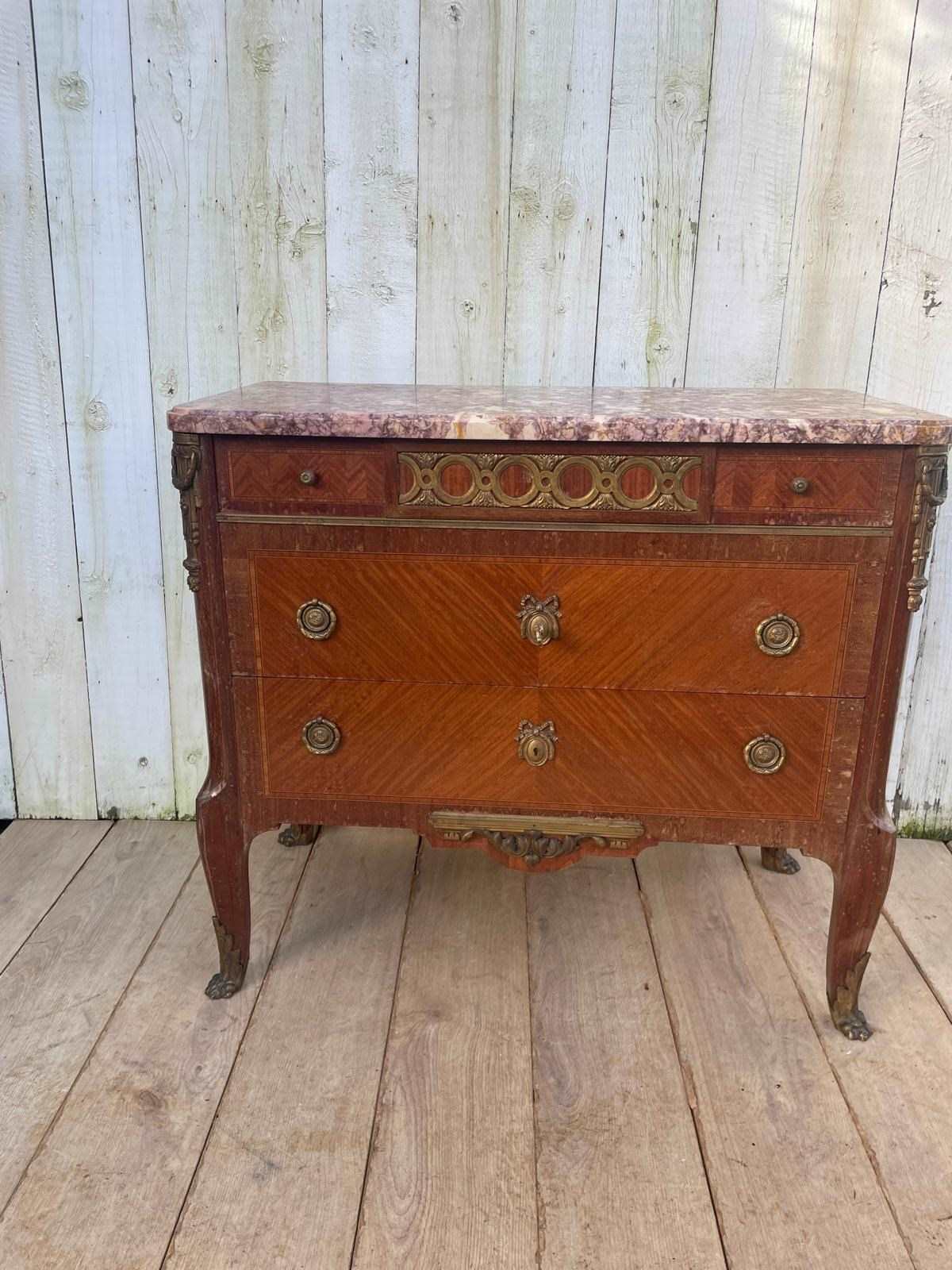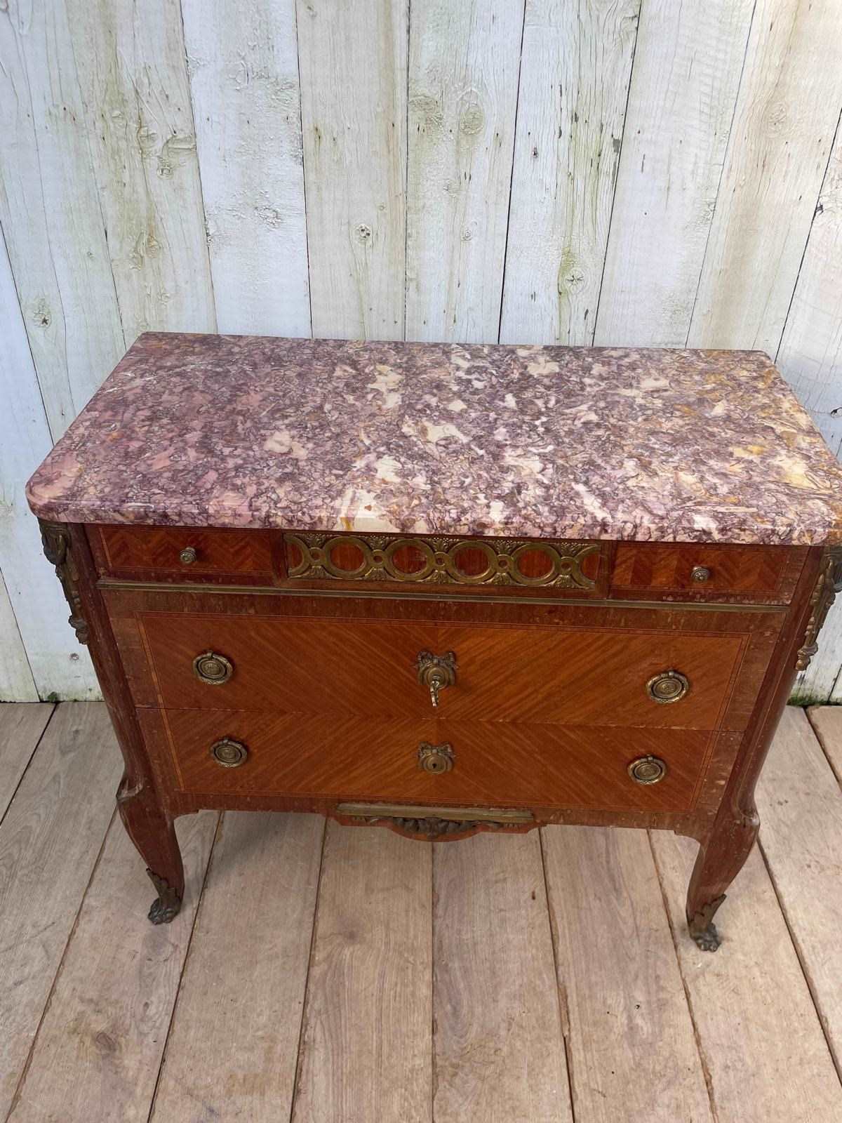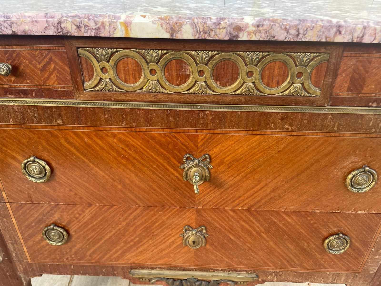 It features a distinctive marble top with ornate brass mounts and handles.