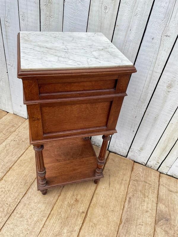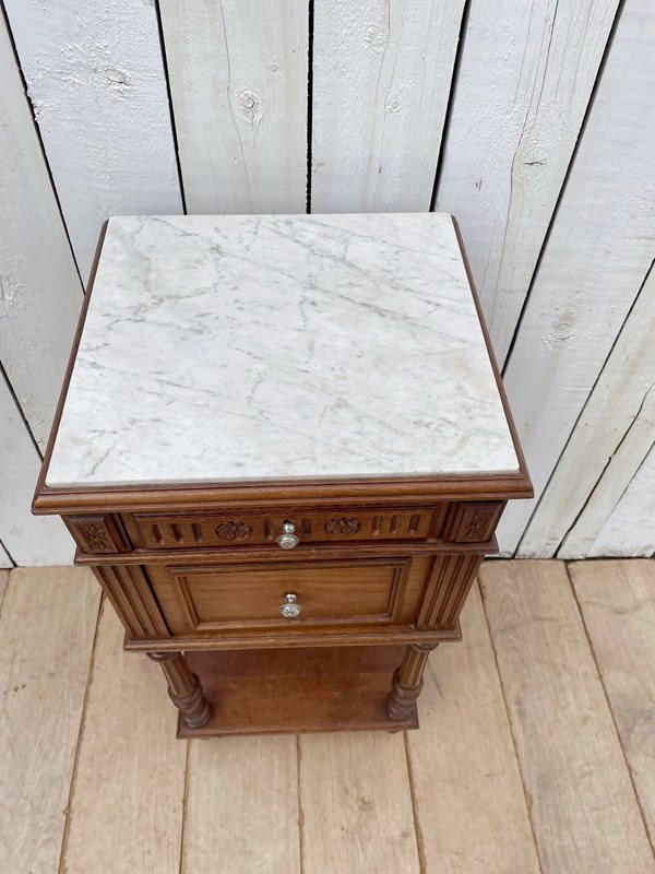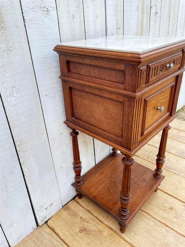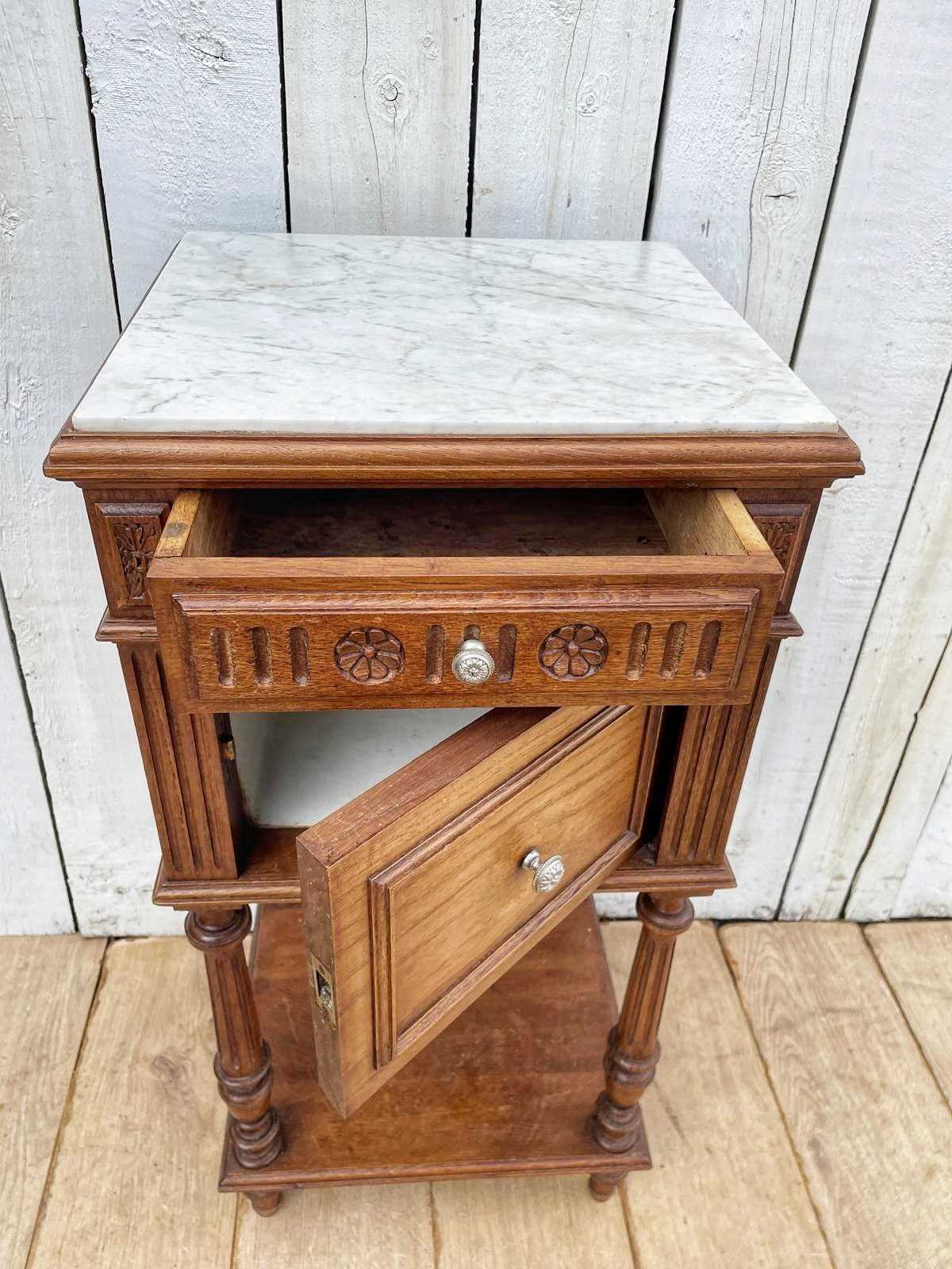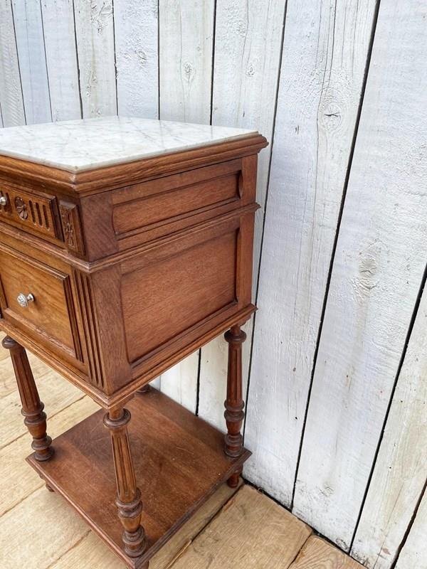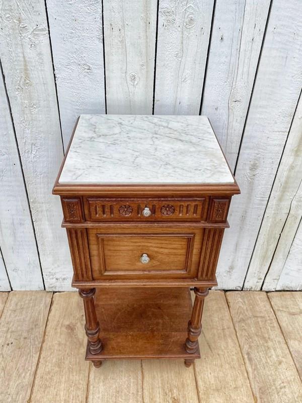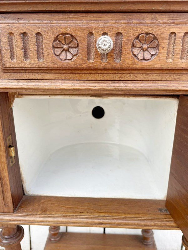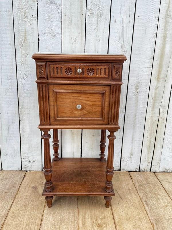 With decorative carving this oak bedside has a drawer and cupboard, plus a lower shelf.
