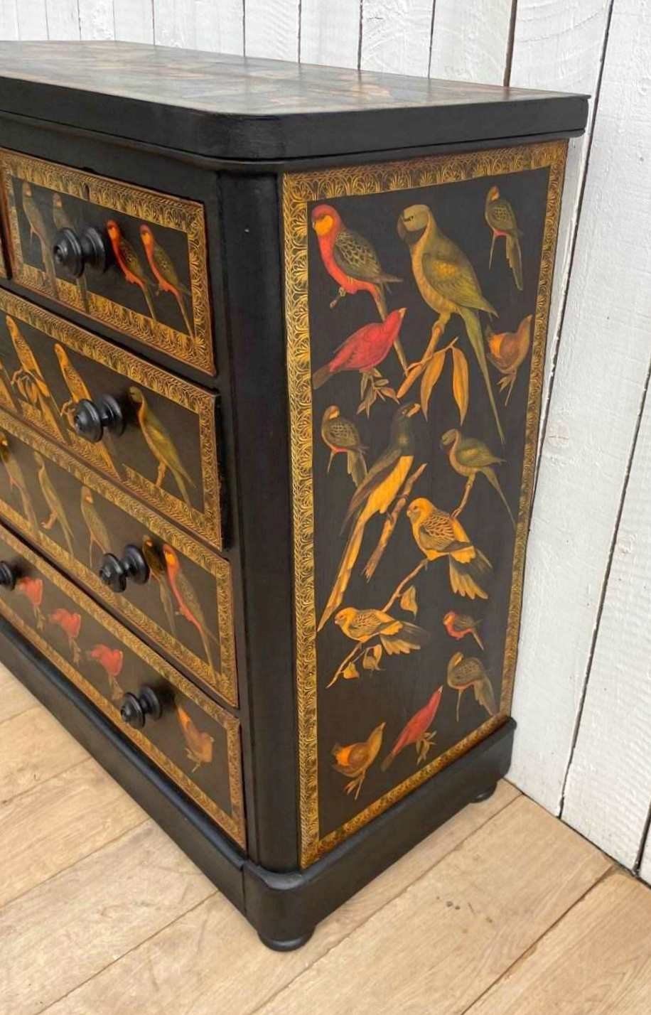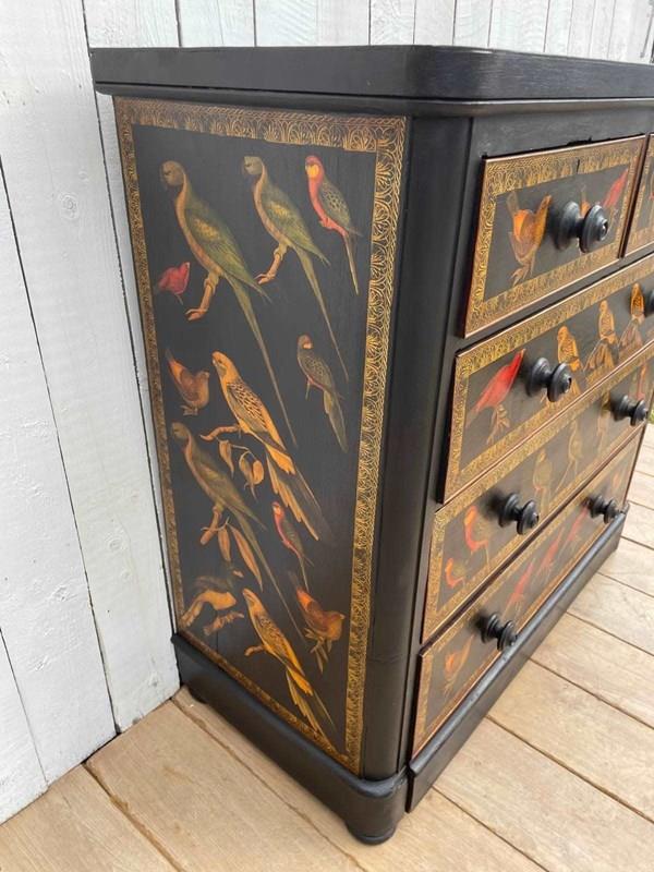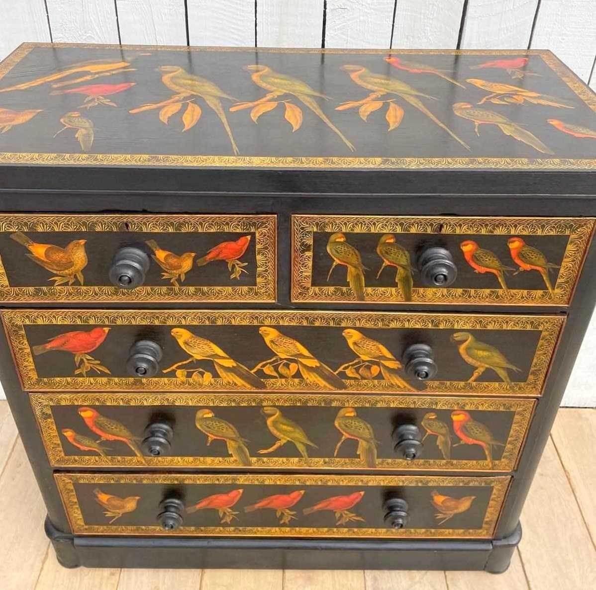 Later painted and decorated with brightly coloured birds and a decorative border decoupage.
