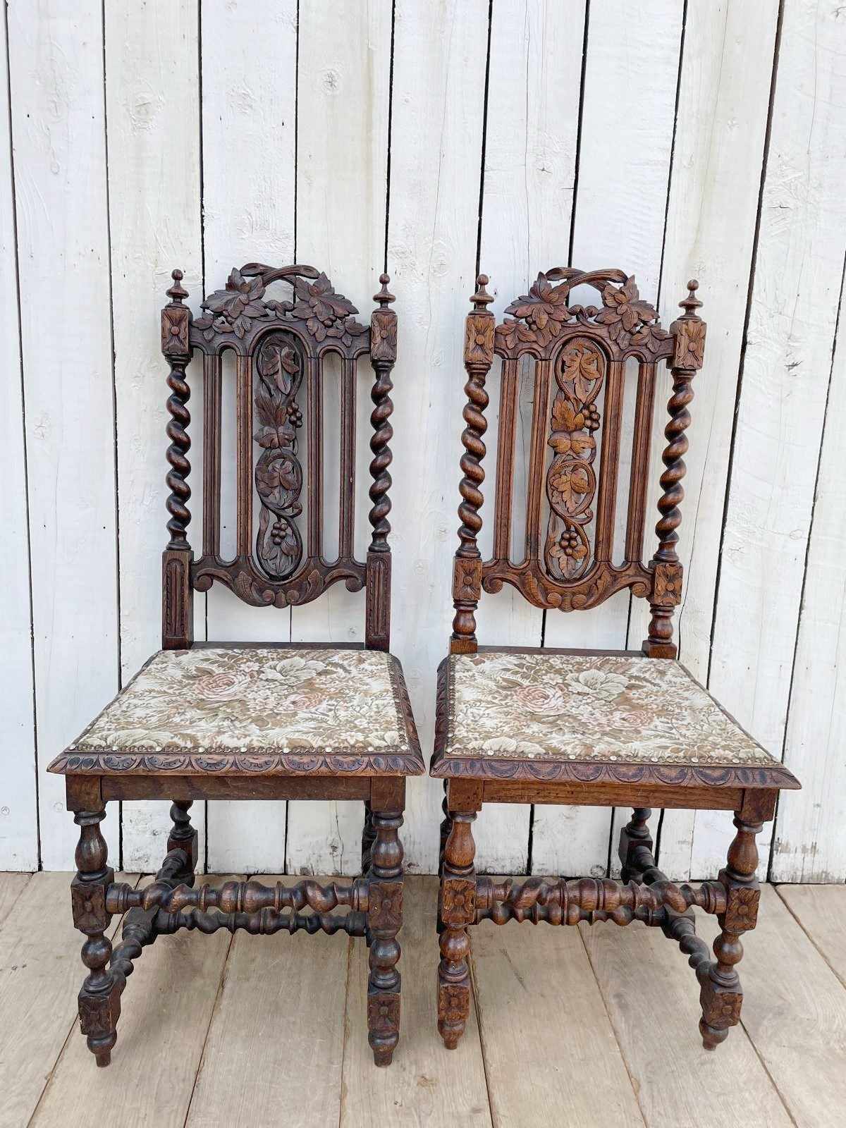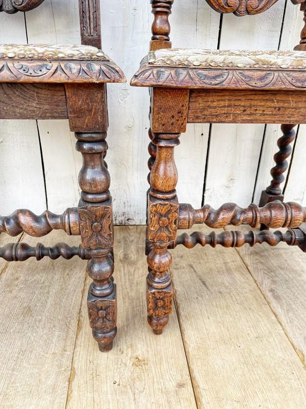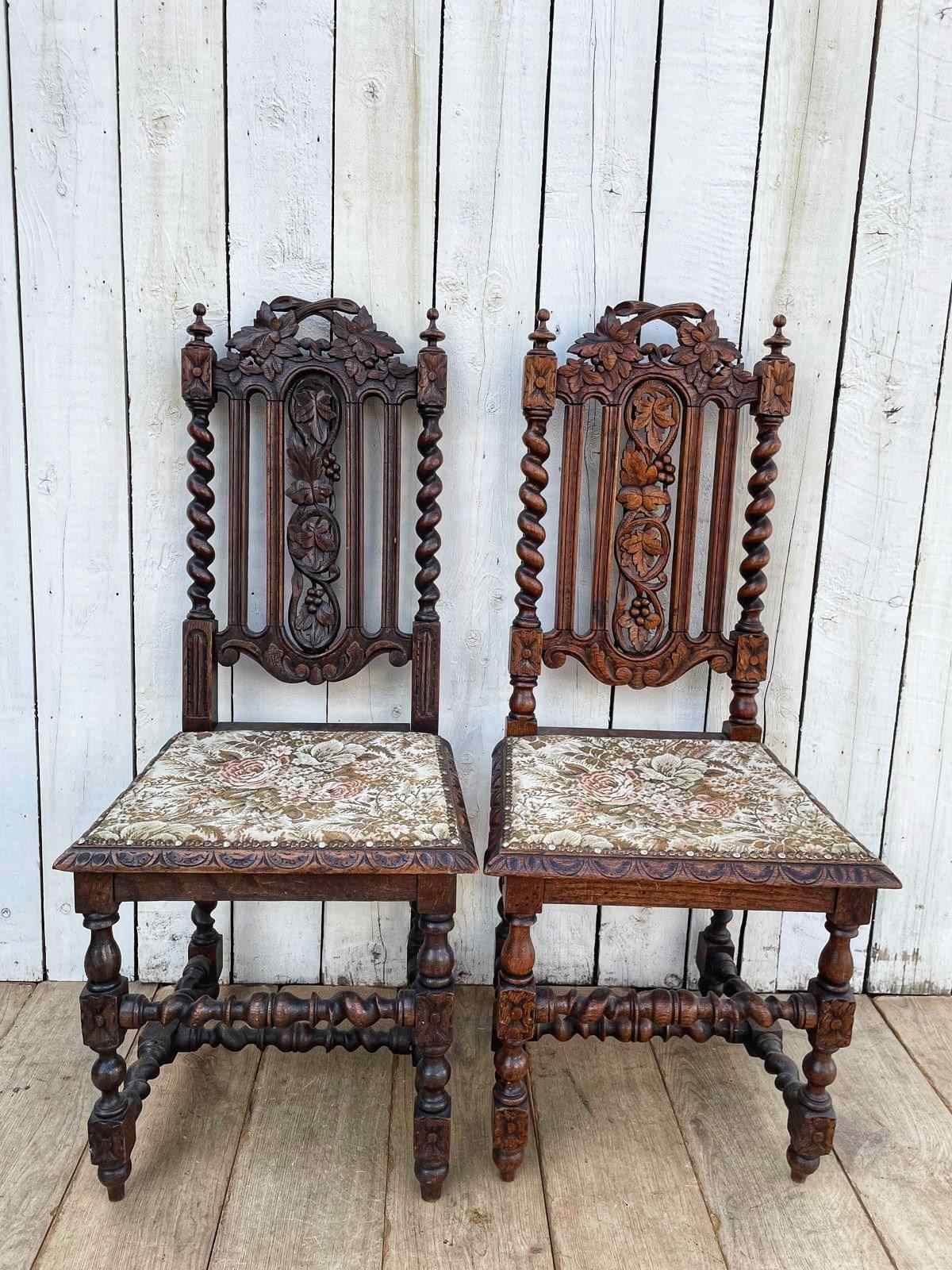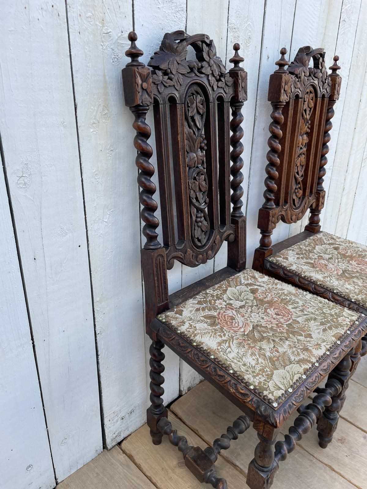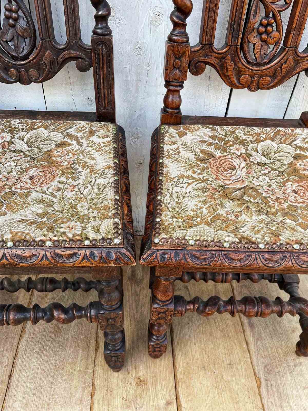 In oak these ornately carved chairs have tapestry style fabric covered seats.