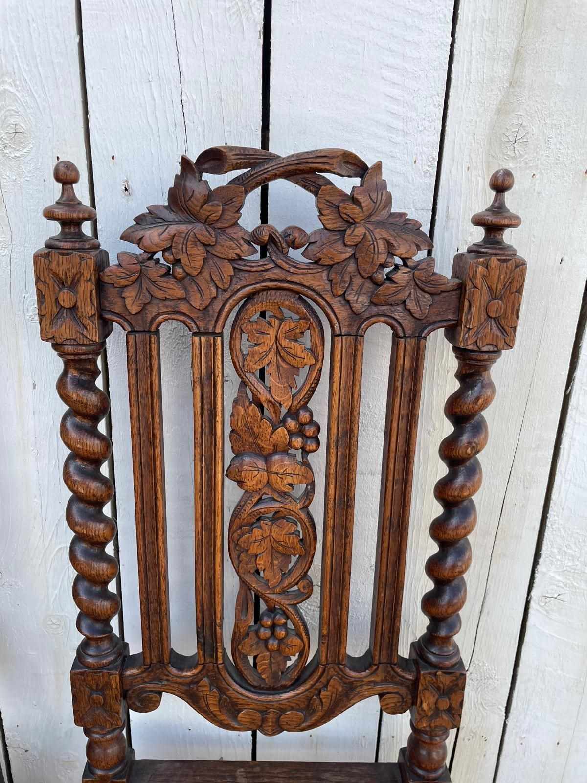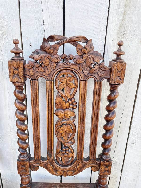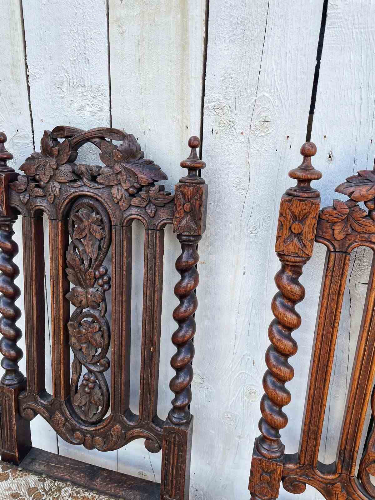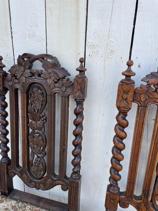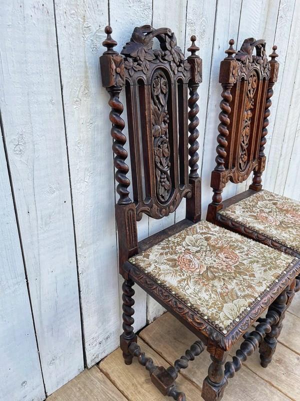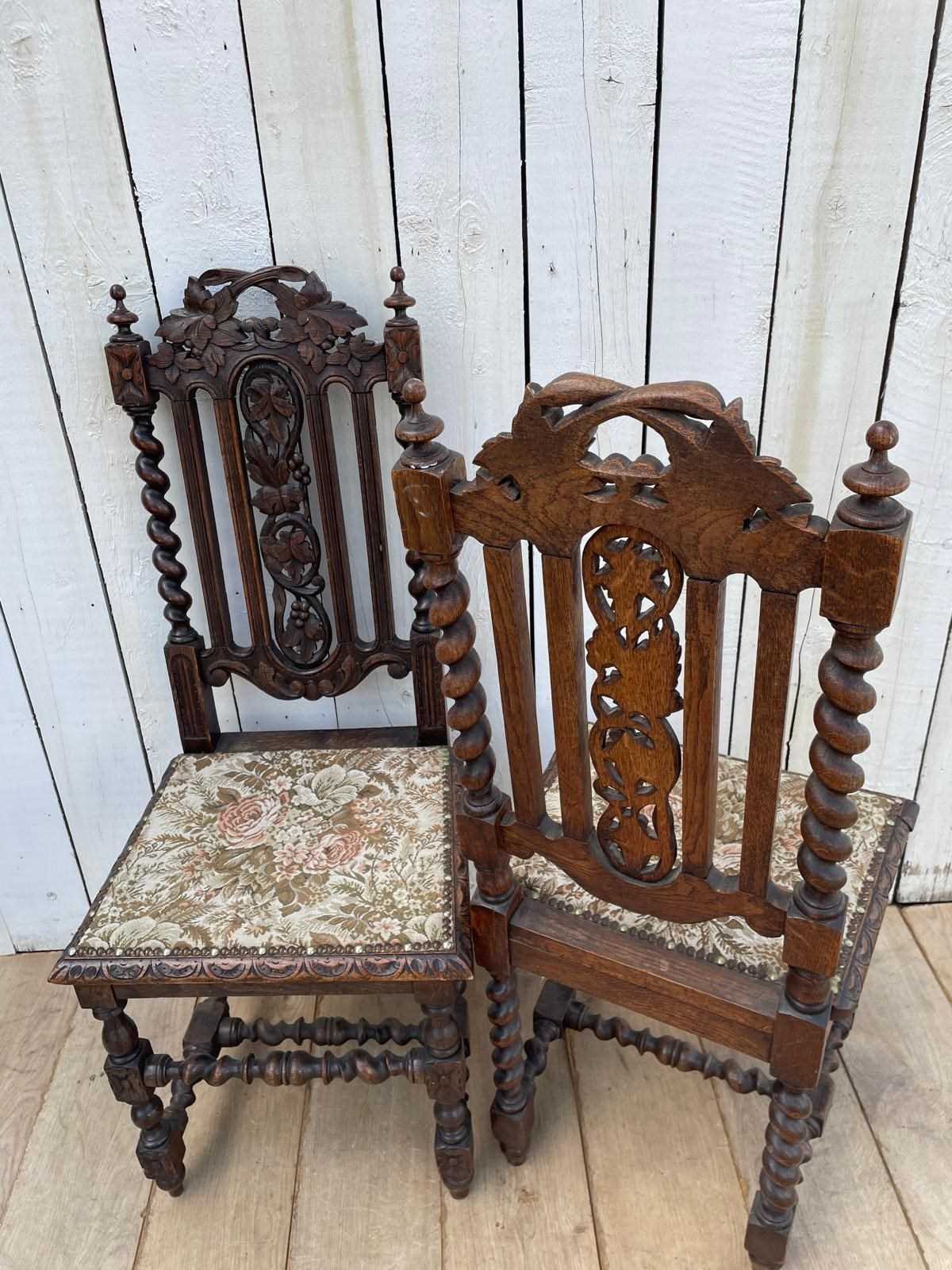In oak these ornately carved chairs have tapestry style fabric covered seats.