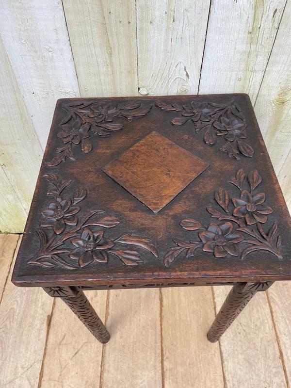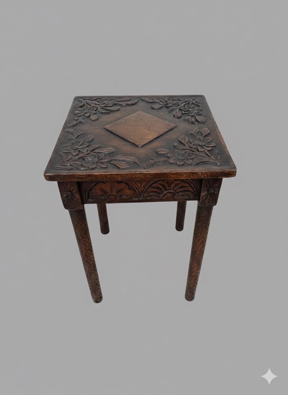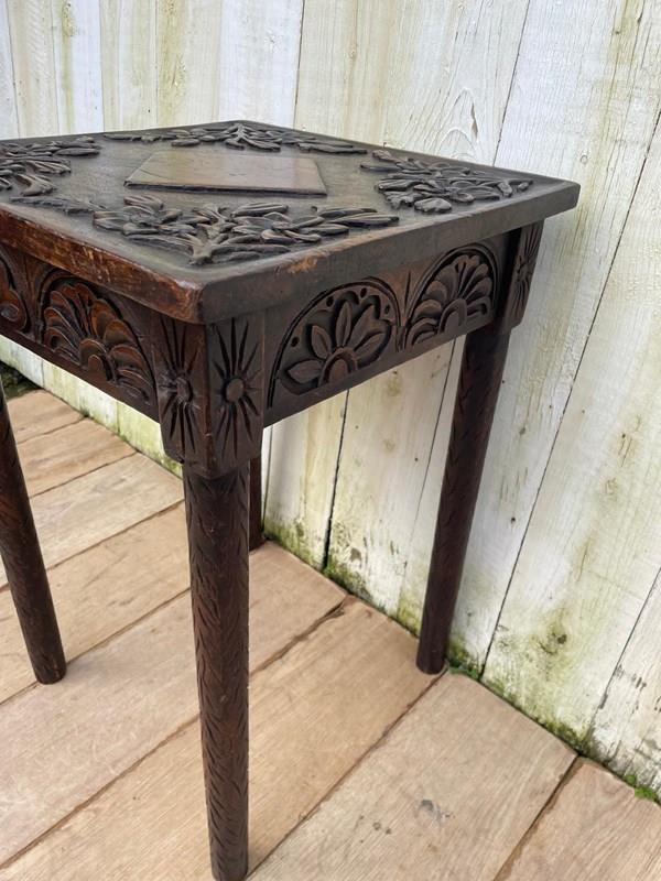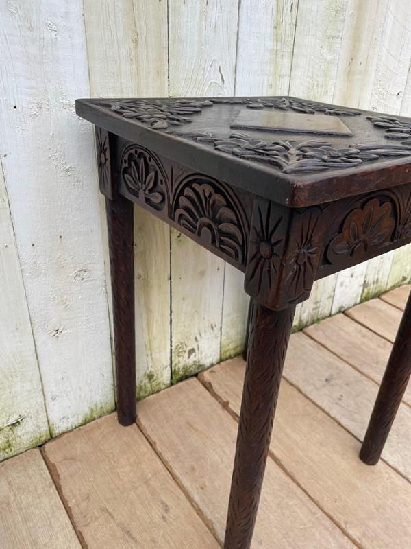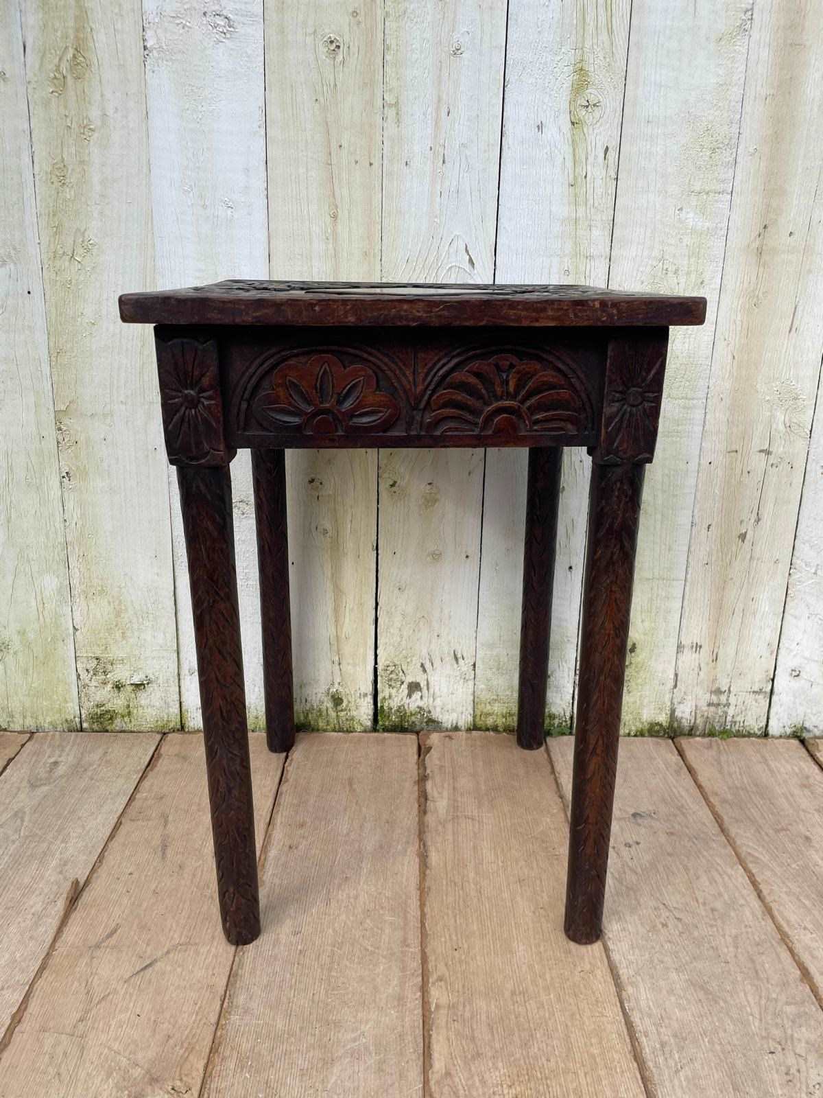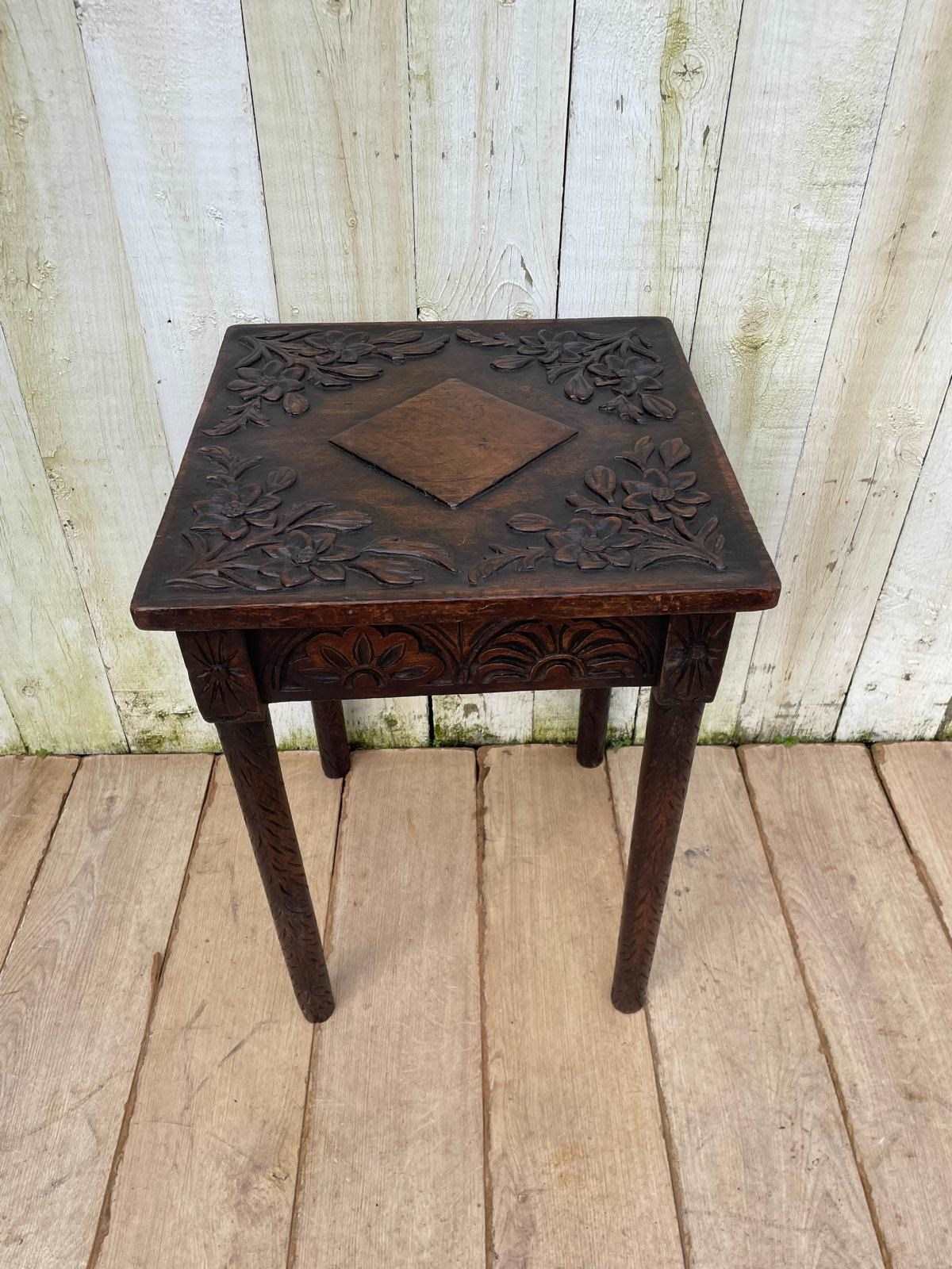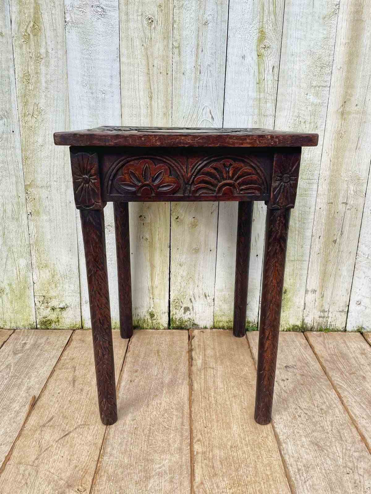 This is a beautifully carved little dark oak side table.