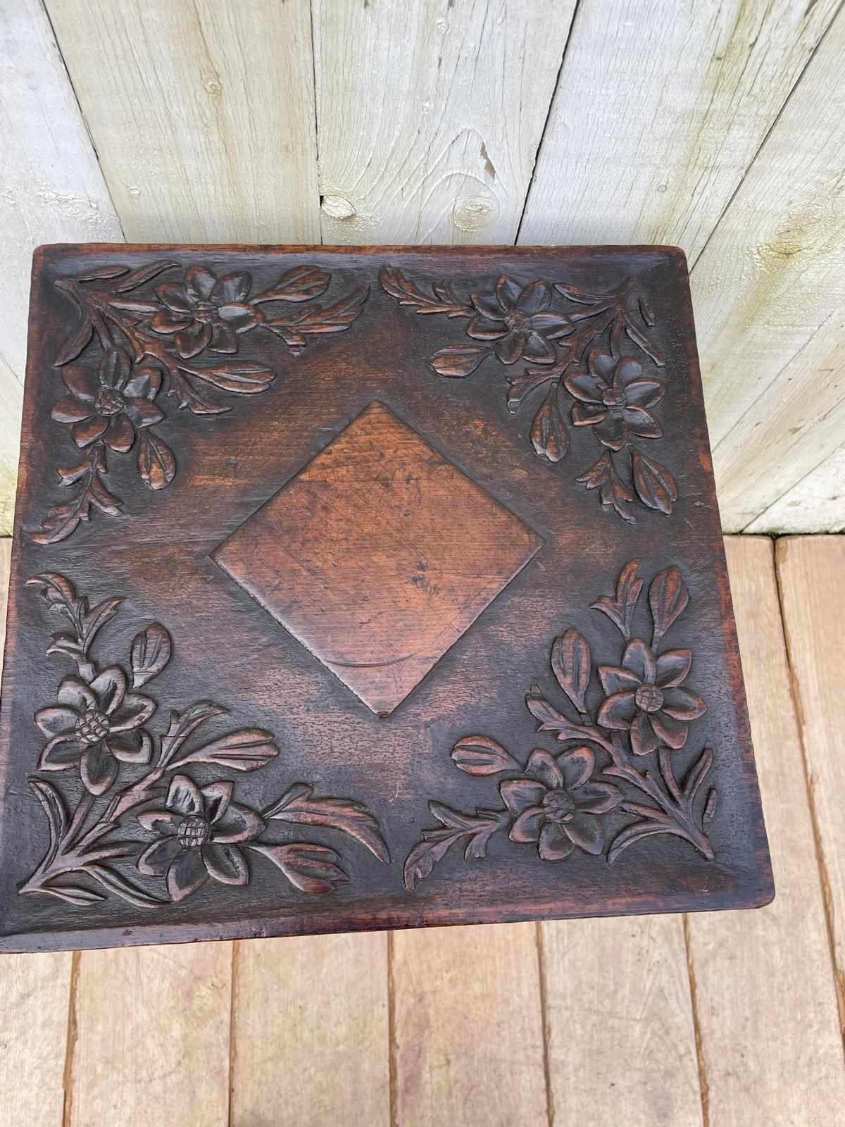 Flower carving to the top and decorative carving to sides and legs.