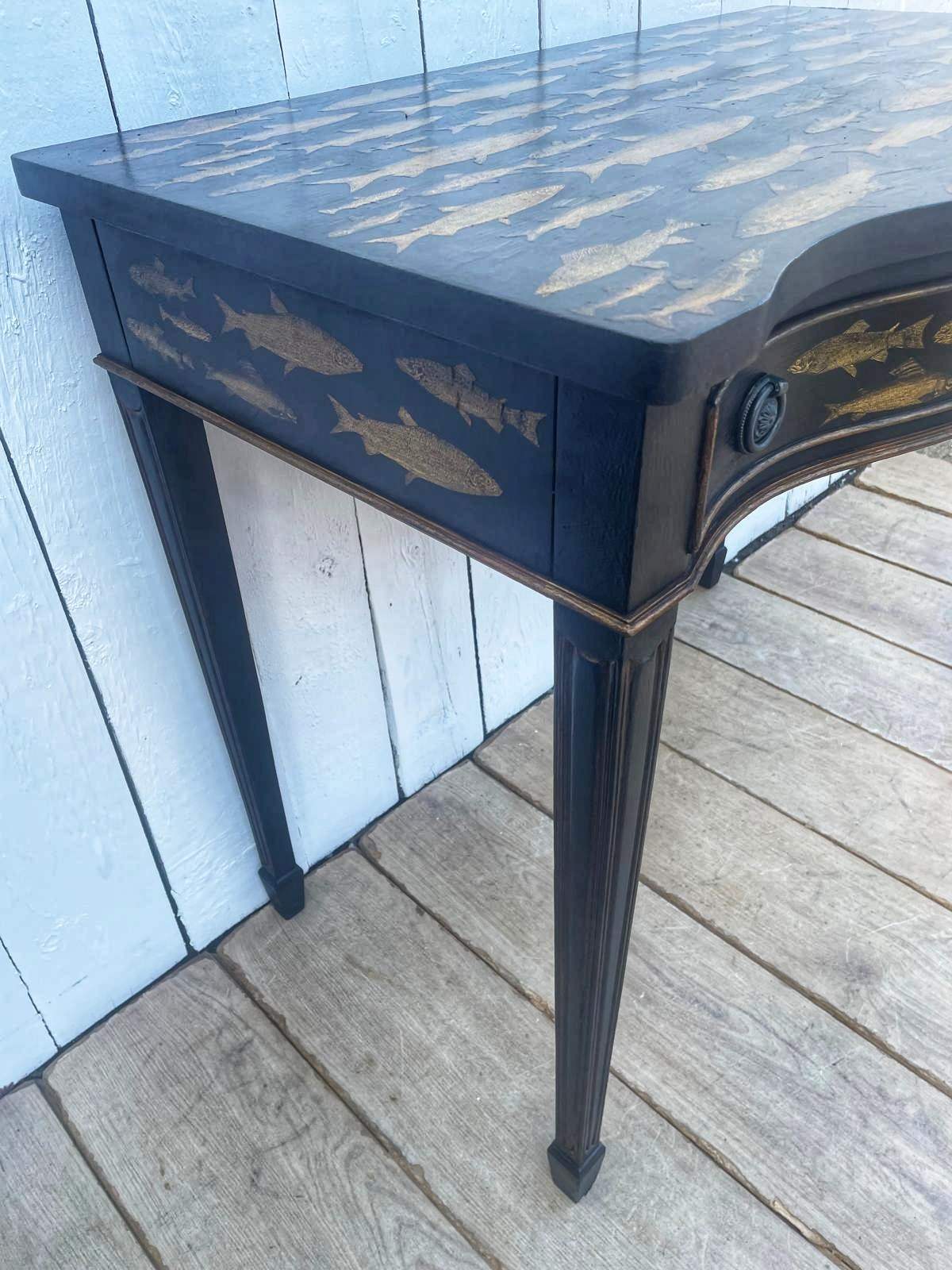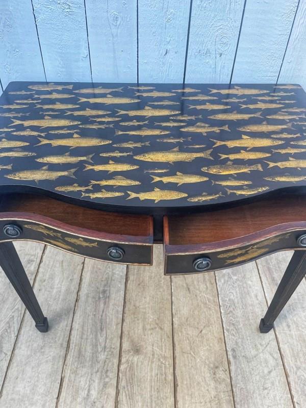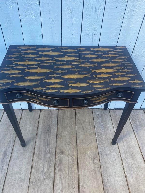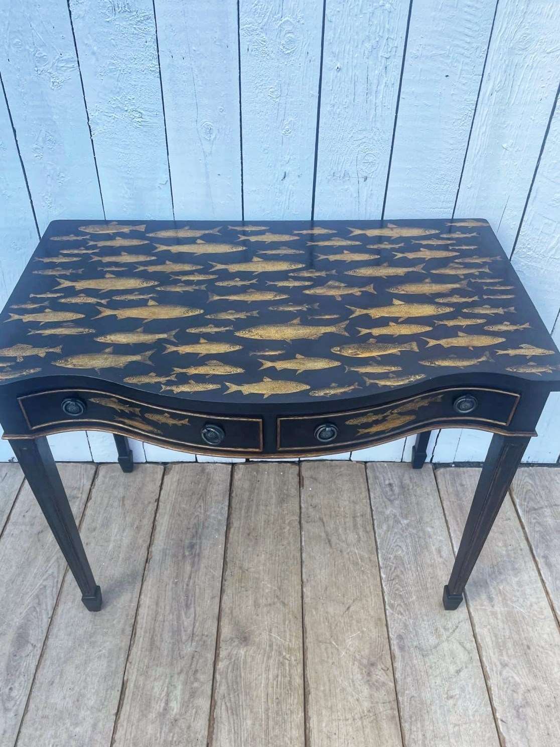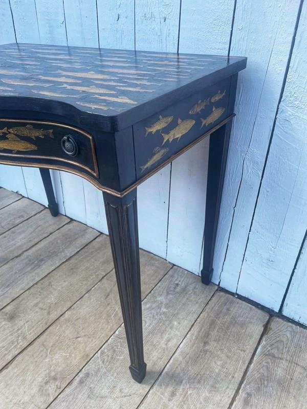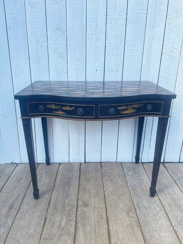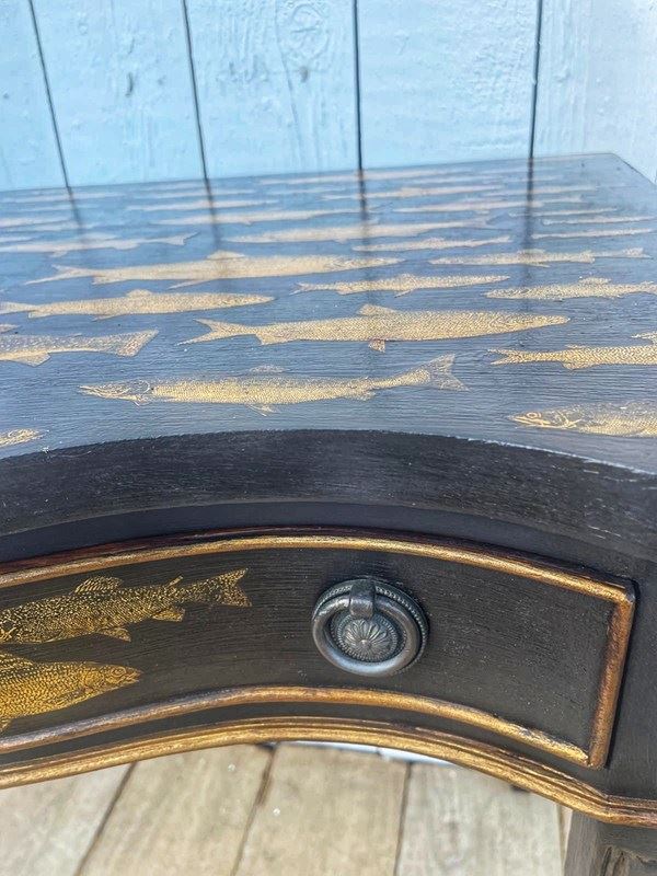 Later painted black with gilt highlights and decorated with fish decoupage.