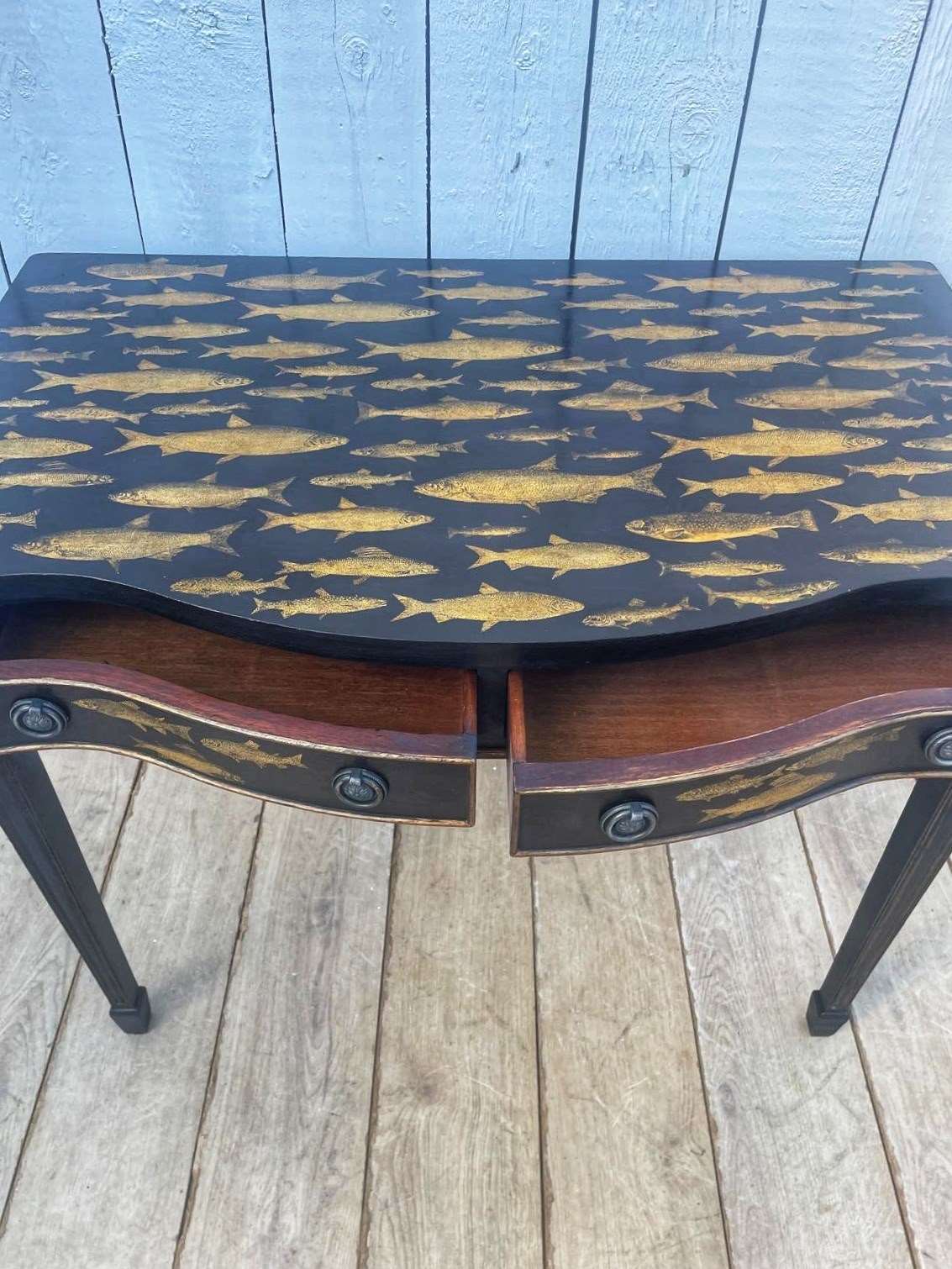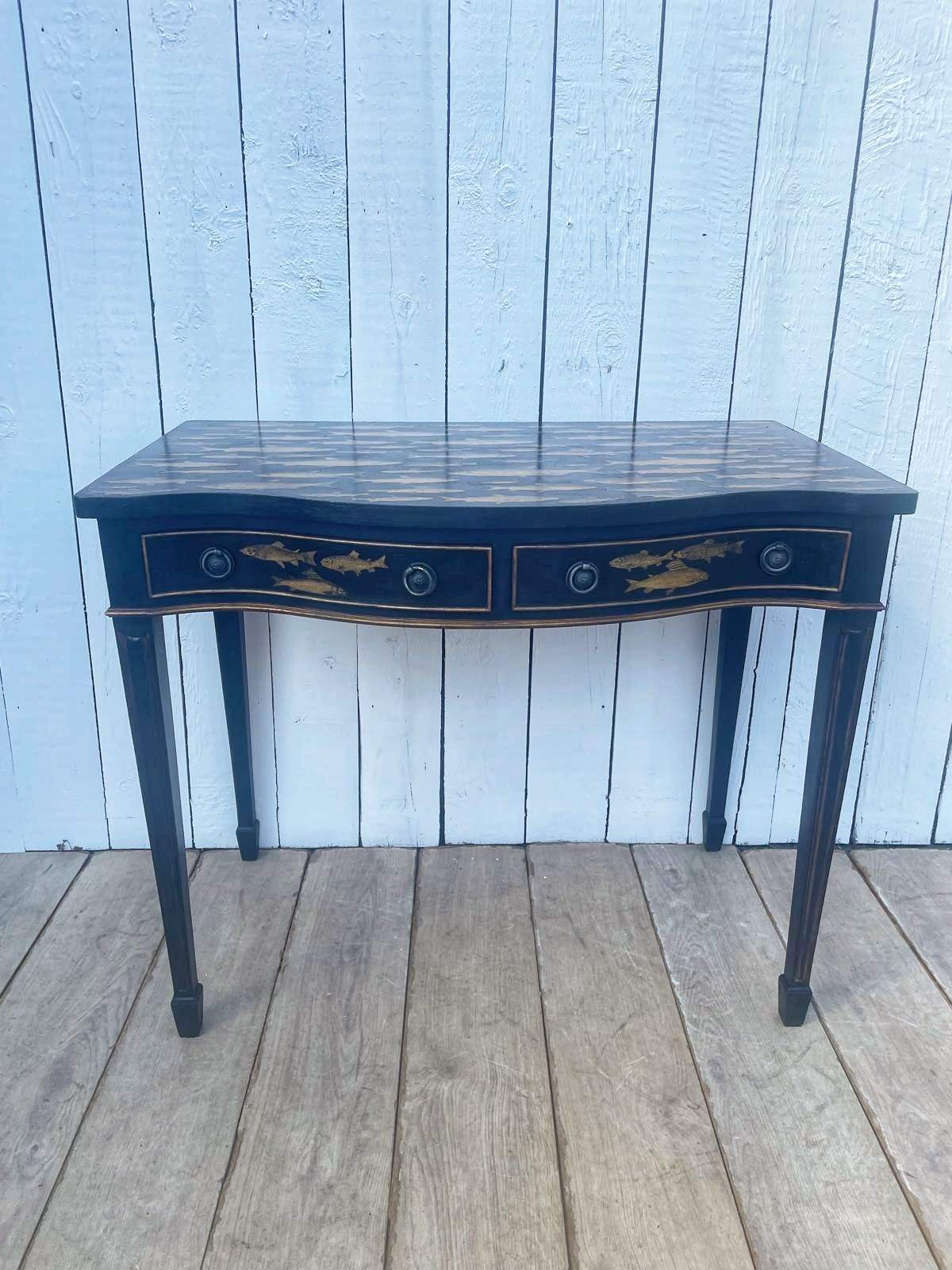 The table is a pretty shape with elegant legs and two drawers with original handles.