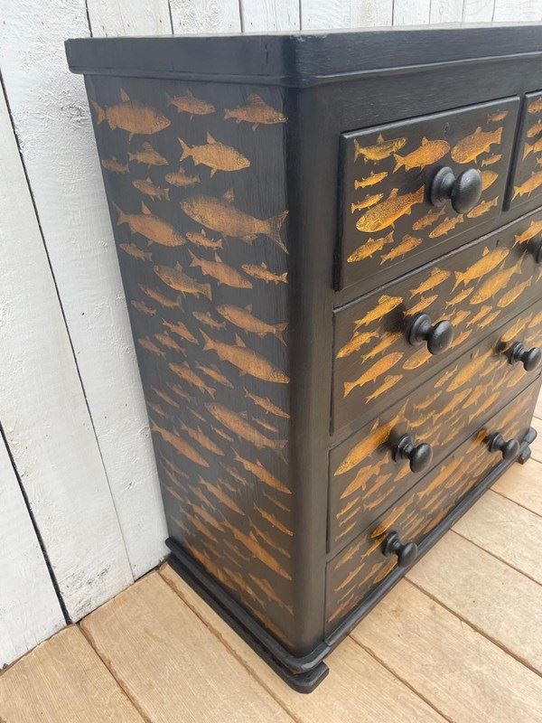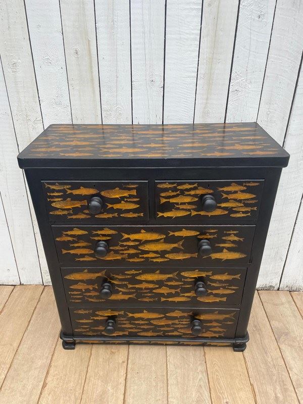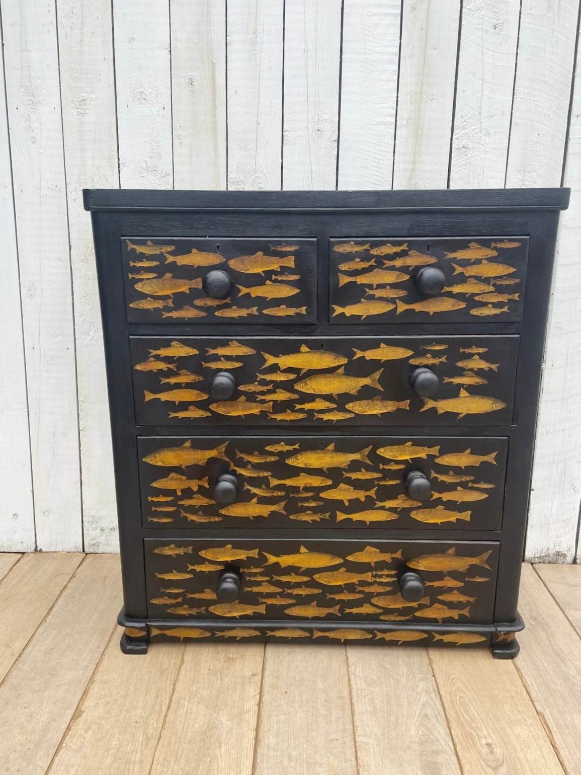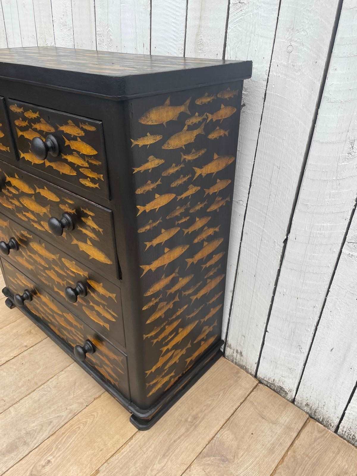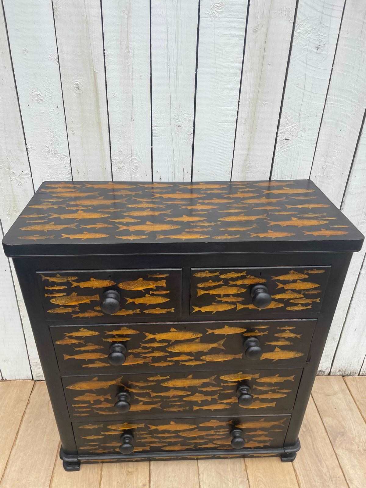 An English Victorian mahogany chest of drawers later painted and decorated.