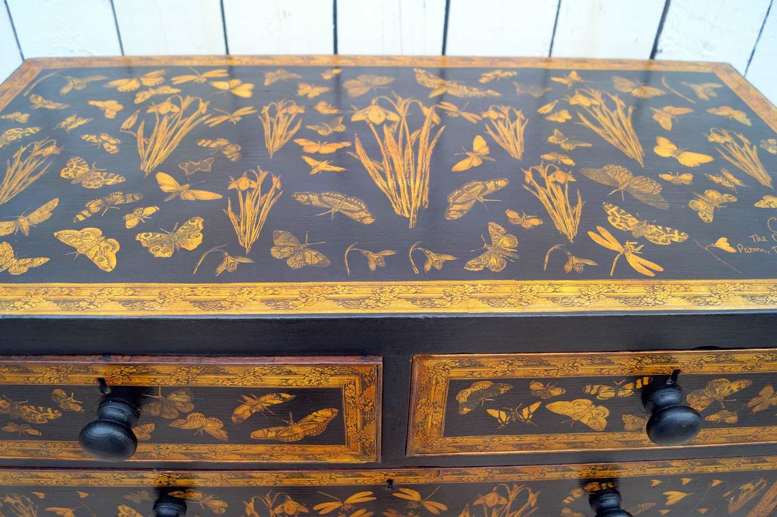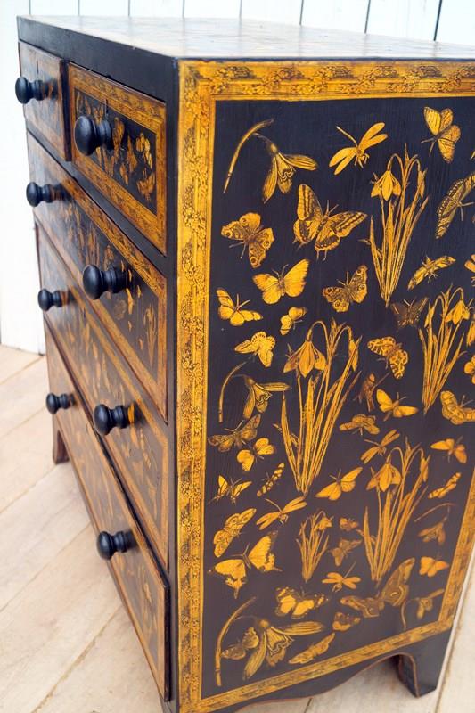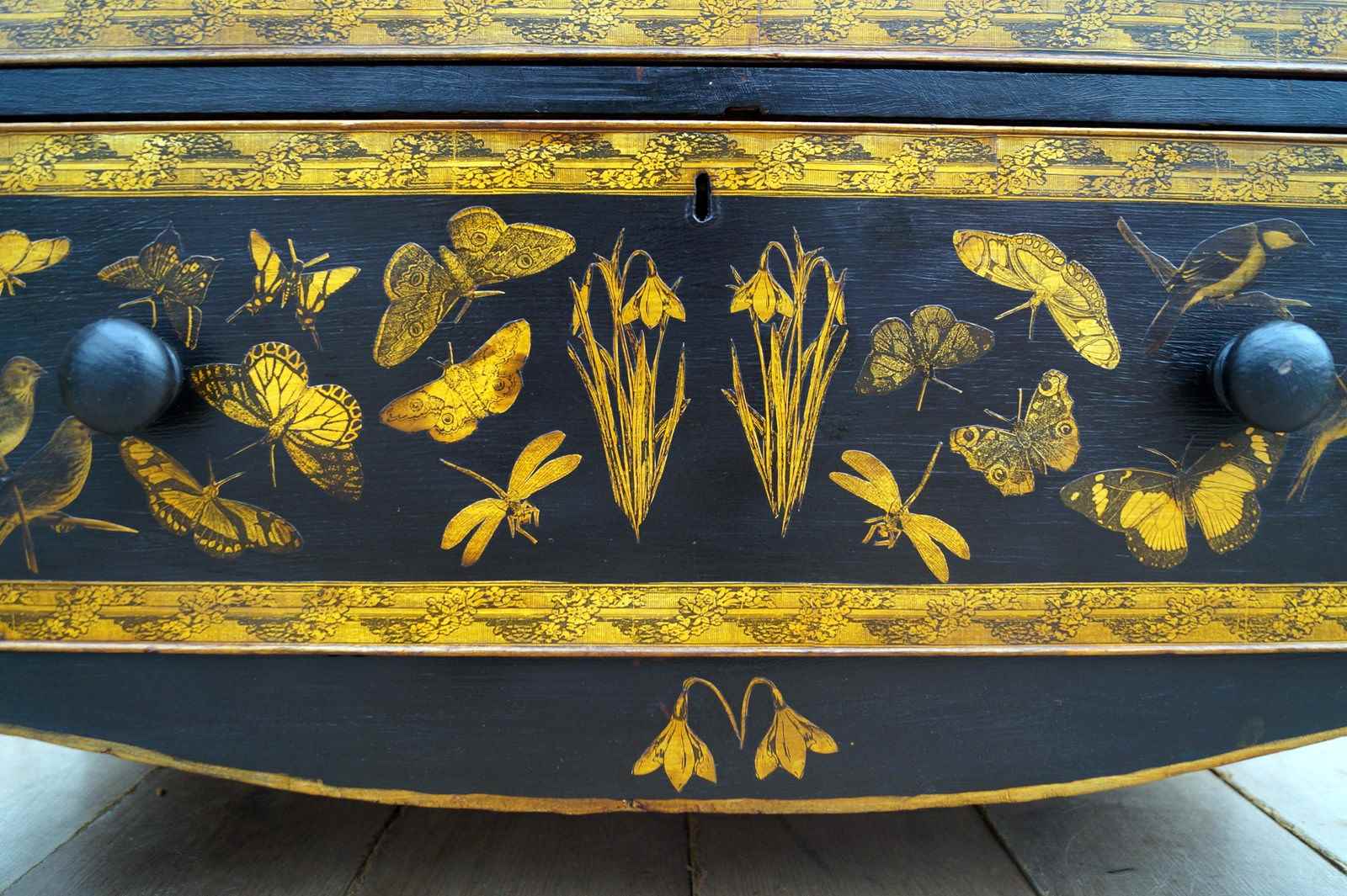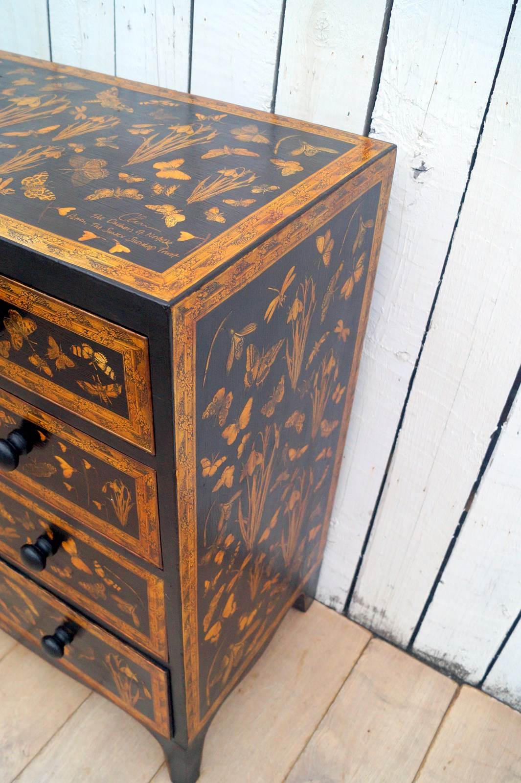 We paint, decorate with decoupage using 18th and 19th century images and end with a lacquer finish.