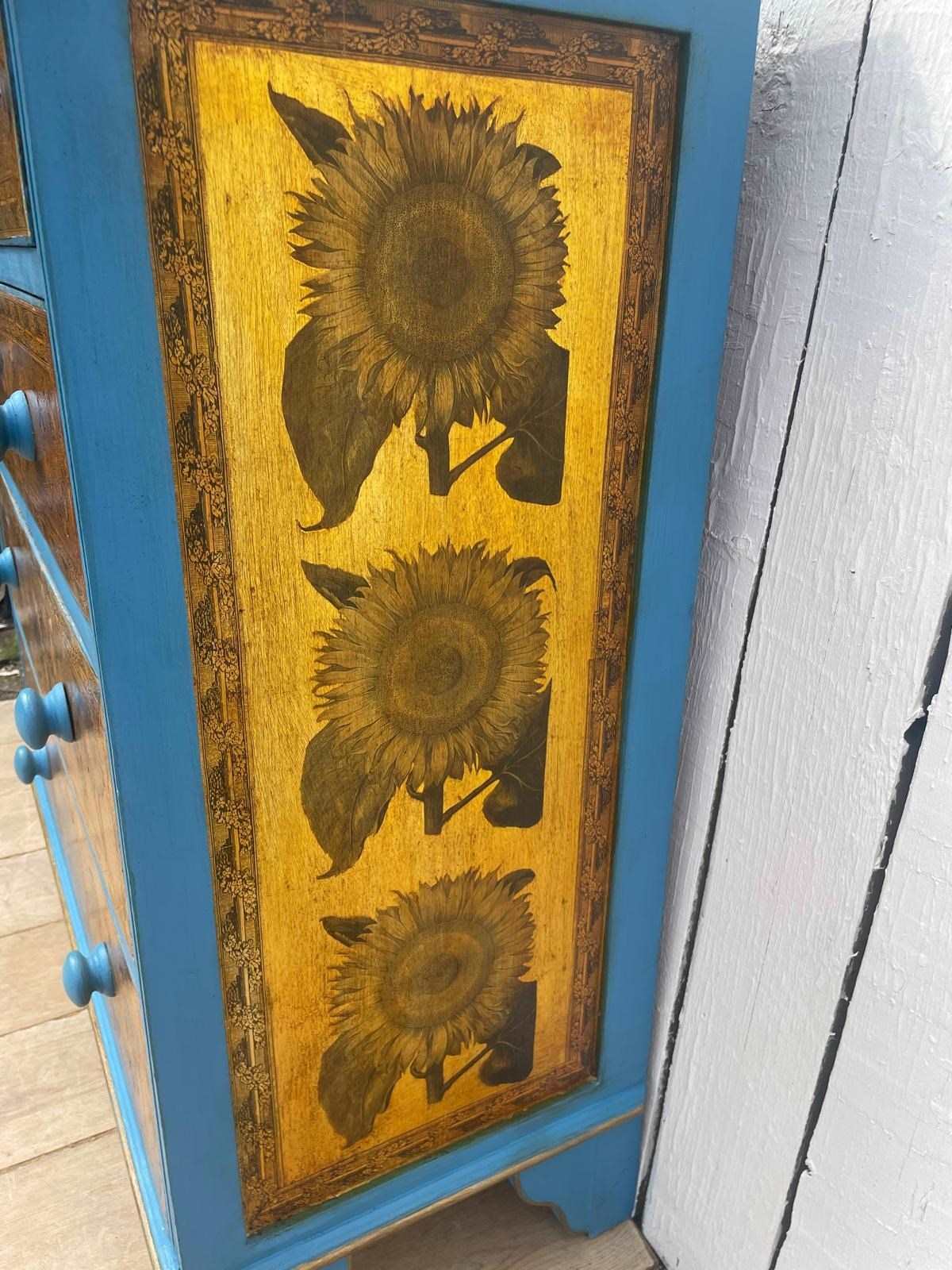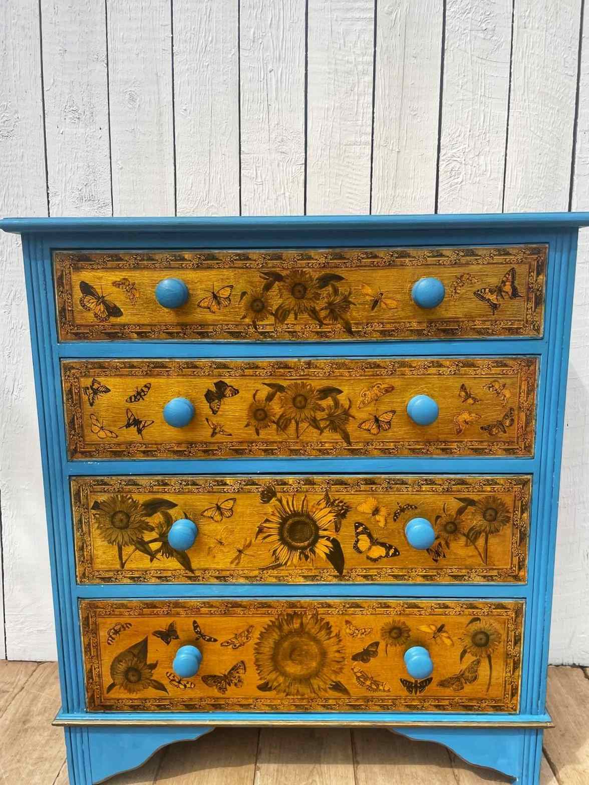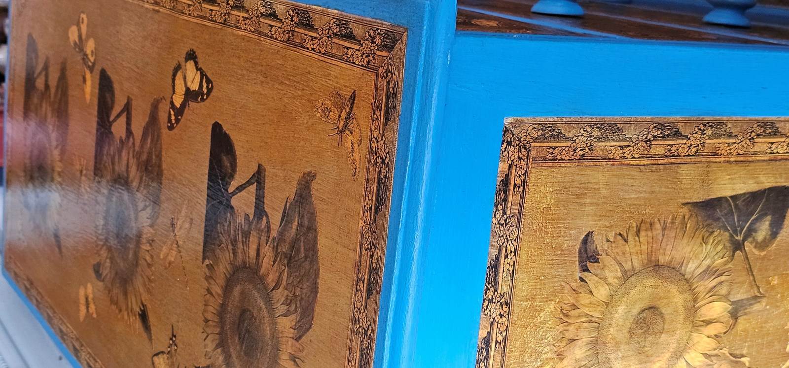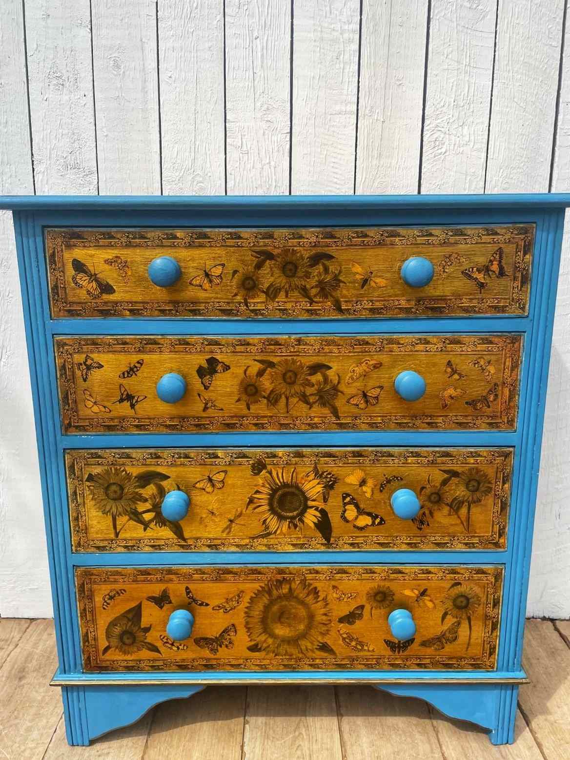 Decorated with decoupage using sunflowers, butterflies and dragonflies and a flower border.