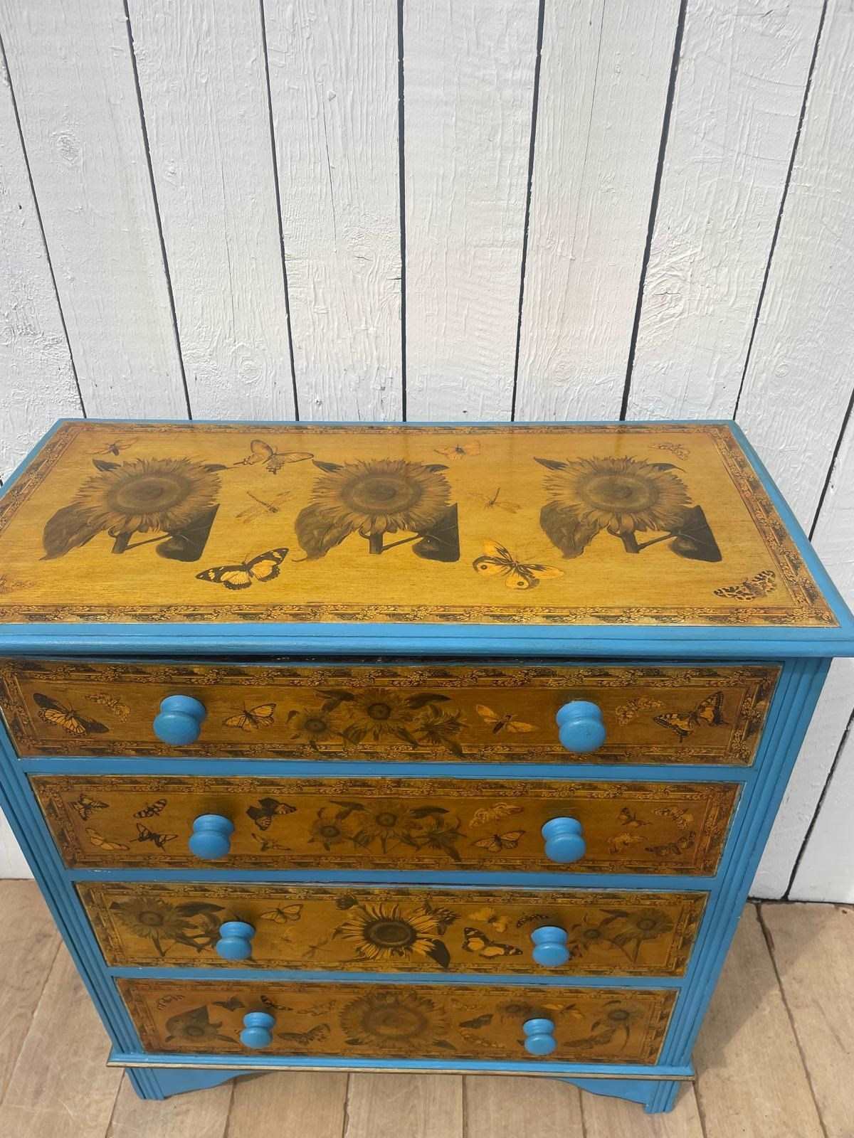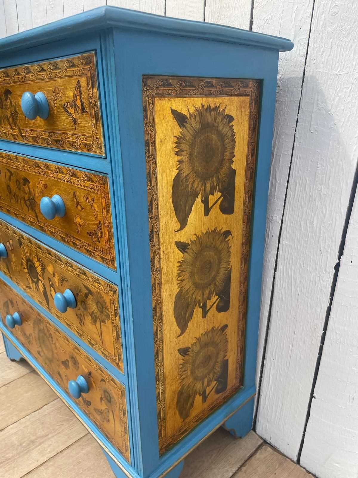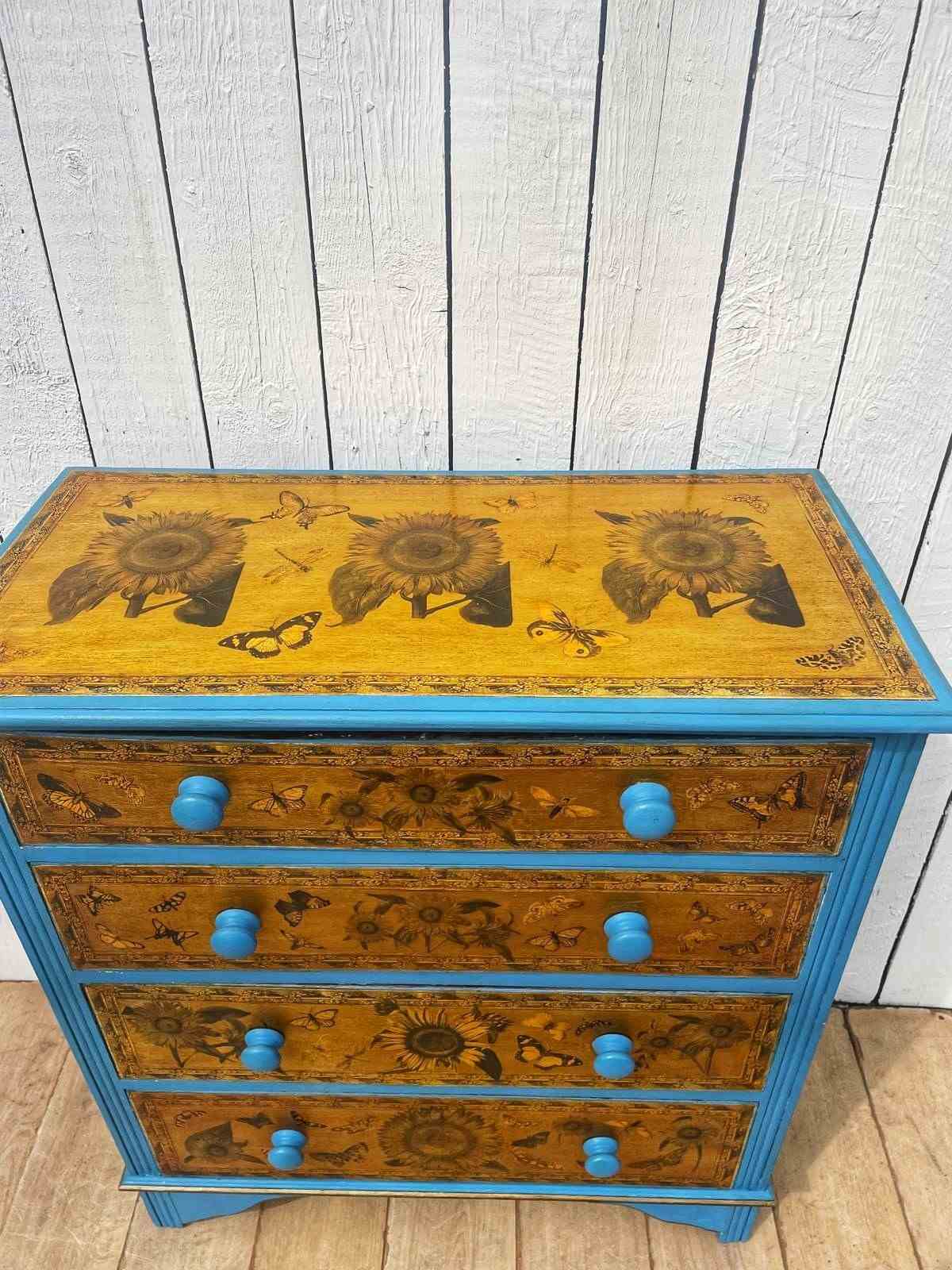 Decorated with decoupage using sunflowers, butterflies and dragonflies and a flower border.