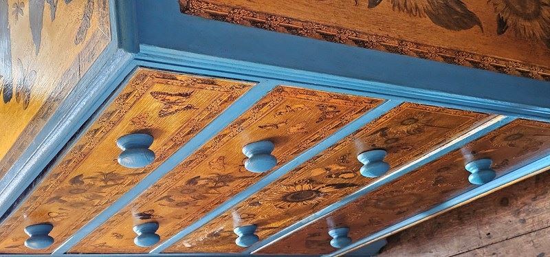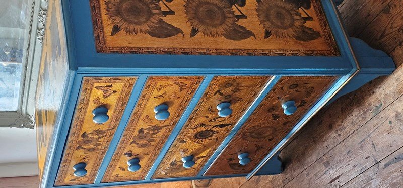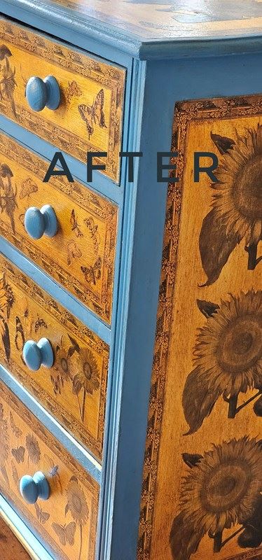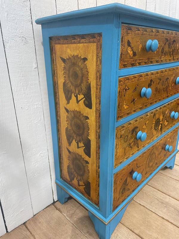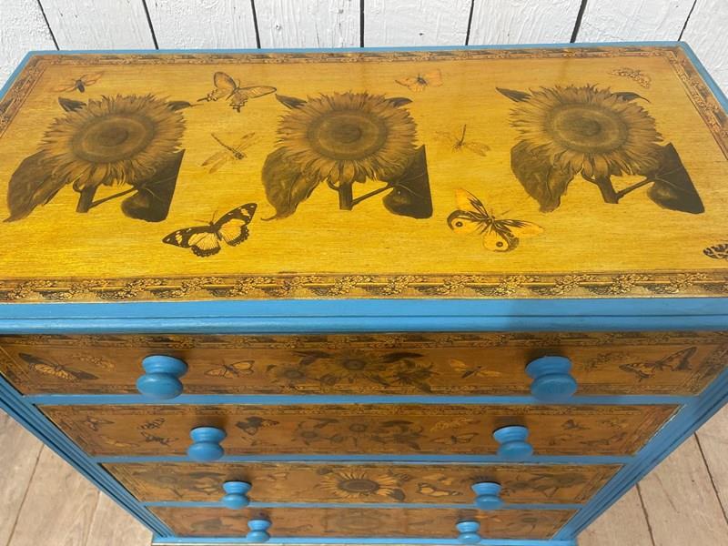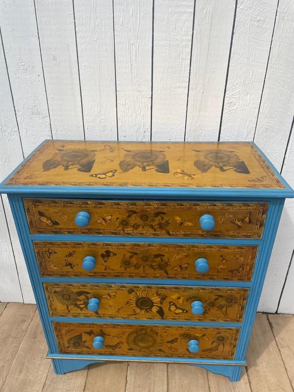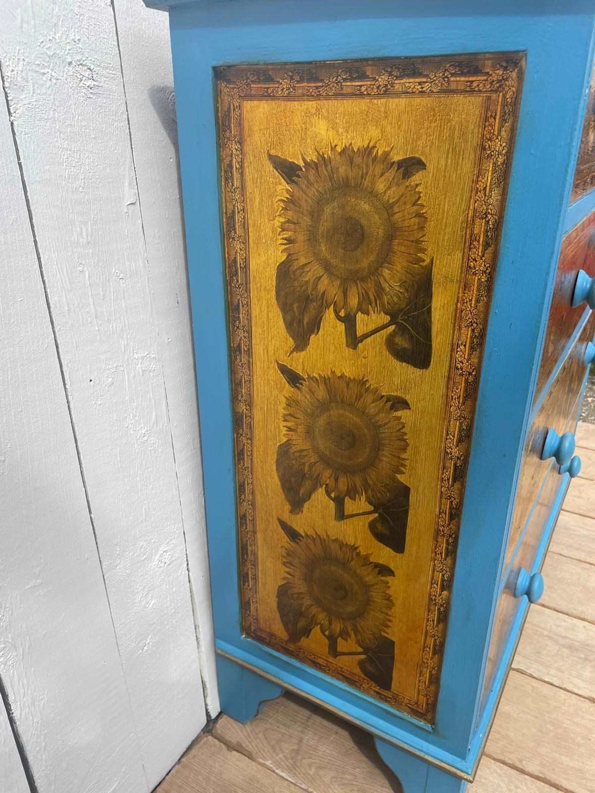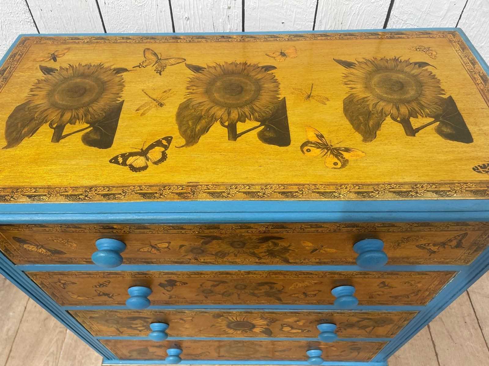 Decorated with decoupage using sunflowers, butterflies and dragonflies and a flower border.
