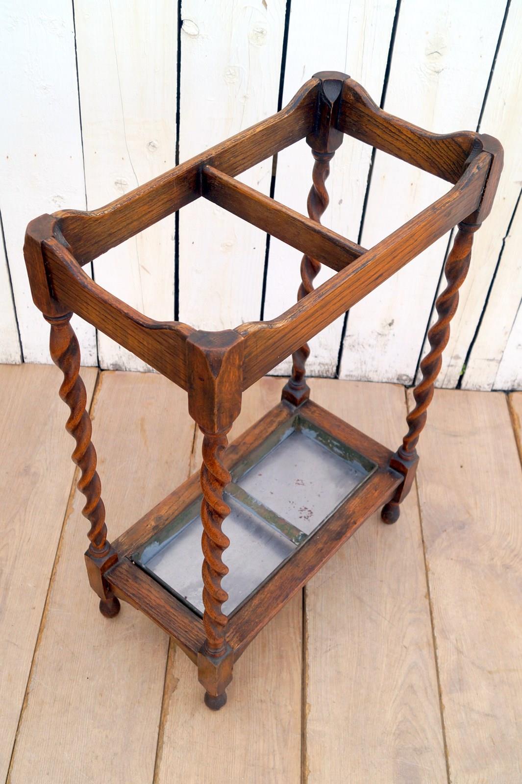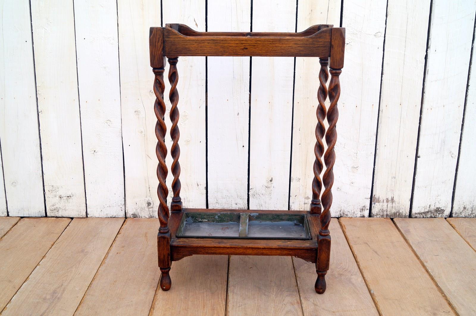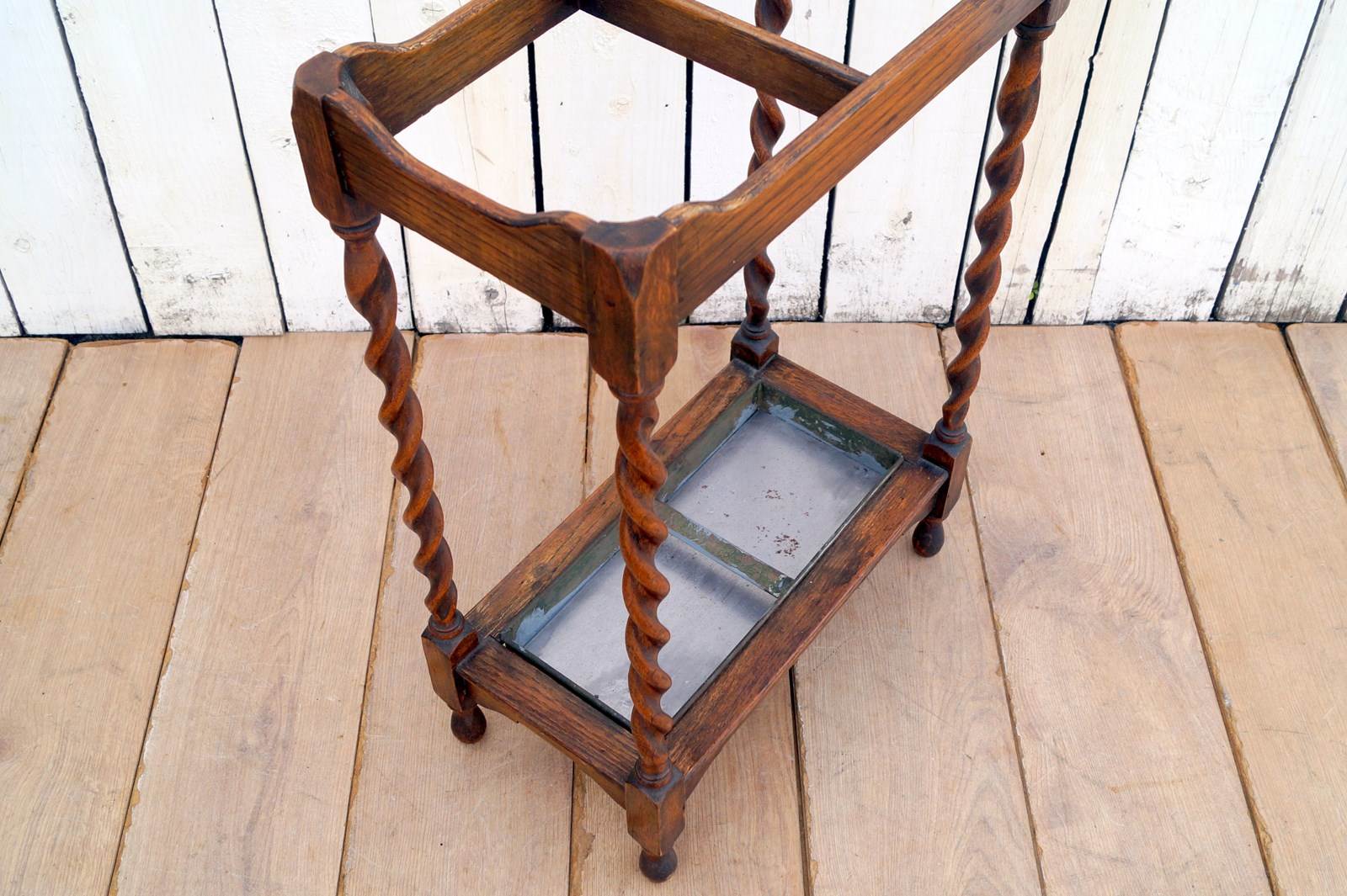 An English arts and crafts oak stick/ umbrella stand with metal drip trays.