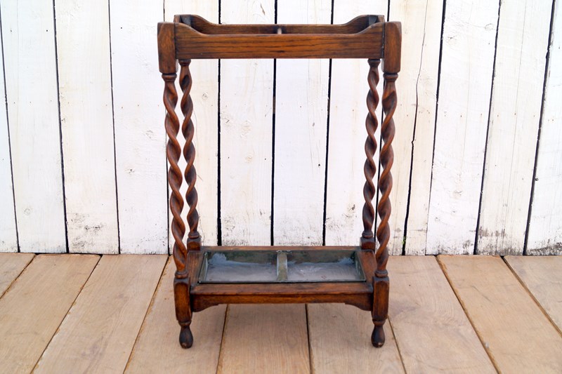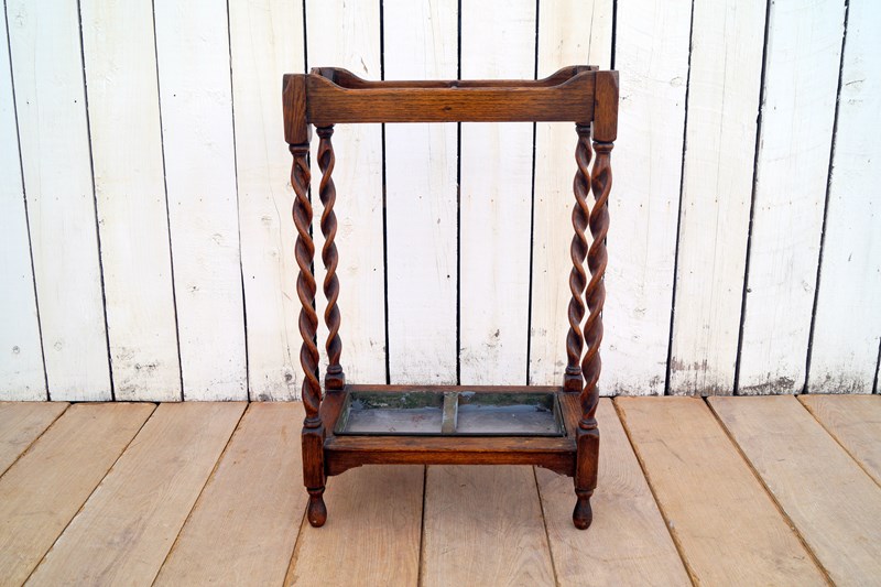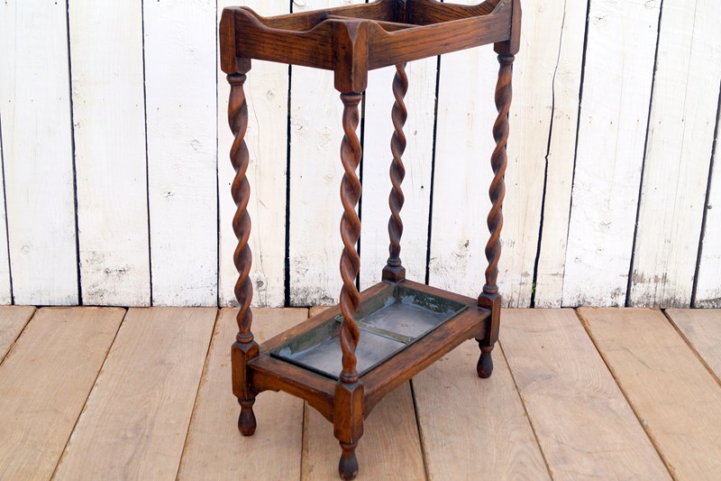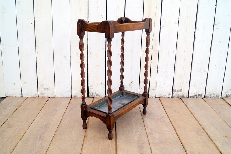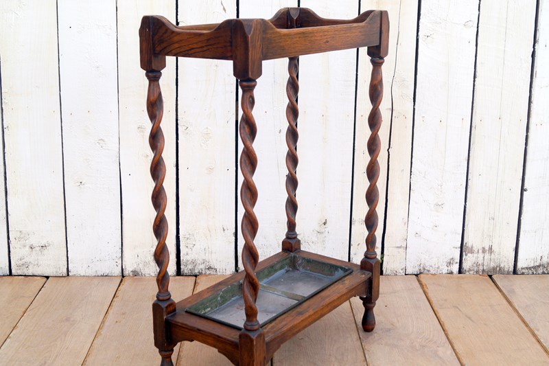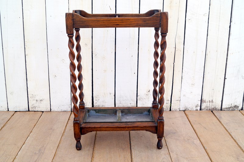 An English arts and crafts oak stick/ umbrella stand with metal drip trays.