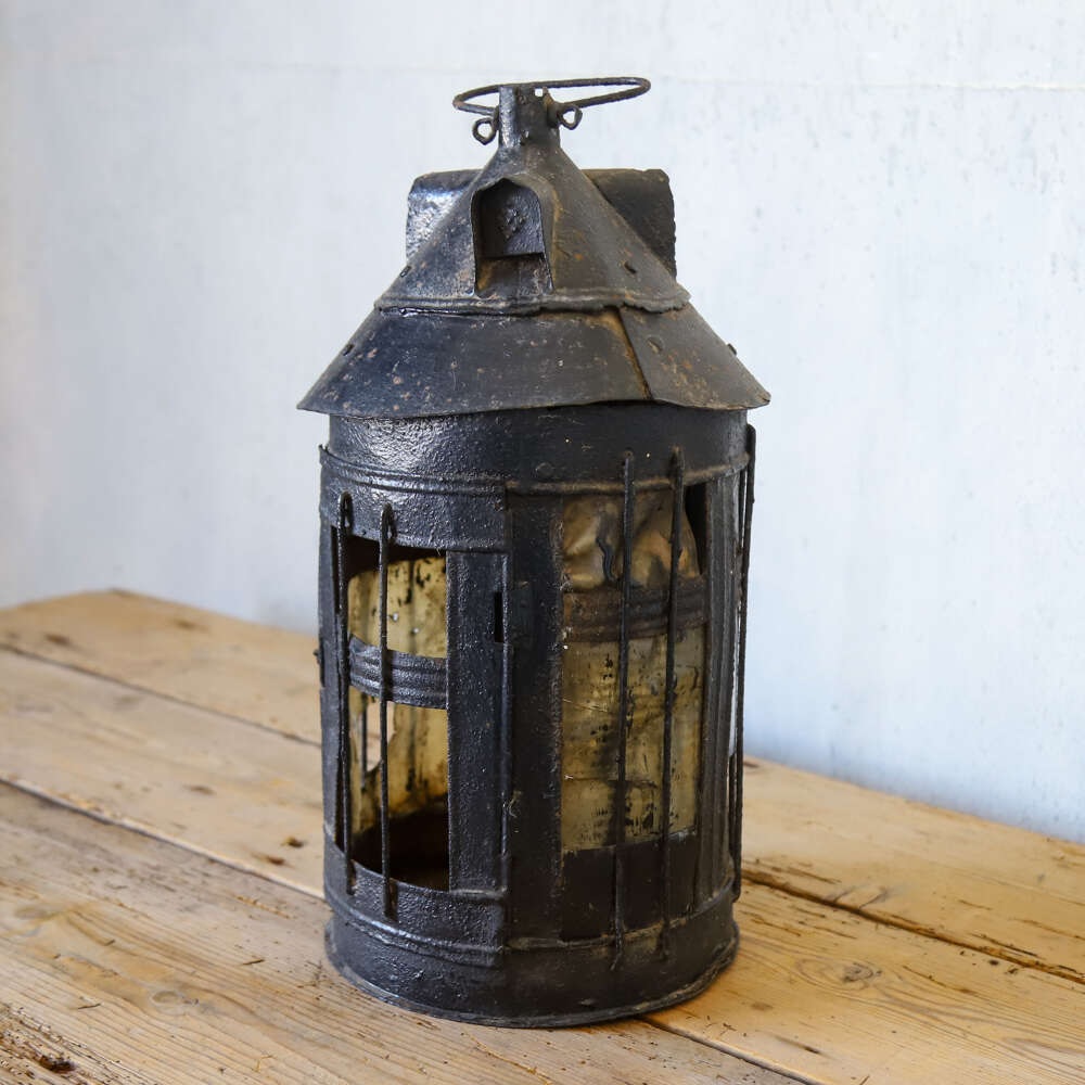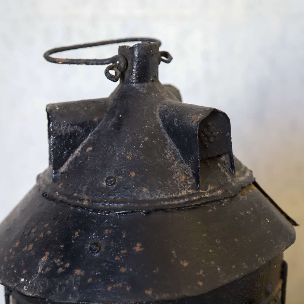 This example, tall and striking at 50 cm, retains remarkable originality. Some horn or mica panels are cracked, missing, or overpainted, yet the lamp has been left untouched, preserving its integrity as a piece of authentic working history.