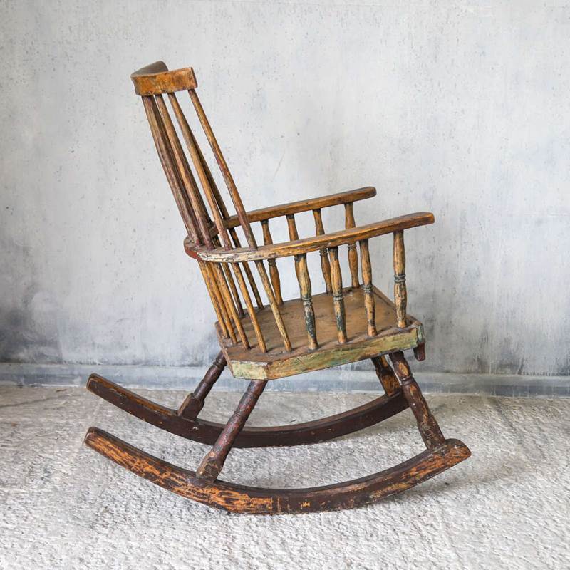 With its sturdy proportions and gentle rocking form, this chair embodies both the rustic utility and simple elegance of 19th-century rural craftsmanship.