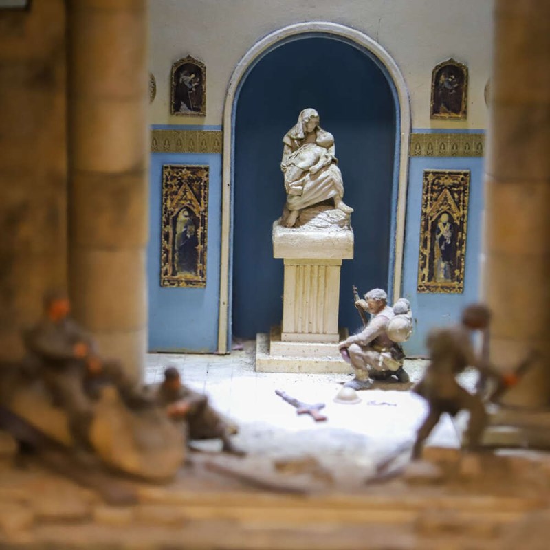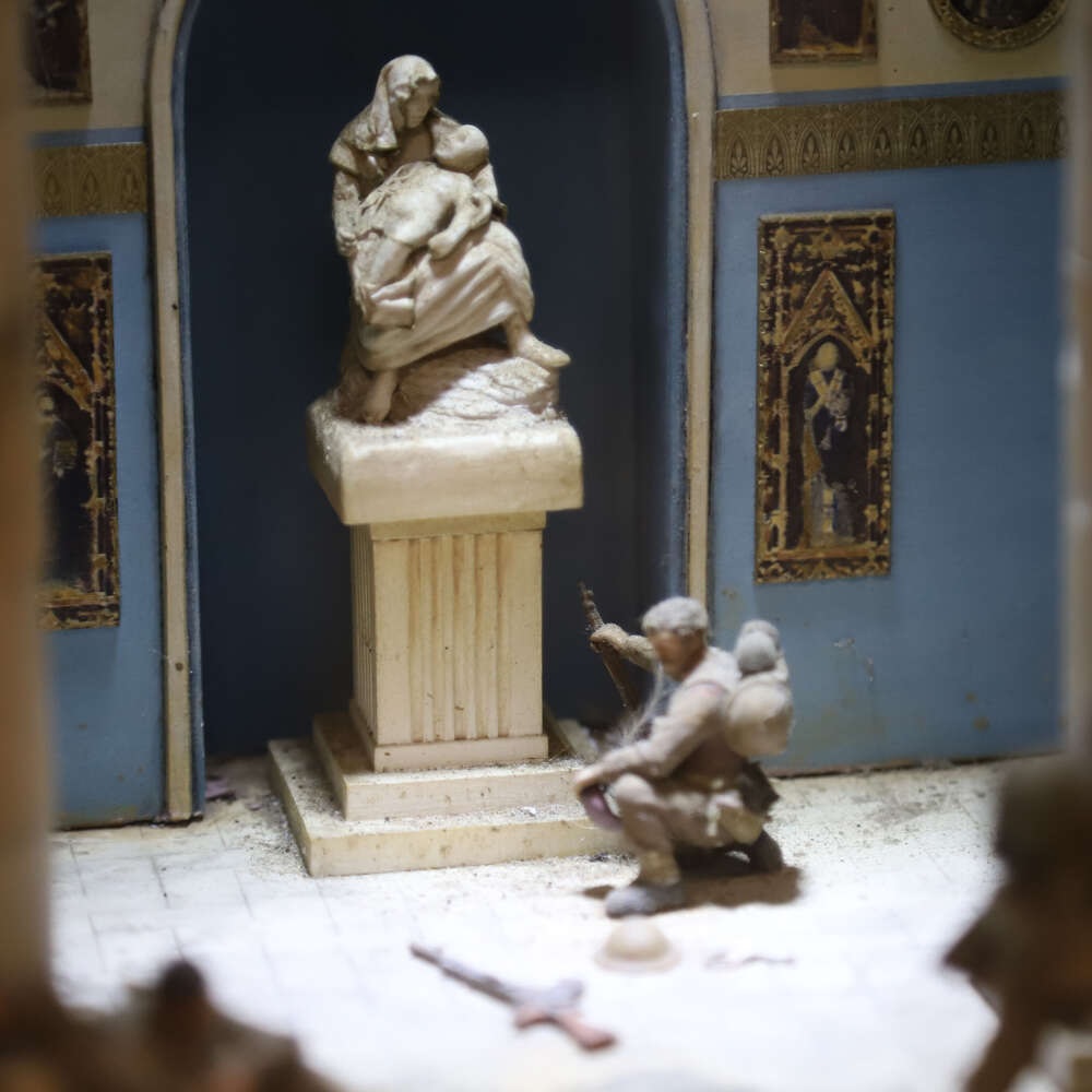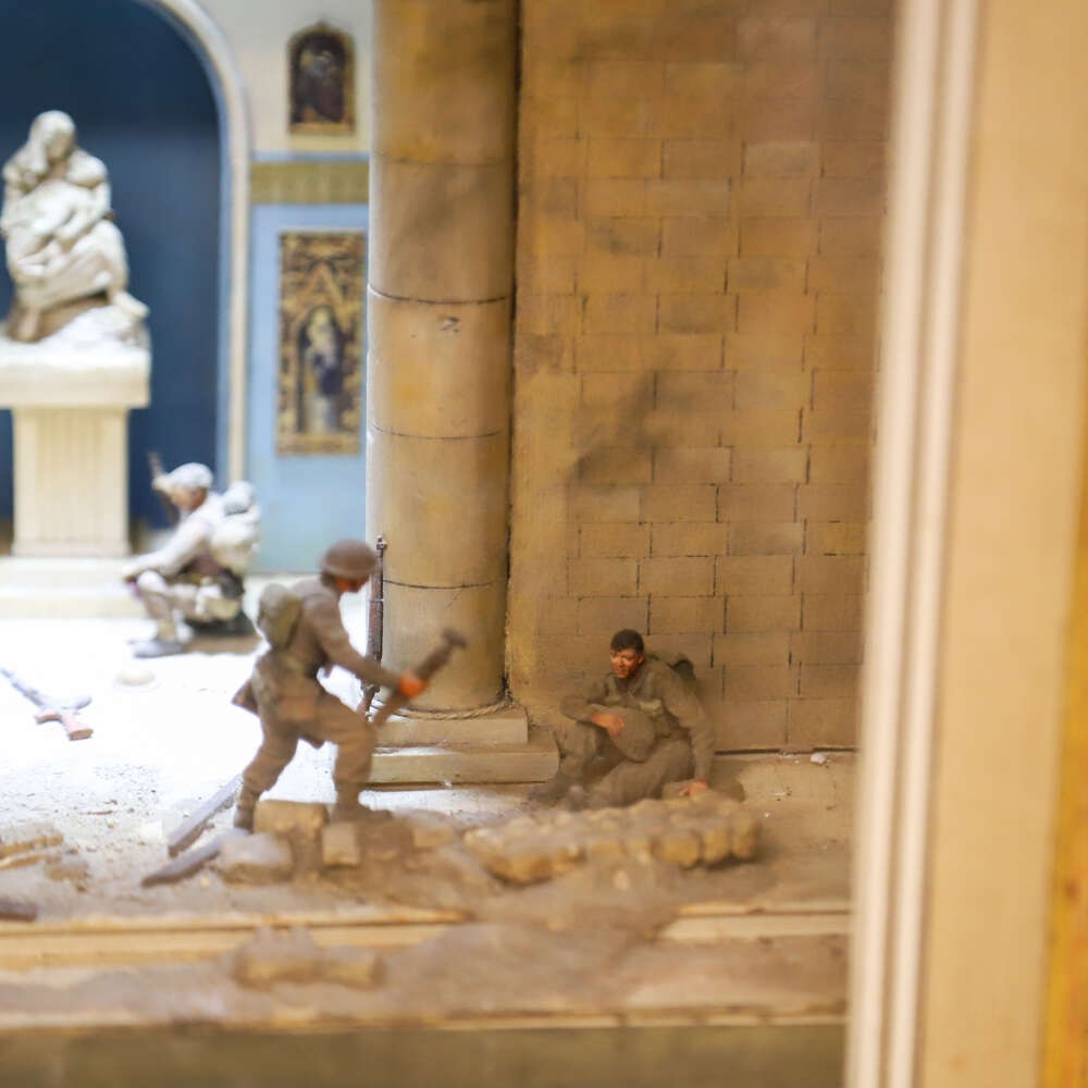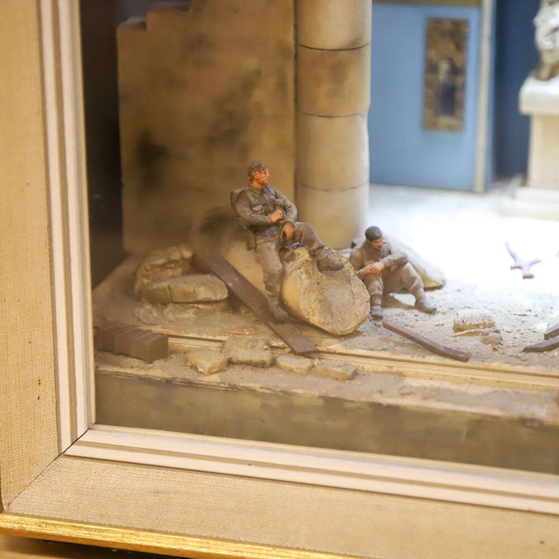 Diorama depicting a poignant scene of WWII British soldiers at rest, sheltering in Church ruins