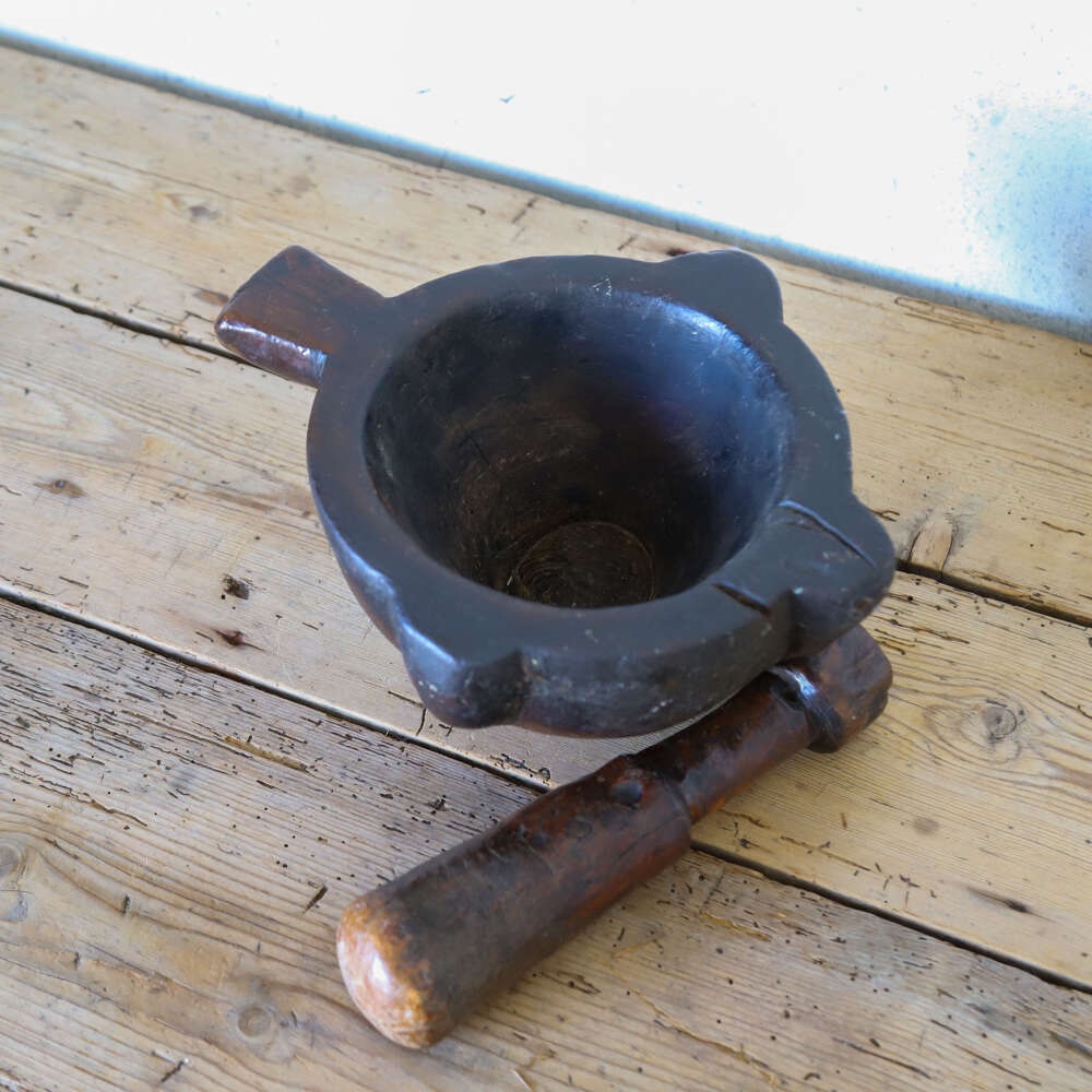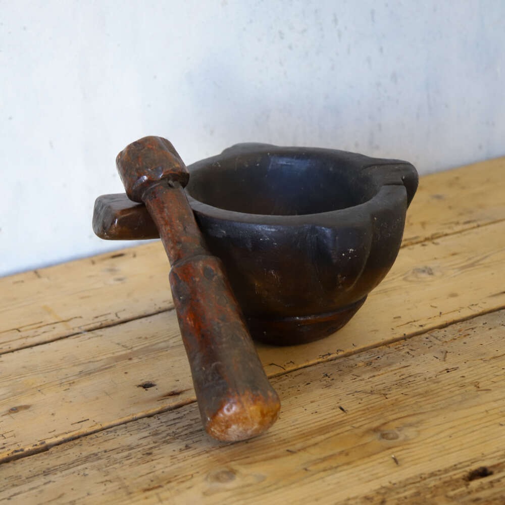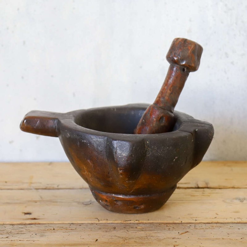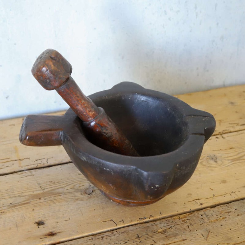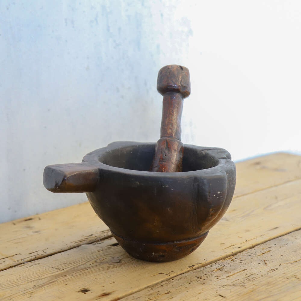 An exceptional late 18th century pestle and mortar, finely crafted from mixed hardwoods. This substantial piece possesses a wonderfully rich, time-worn patina, developed through more than two centuries of use and handling. Its surface bears the gentle marks of age, offering both authenticity and a depth of character that only centuries can impart.