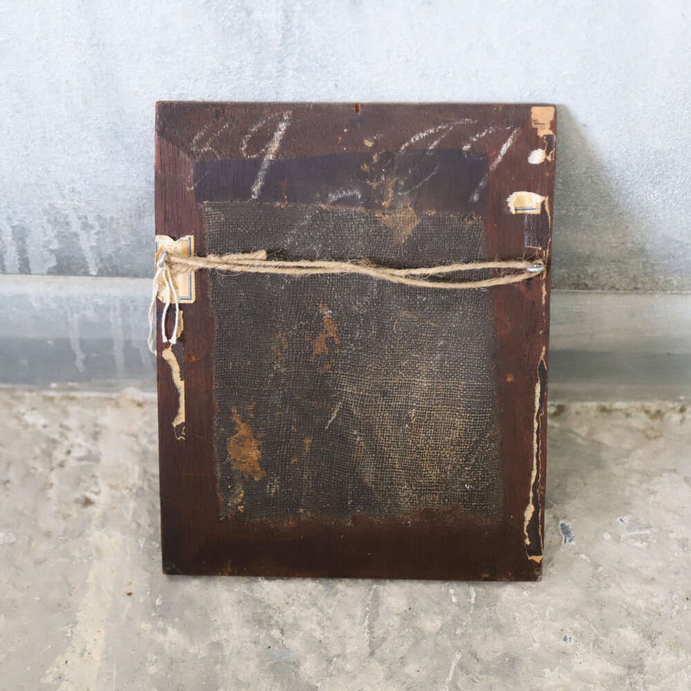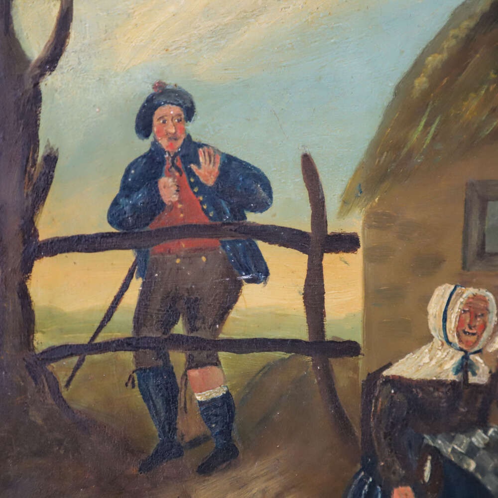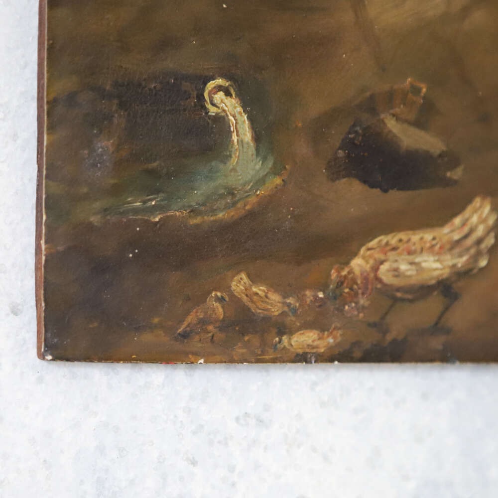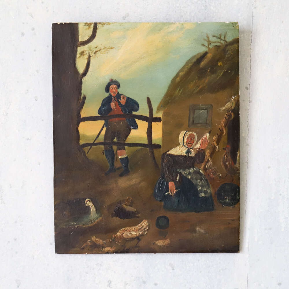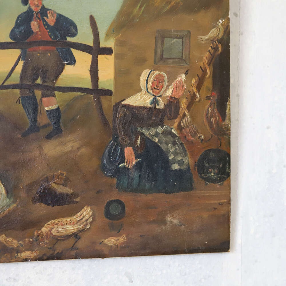 A charming small naïve painting, depicting a rural country scene of a farmer and his wife surrounded by chickens and geese. Full of character and rustic charm, this delightful work captures the simplicity of English rural life during the 19th century. The naïve style, with its straightforward composition and endearing detail, adds to its decorative appeal and makes it a wonderful piece for collectors and those with a love of pastoral art.