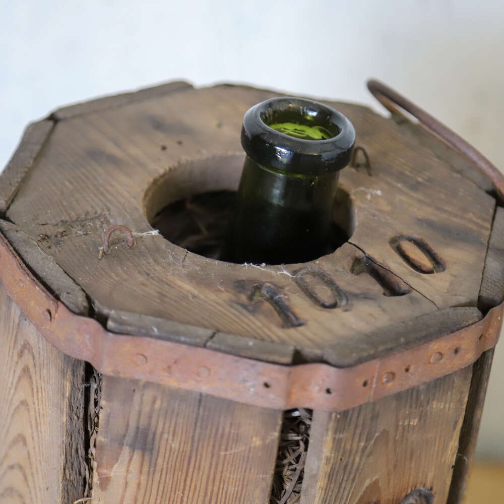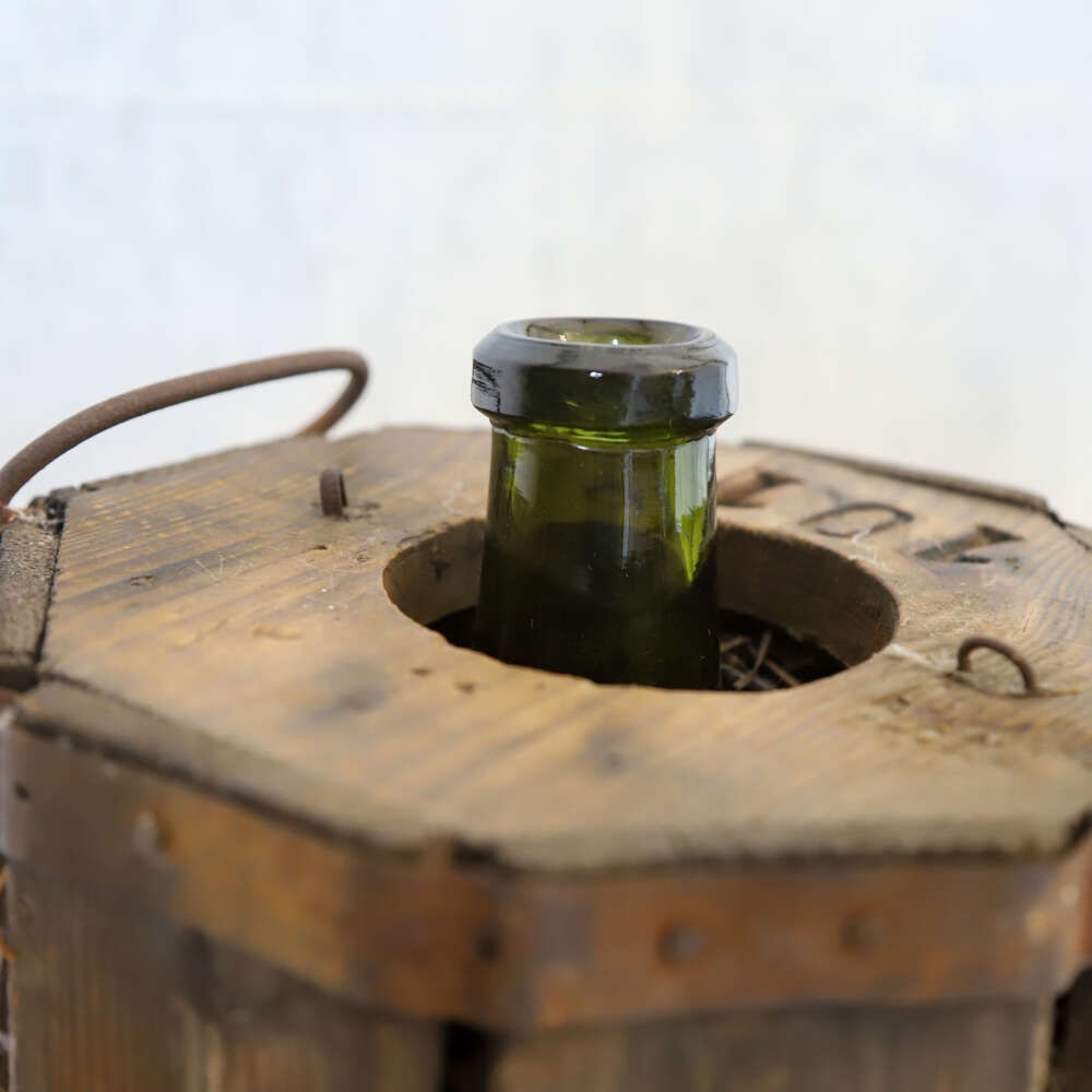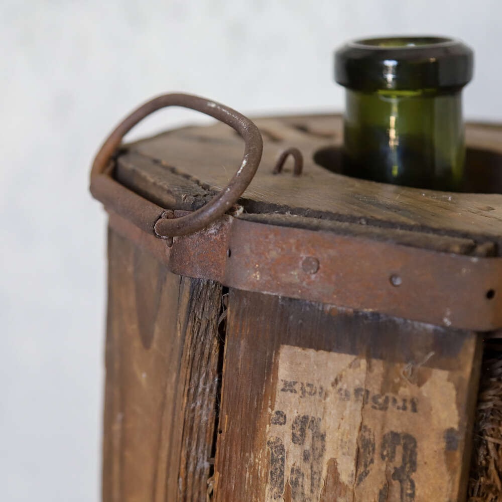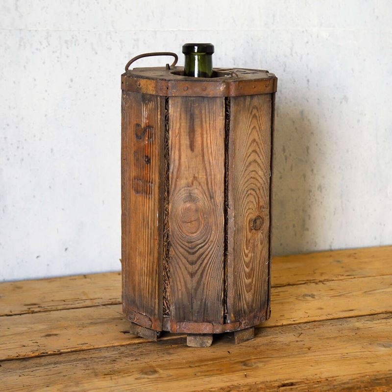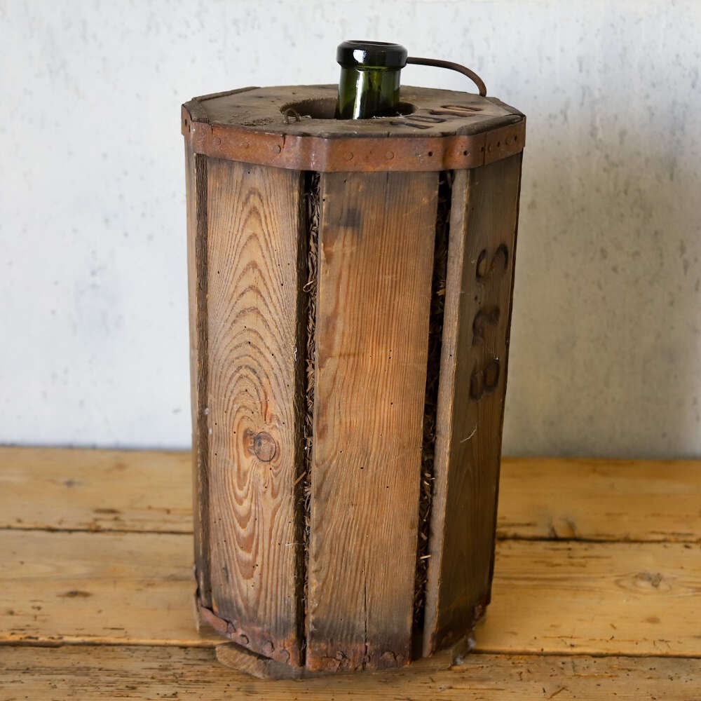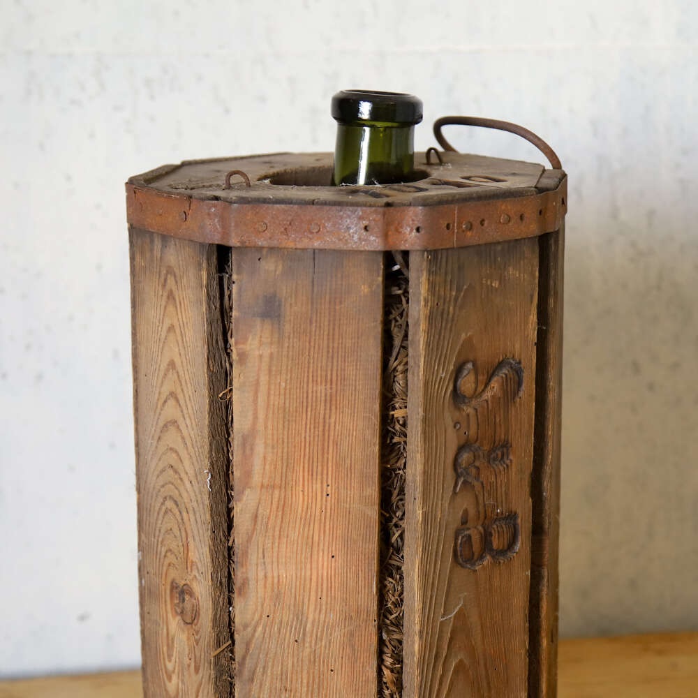 A highly unusual and decorative early 20th century French vineyard bottle decanter, encased within a wooden frame and insulated with straw. The wooden outer casing is stencilled with the vineyard’s sign and number, offering both charm and provenance. A fine piece of rustic vineyard history, it displays beautifully and makes a distinctive addition to any interior.