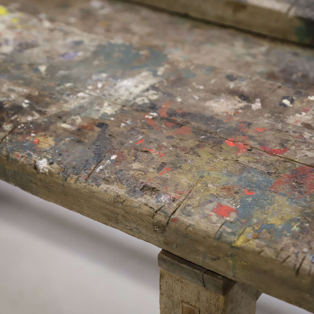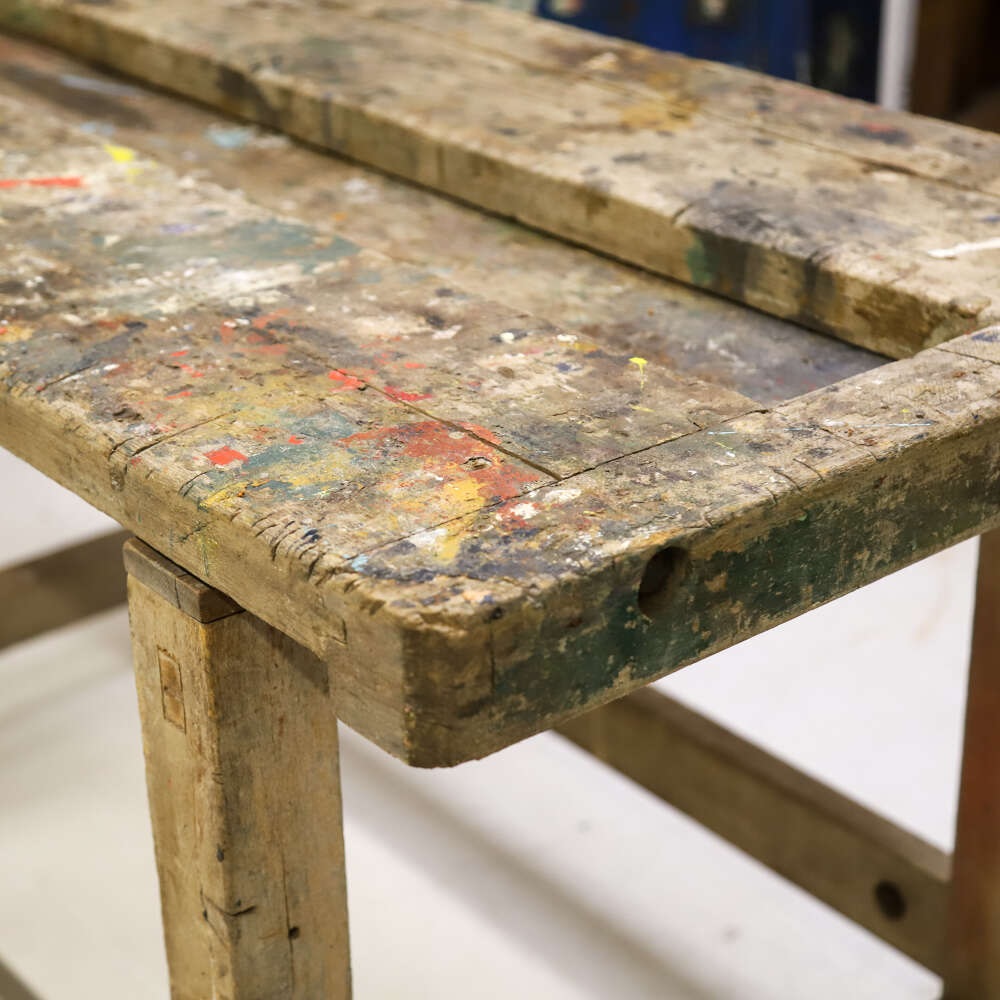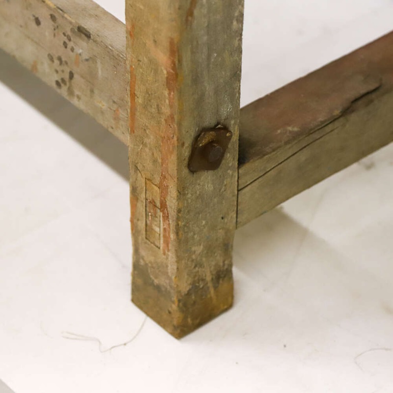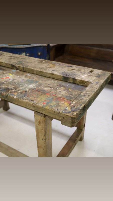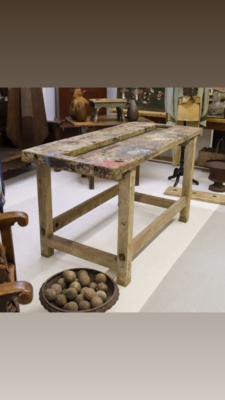 A fantastic English 20th C Carpenters Workbench. Completely hand built piece of good British Folkart presented with all the old splatters of paint and Saw marks making this a unique table suitable as a decorative Console. Of very solid construction and stands comfortably and securely. Patina reflects the passage of time adding character to the overall aesthetic.
