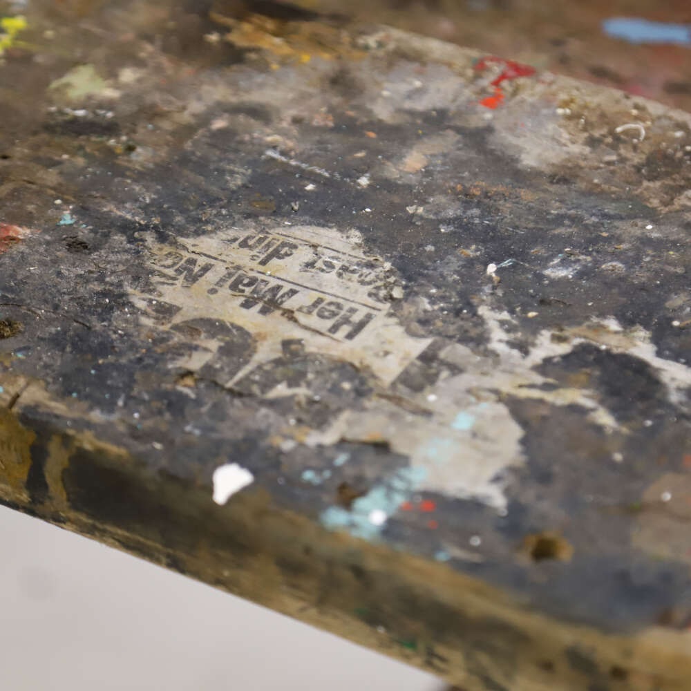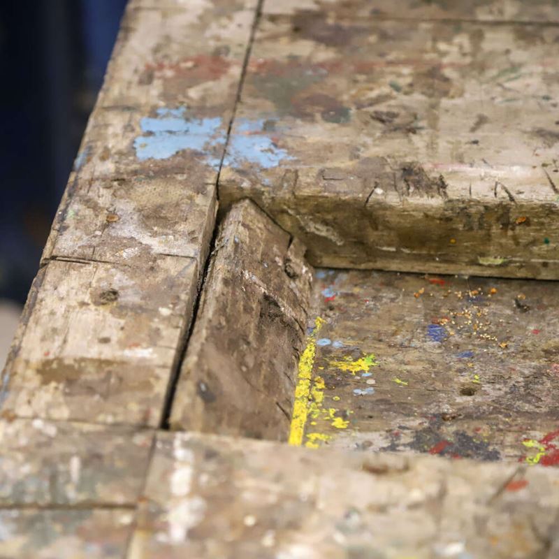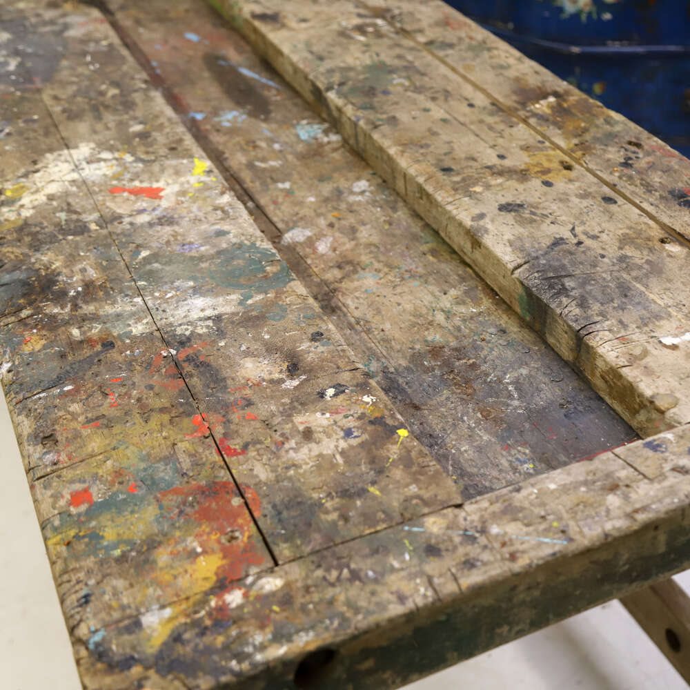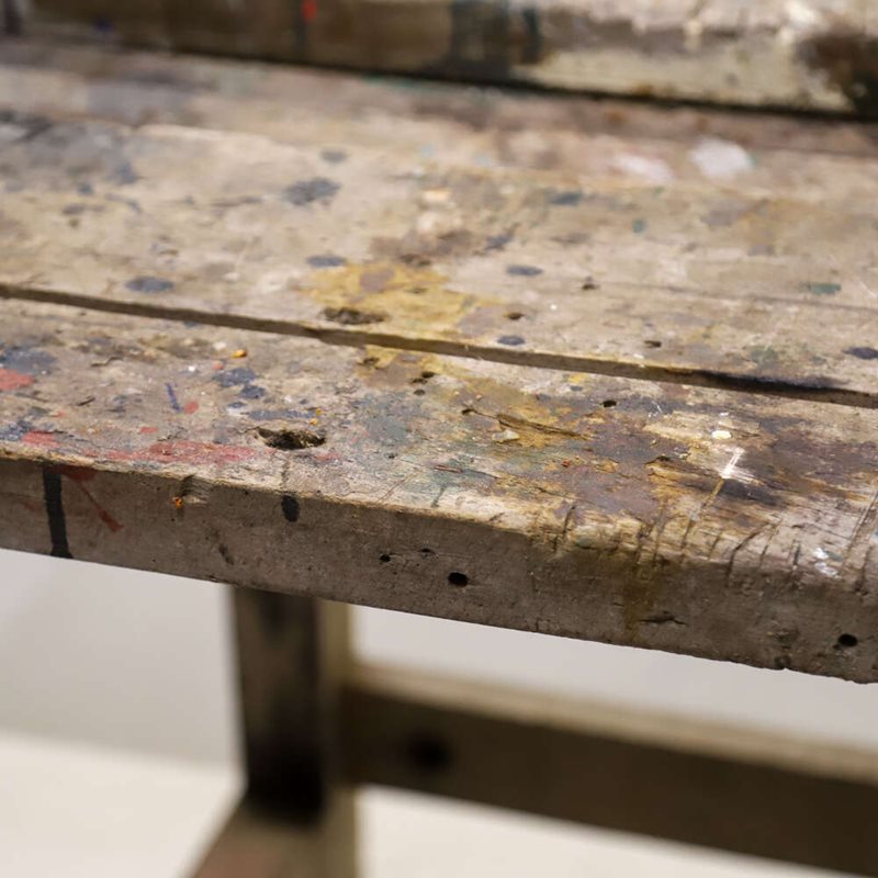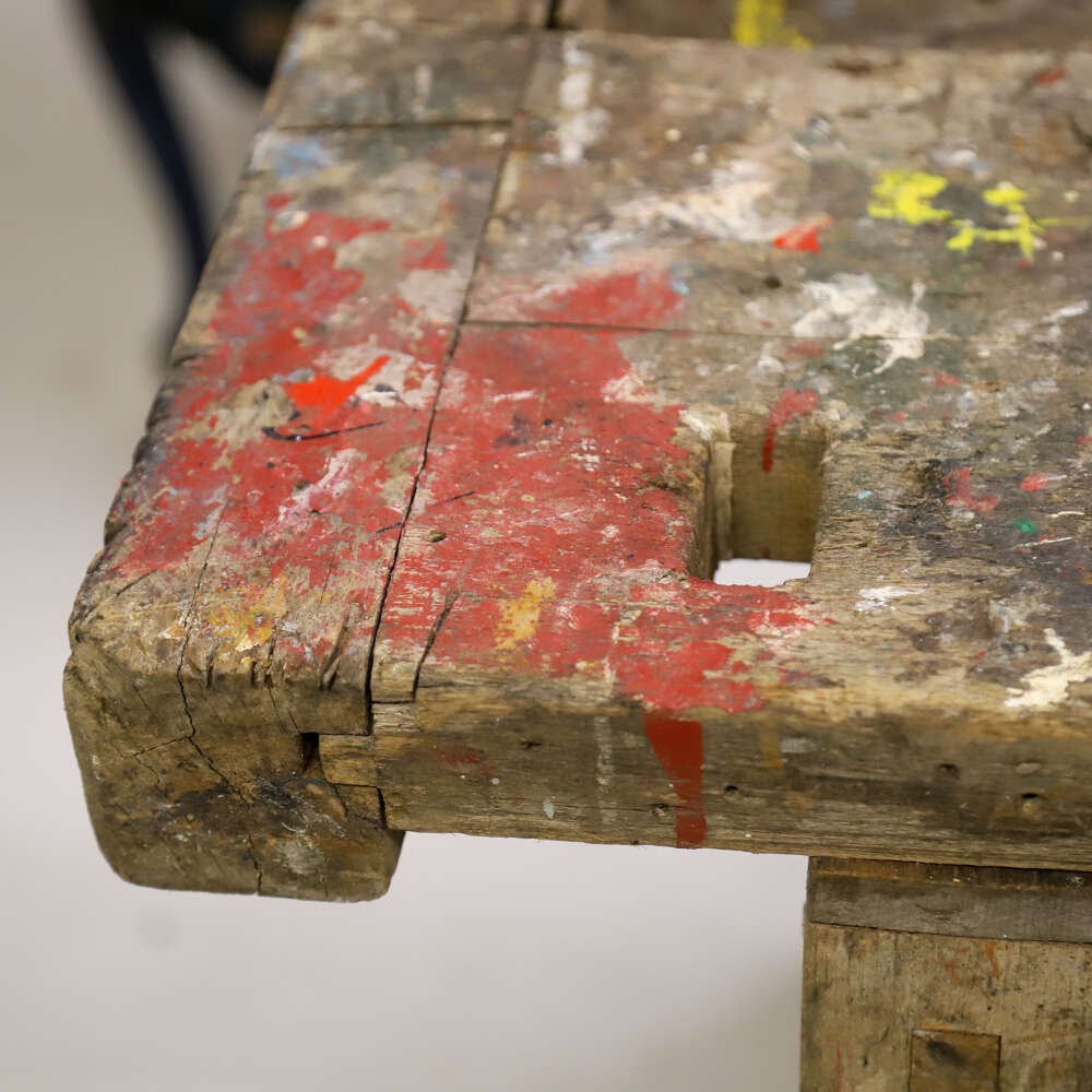 A fantastic English 20th C Carpenters Workbench. Completely hand built piece of good British Folkart presented with all the old splatters of paint and Saw marks making this a unique table suitable as a decorative Console. Of very solid construction and stands comfortably and securely. Patina reflects the passage of time adding character to the overall aesthetic.