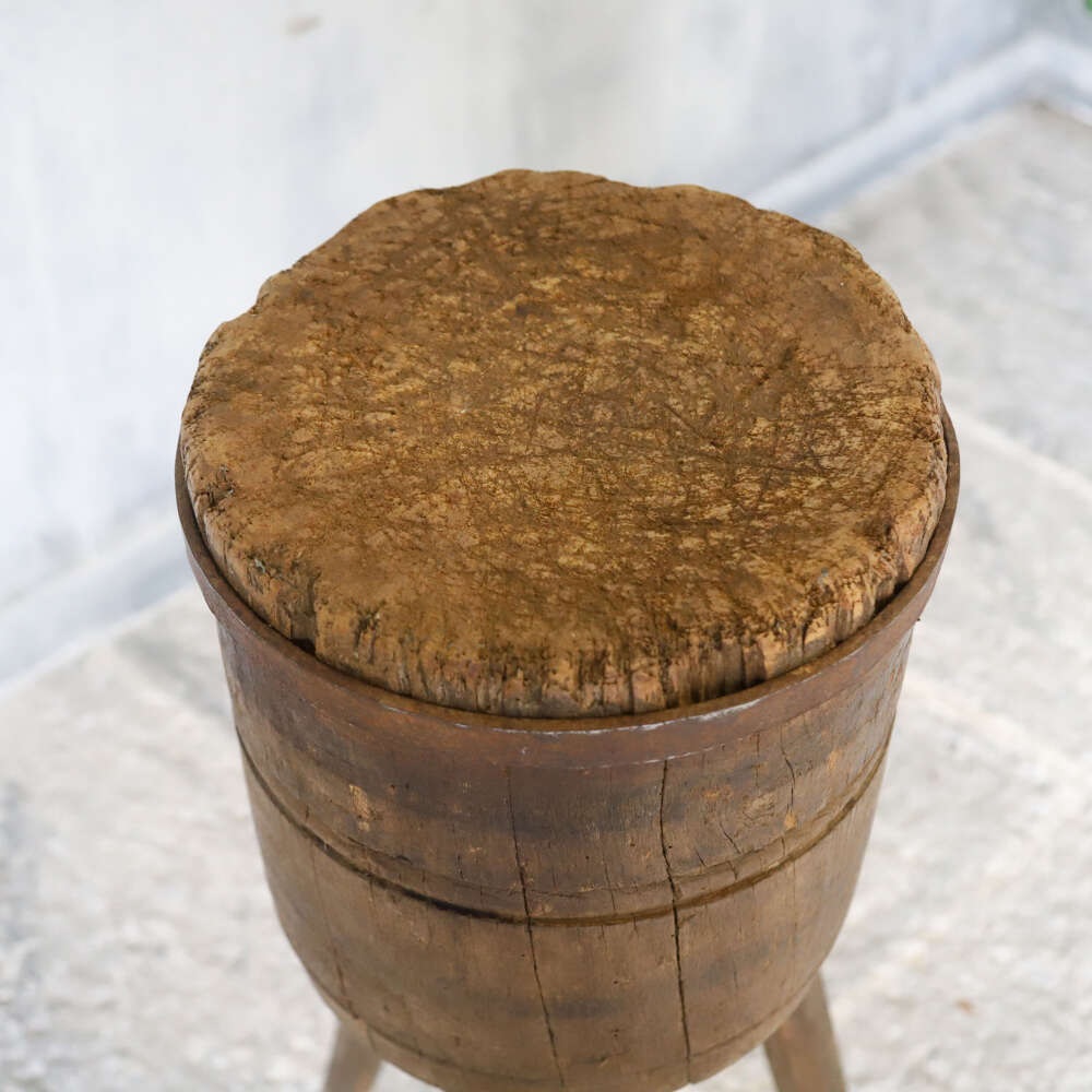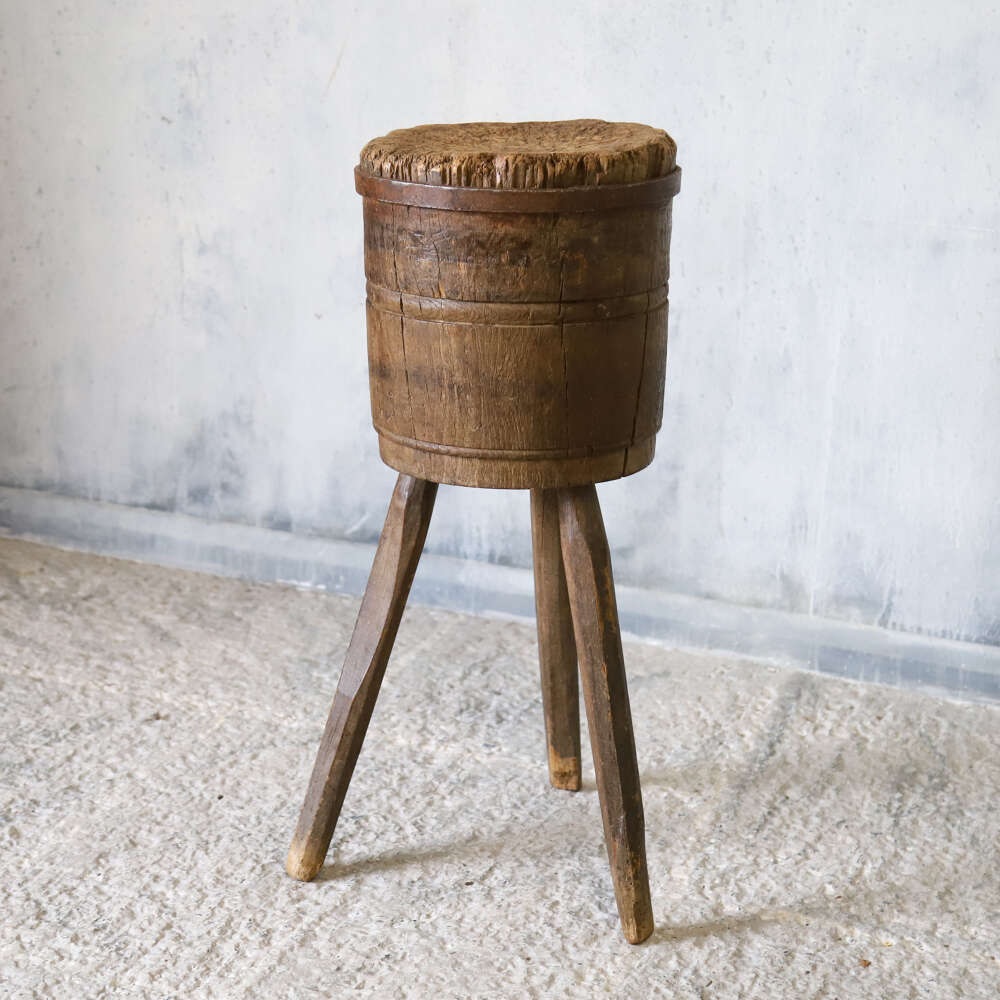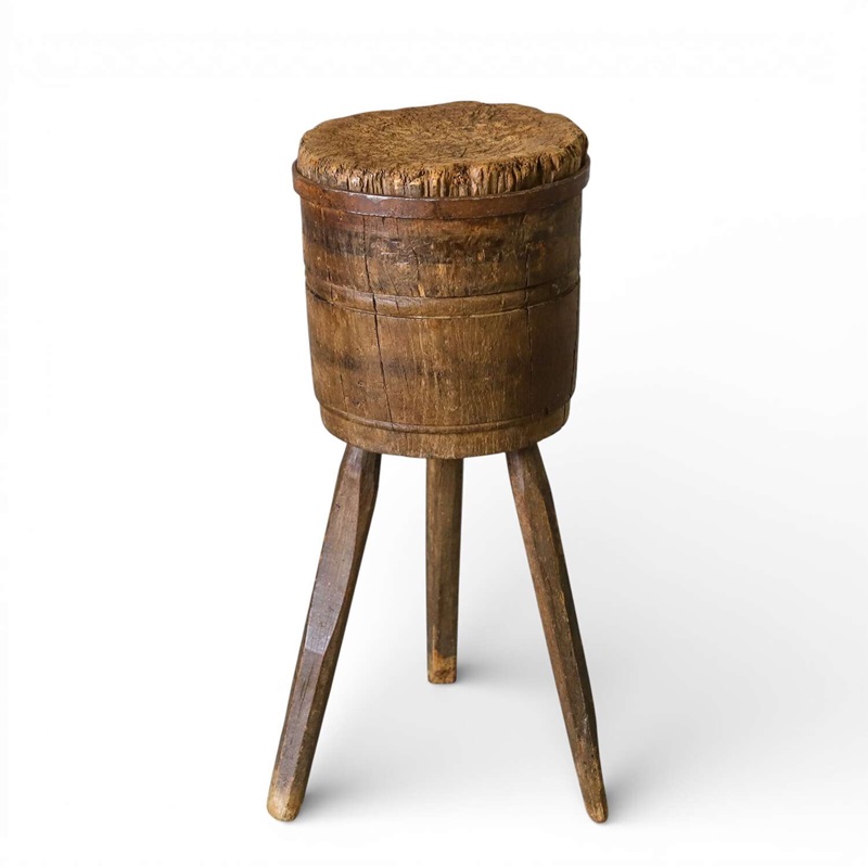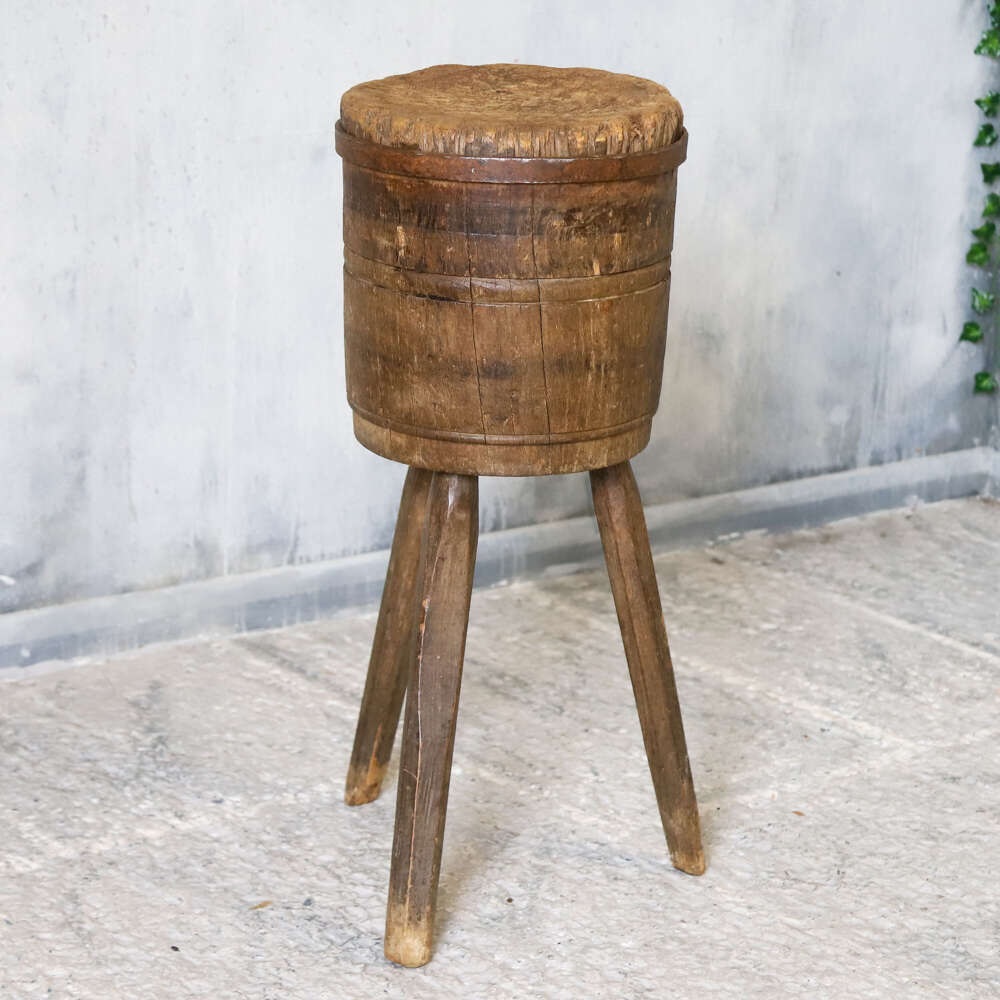 A wonderful characterful Vintage French Charcuterie Chopping Block, crafted from Oak and Elm on raised sturdy legs. These Blocks were used in Butchers shops and Charcuteries across France in the 19th and early20th Centuries. With a beautifully time worn surface, rich patina and a solid honest construction this would make a superb decorative accent to any Kitchen, Pantry or Dining space working well as a small side table or display stand.
