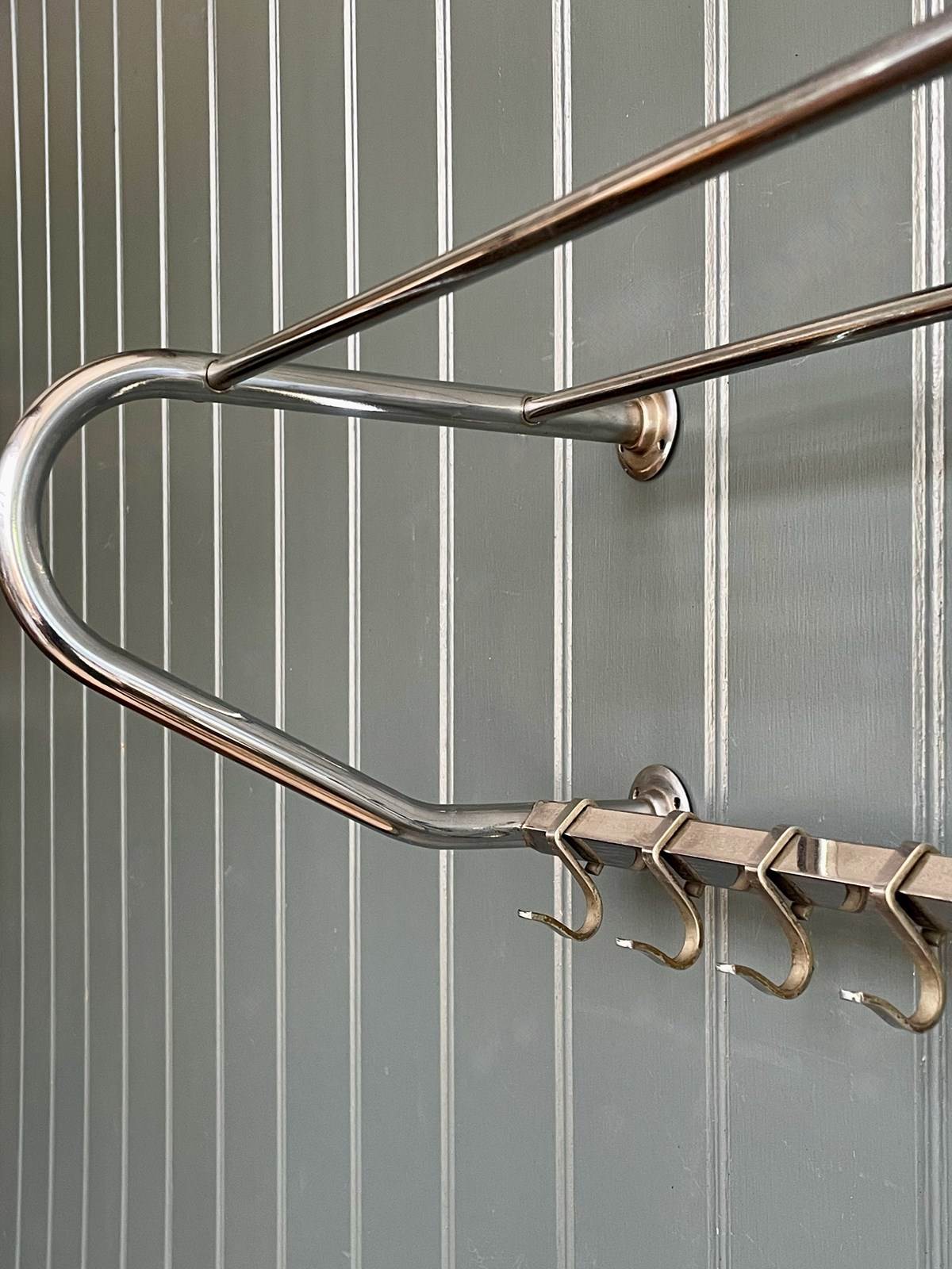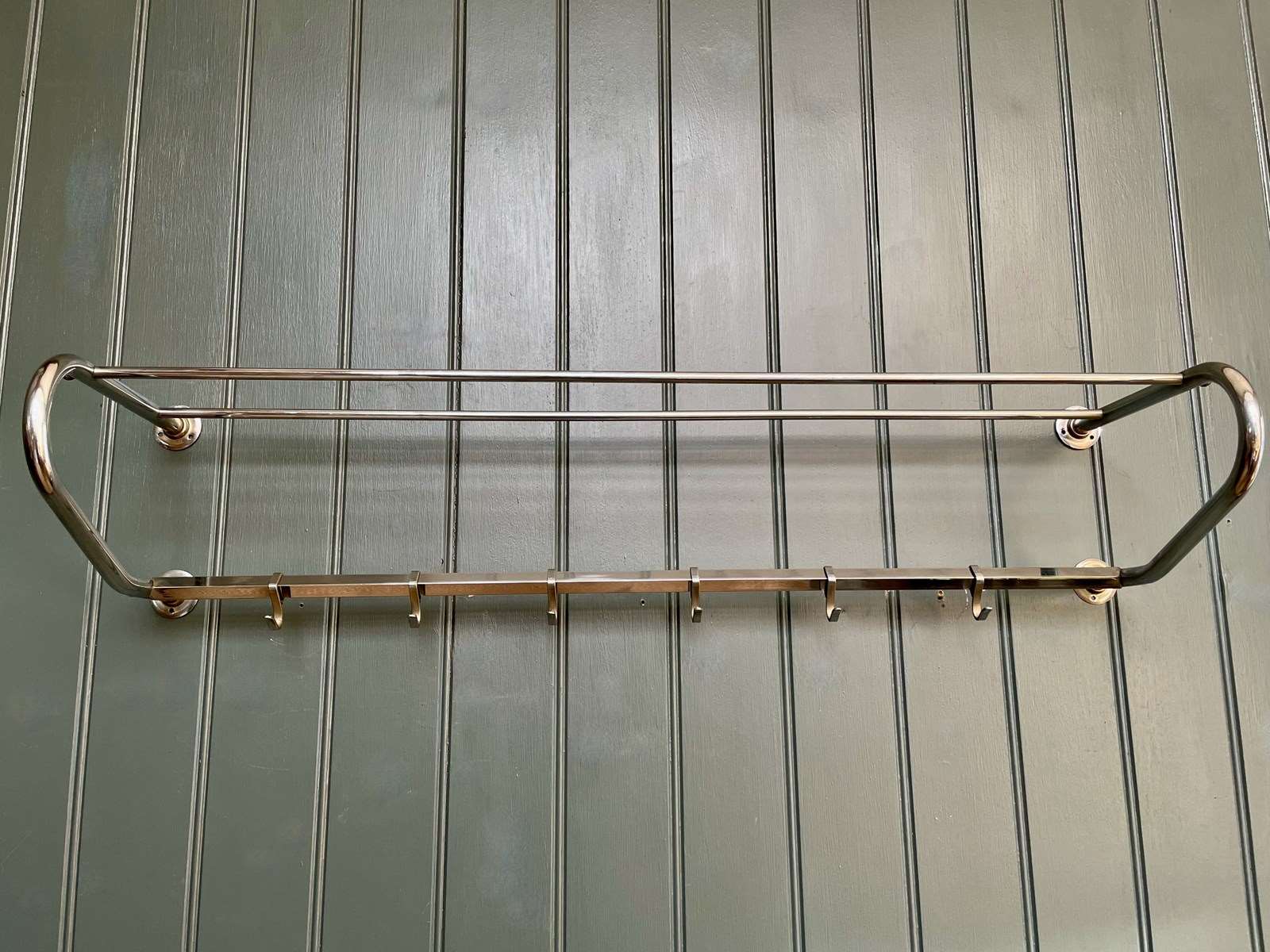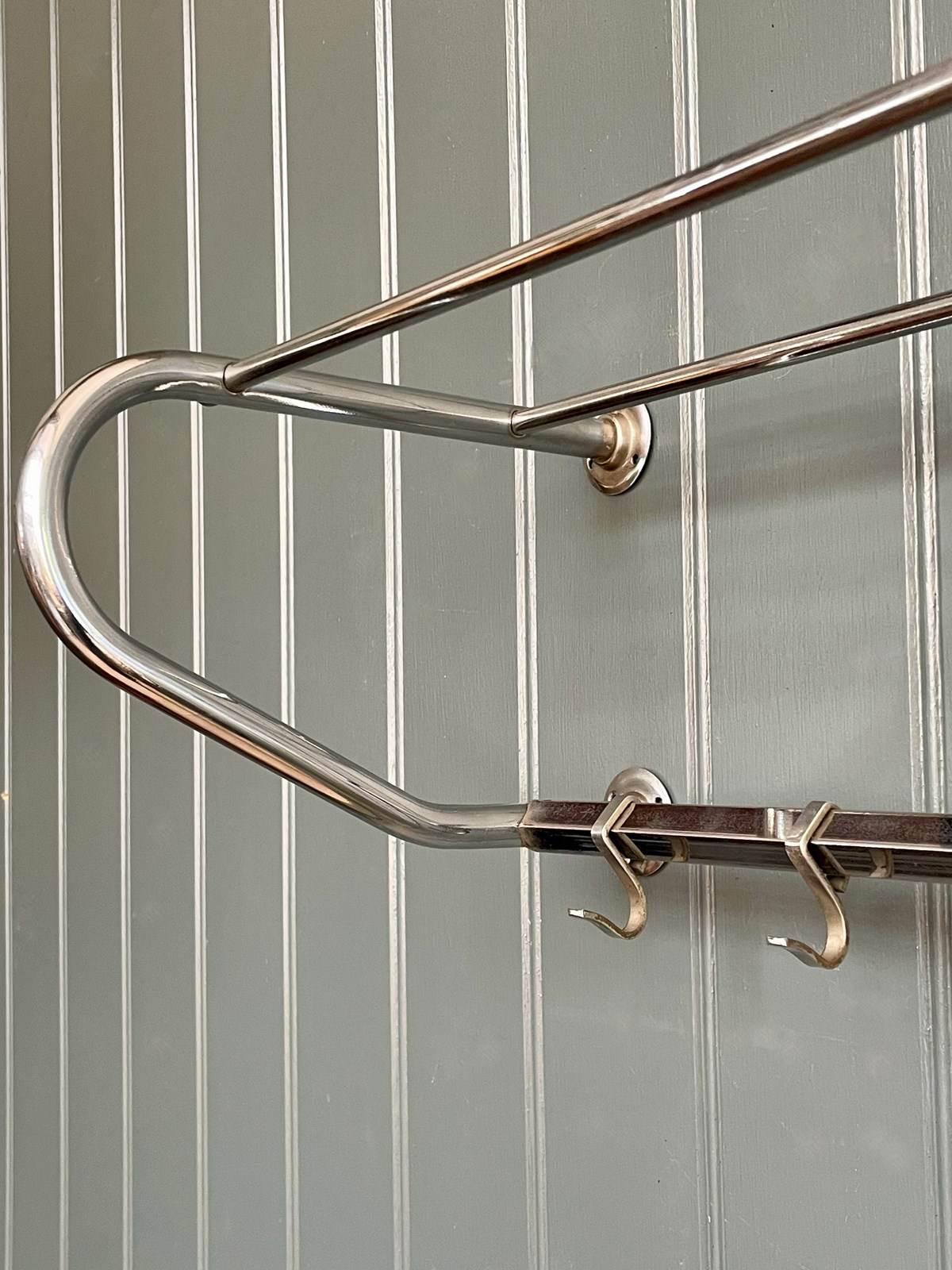 Stylish French chrome coat rack with six sliding hooks below a two-bar hat-shelf. A lovely example with just the lightest of wear consistent with age. These make for lovely kitchen pieces also, for hanging utensils etc.