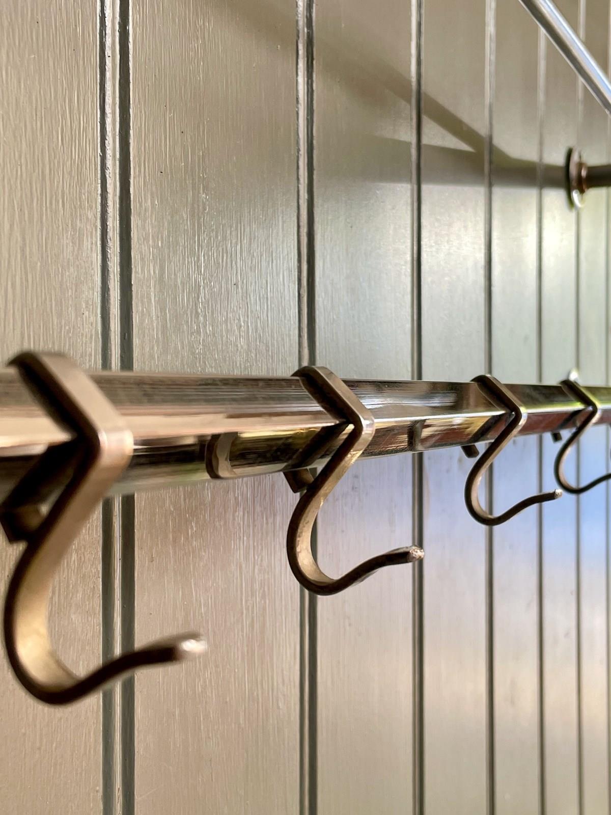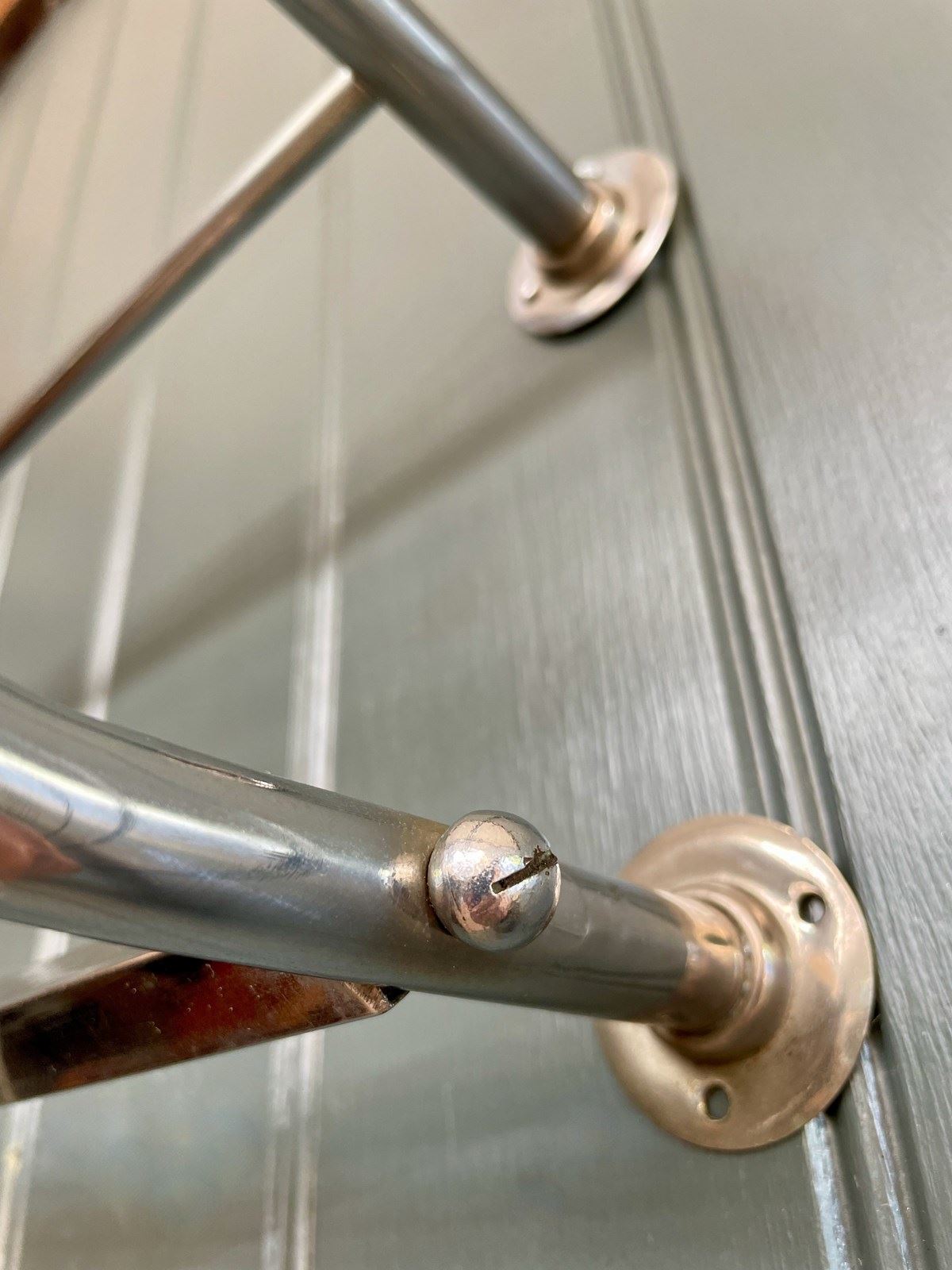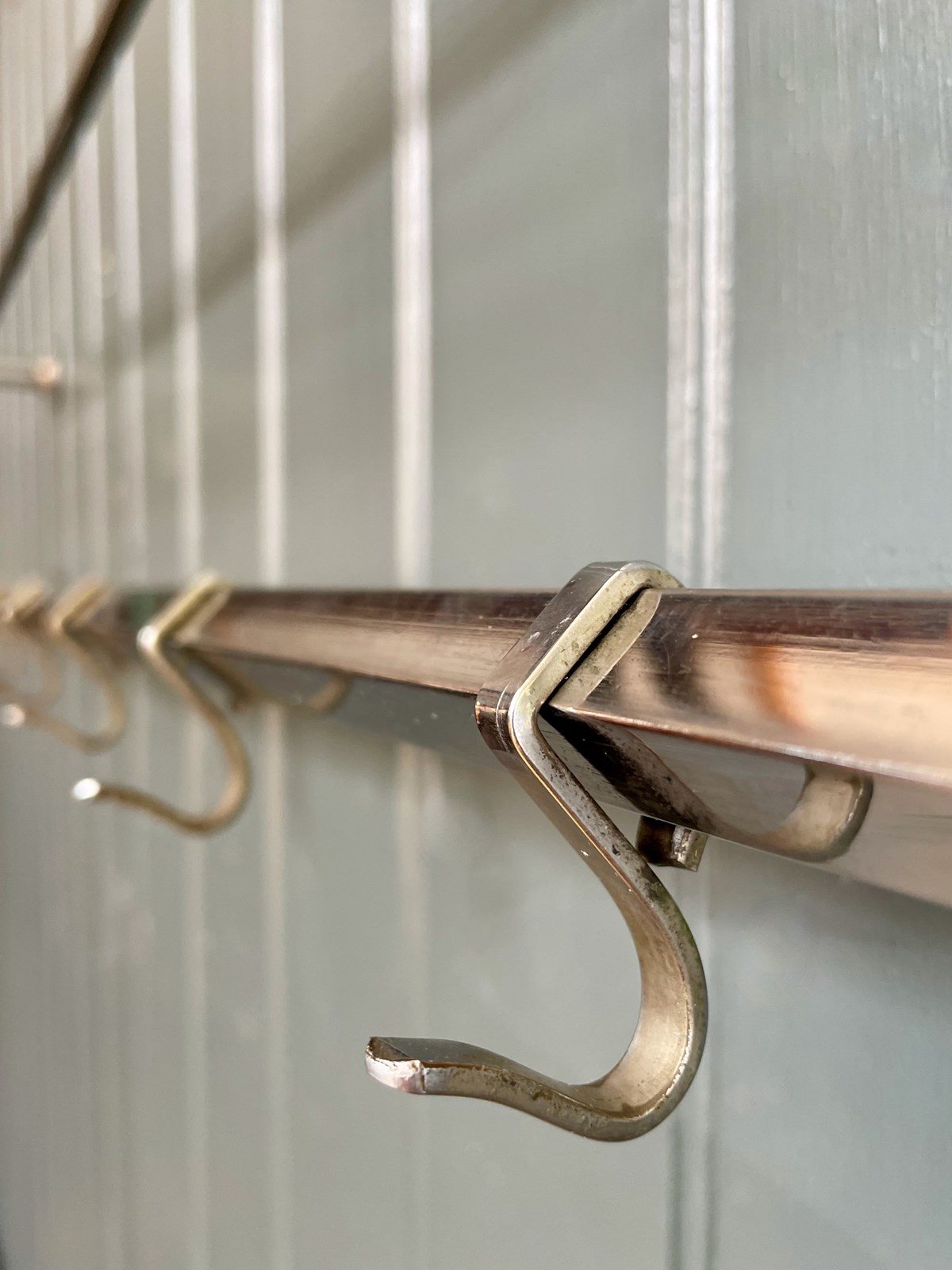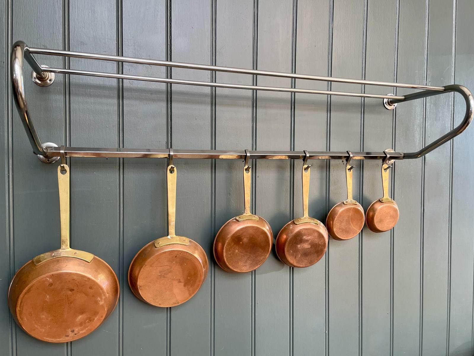 Stylish French chrome coat rack with six sliding hooks below a two-bar hat-shelf. A lovely example with just the lightest of wear consistent with age. These make for lovely kitchen pieces also, for hanging utensils etc.