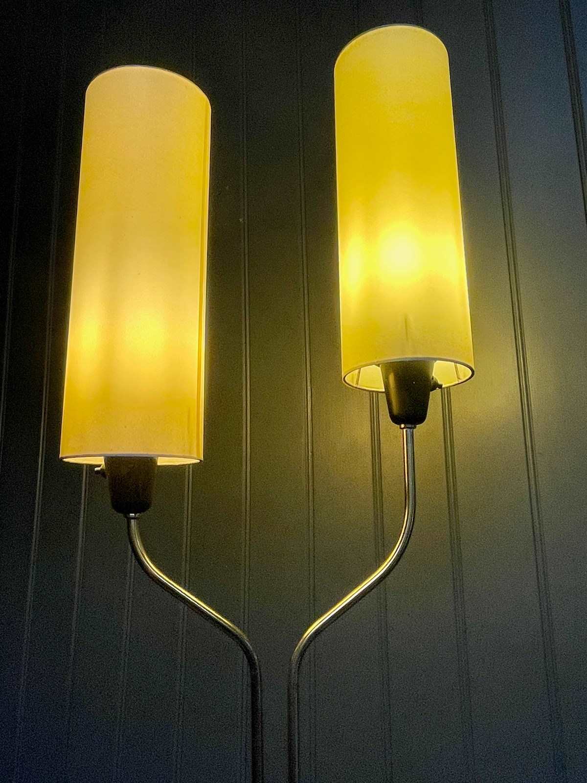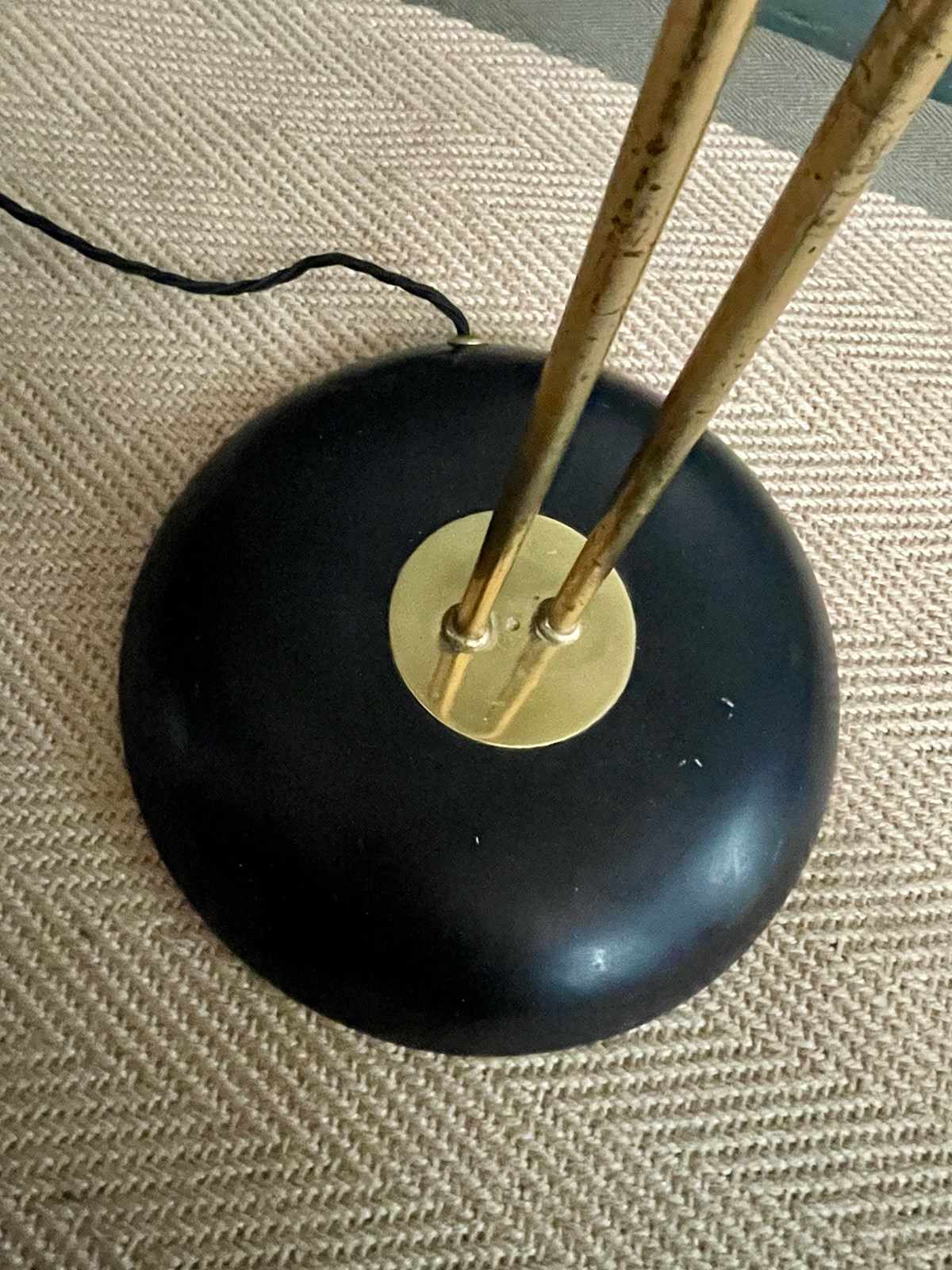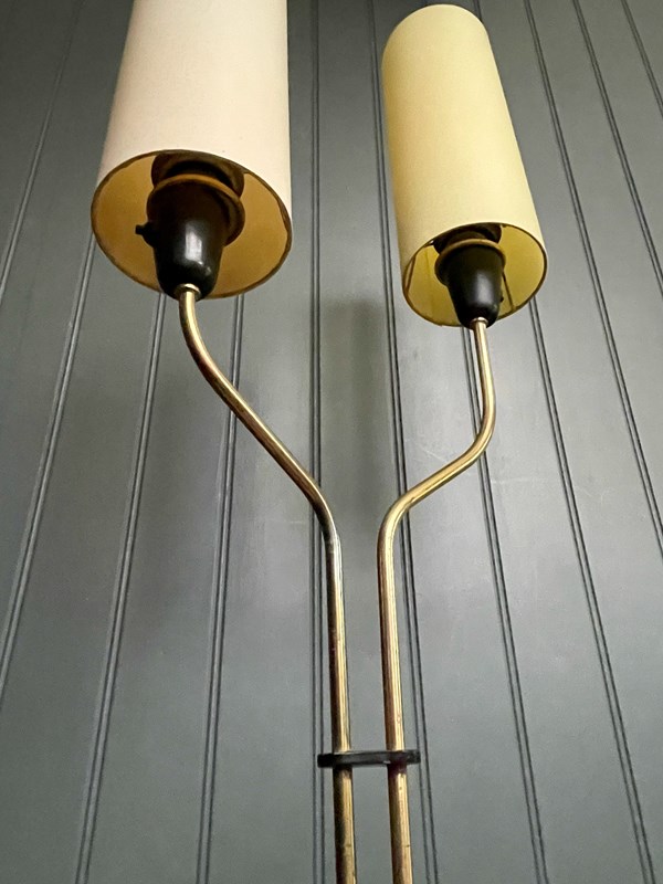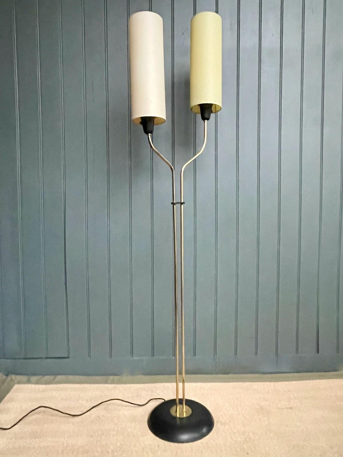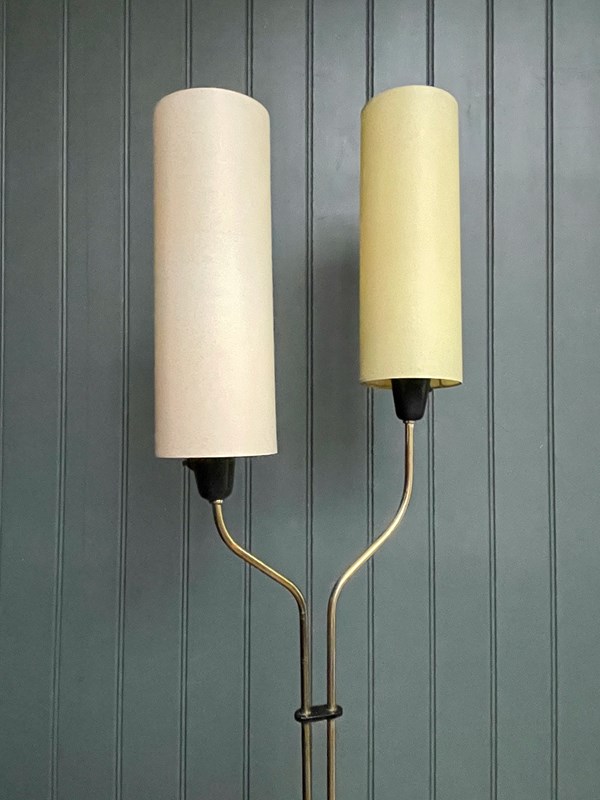 Stylish mid century Continental floor lamp, with two staggered shades above a black base. Good vintage condition, with light wear consistent with age, and newly rewired with black braided flex. Accepts ES bulbs.