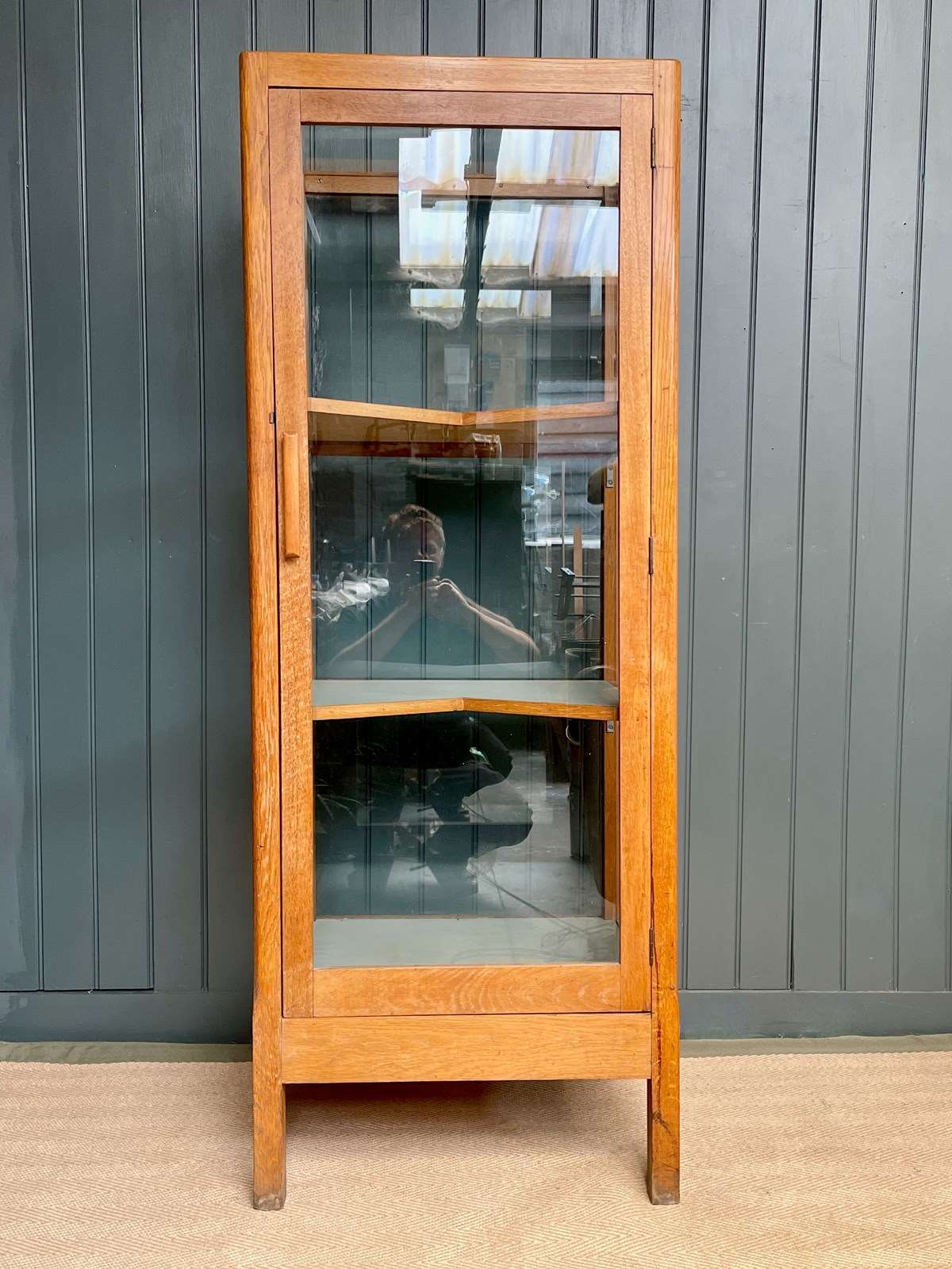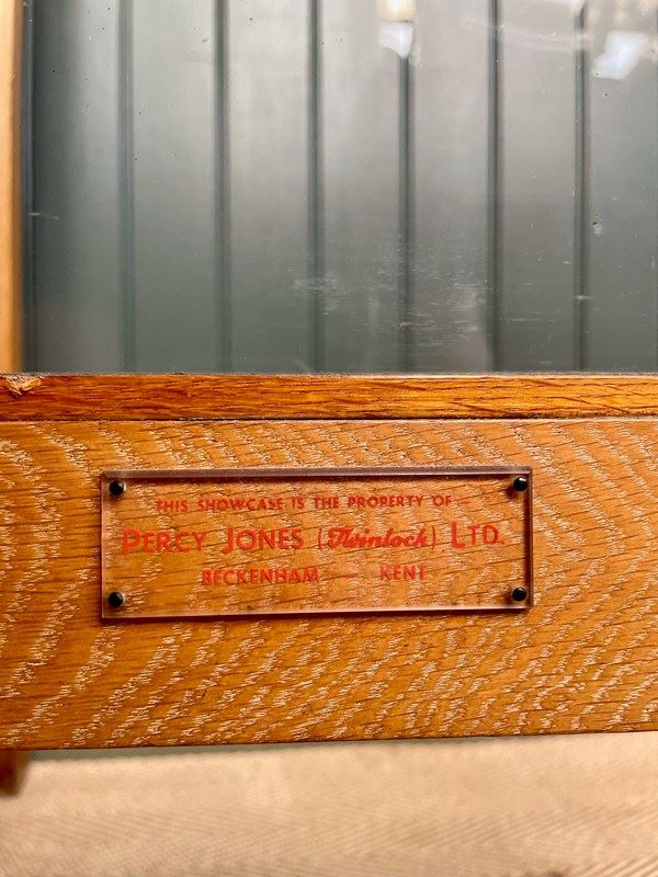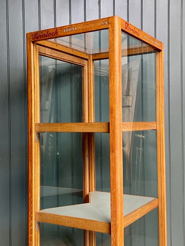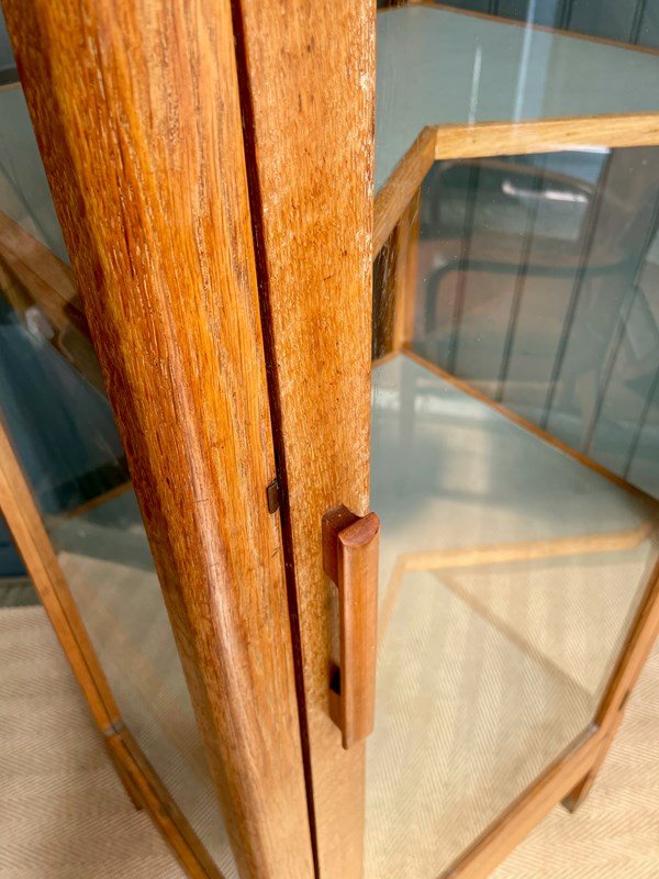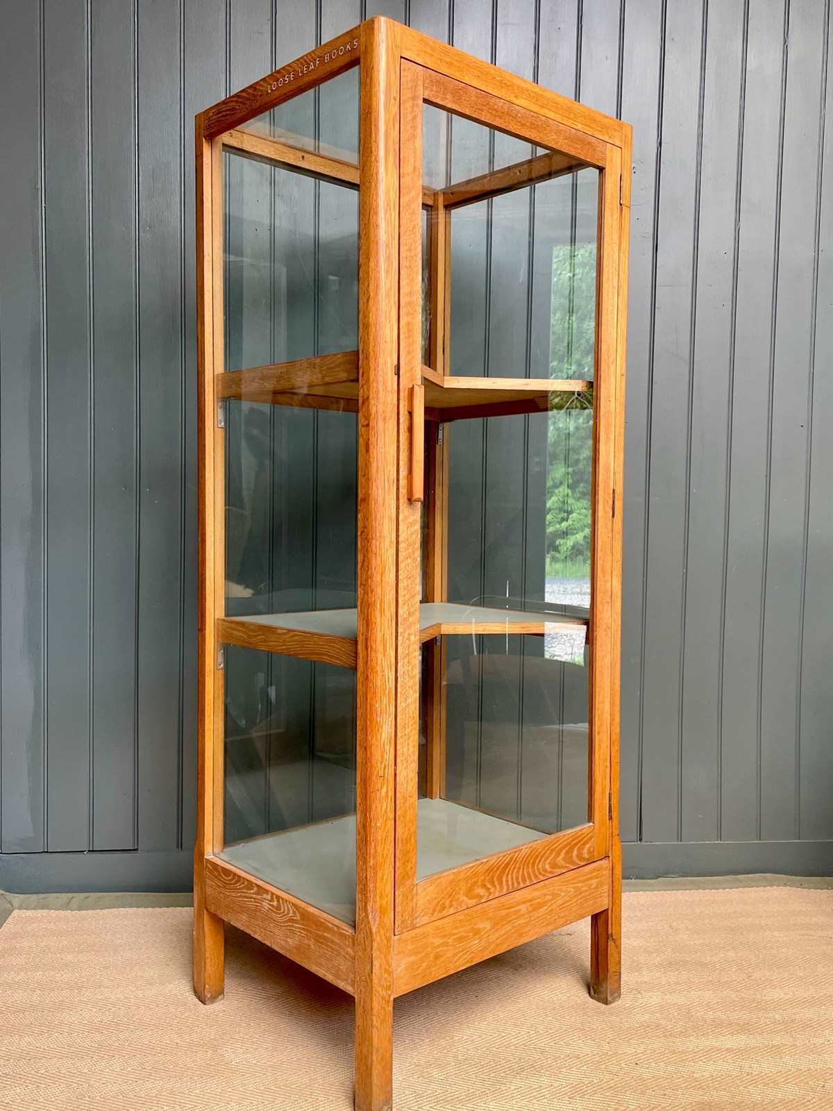A handsome English oak shop display cabinet, with original transfers still visible to the top. A lovely simple design, with a pleasing radius to the corners, a turned oak handle, and glazing to all faces including the top. There are two internal shelves, with unusual 45 degree cut-outs. Beautiful condition, with just the lightest of wear consistent with age. Would obviously work well in a retail setting, or perhaps a kitchen, and has a nice compact footprint.