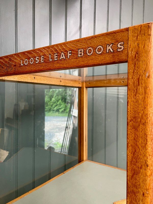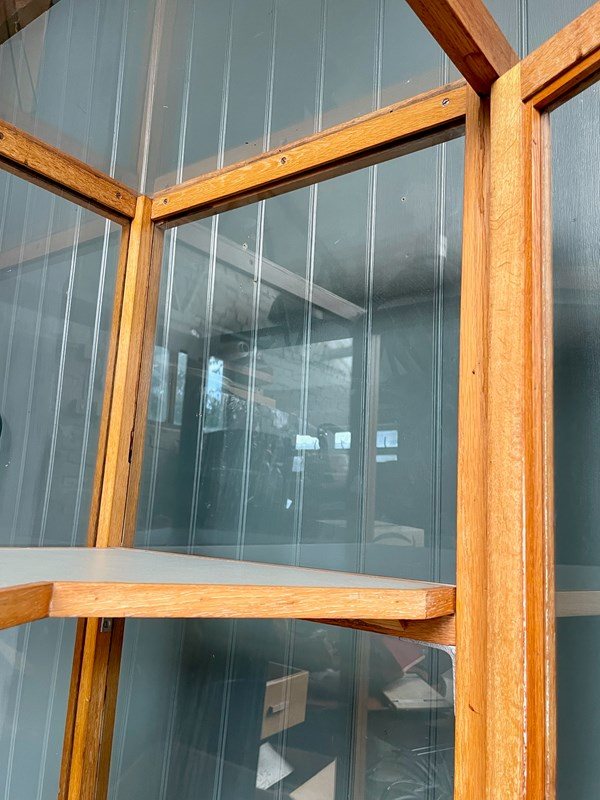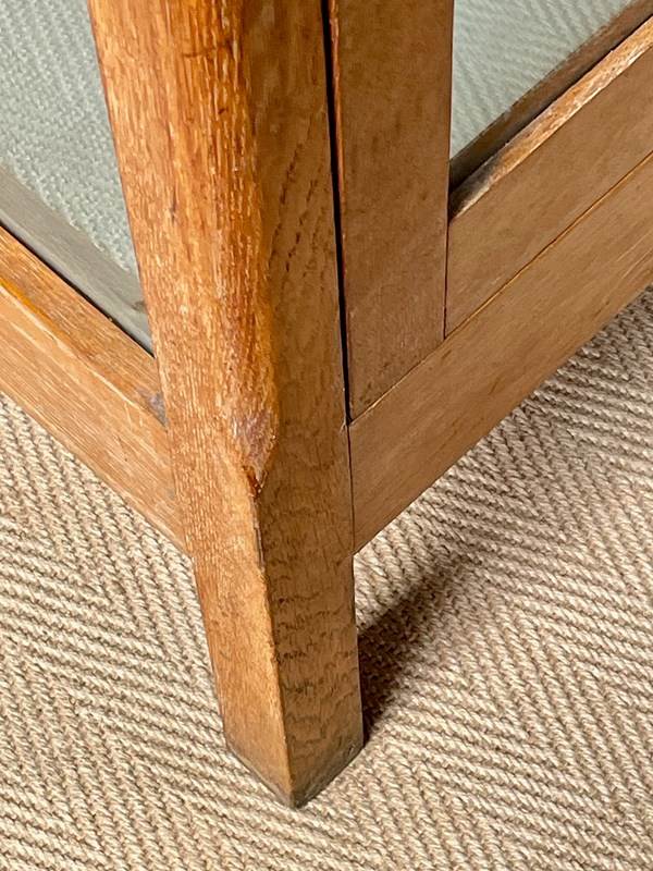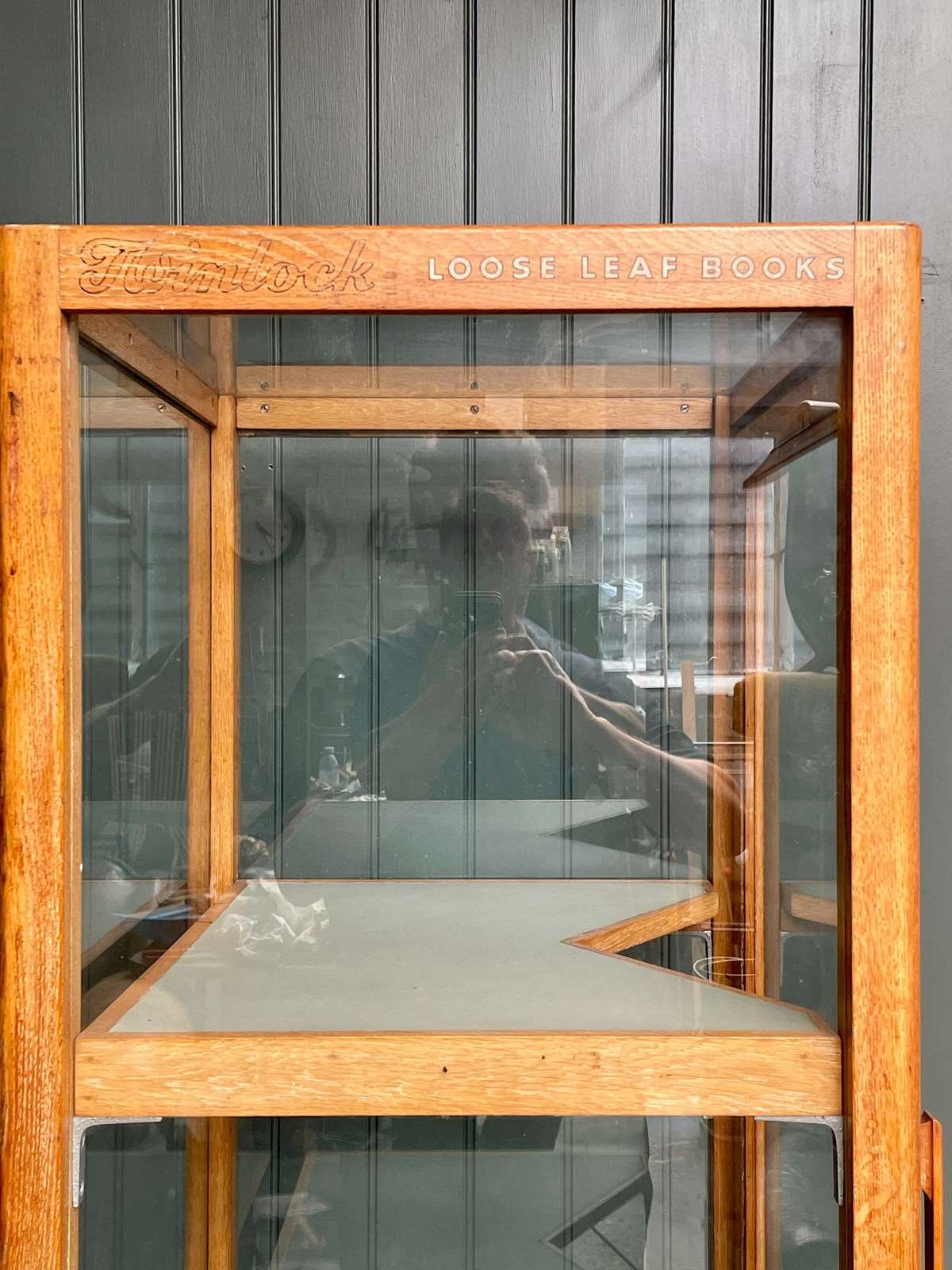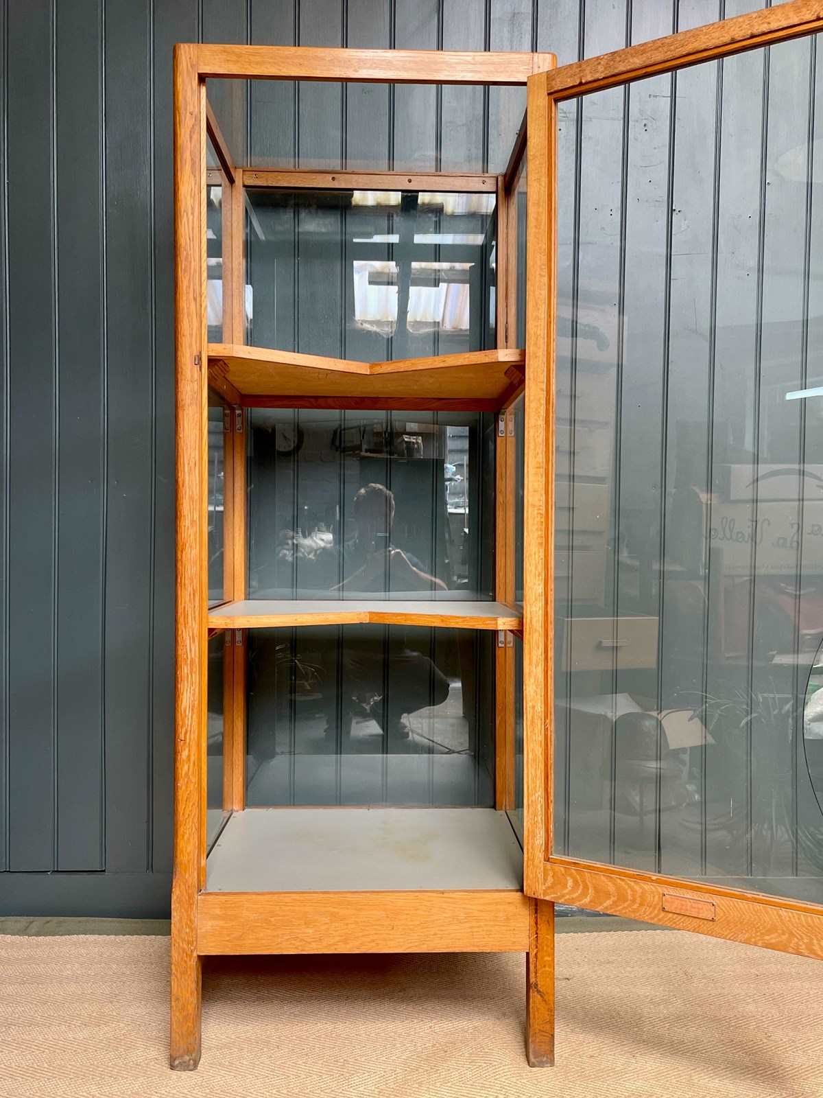 A handsome English oak shop display cabinet, with original transfers still visible to the top. A lovely simple design, with a pleasing radius to the corners, a turned oak handle, and glazing to all faces including the top. There are two internal shelves, with unusual 45 degree cut-outs. Beautiful condition, with just the lightest of wear consistent with age. Would obviously work well in a retail setting, or perhaps a kitchen, and has a nice compact footprint.