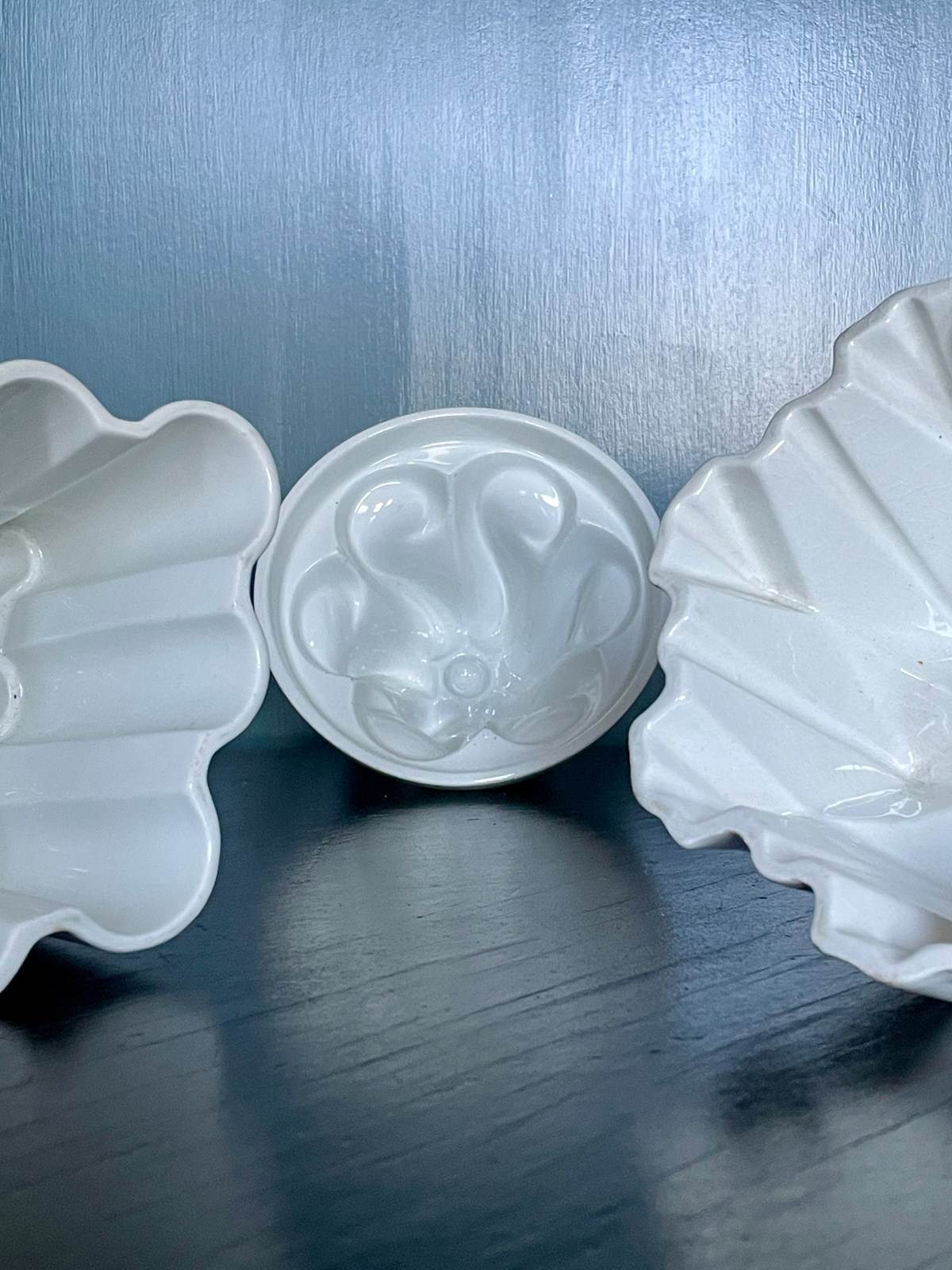 A little cluster of classic English vintage jelly moulds, each with a maker’s stamp. All in nice condition with clean interiors. One has a little minor wear to the ‘feet’ on the underside, but no chips or cracks. Dimensions given are for the tallest, and price is per piece. Happy to sell individually.