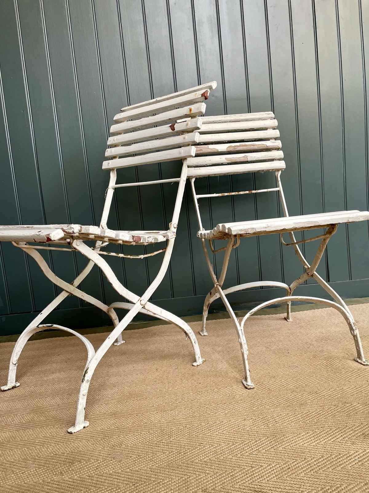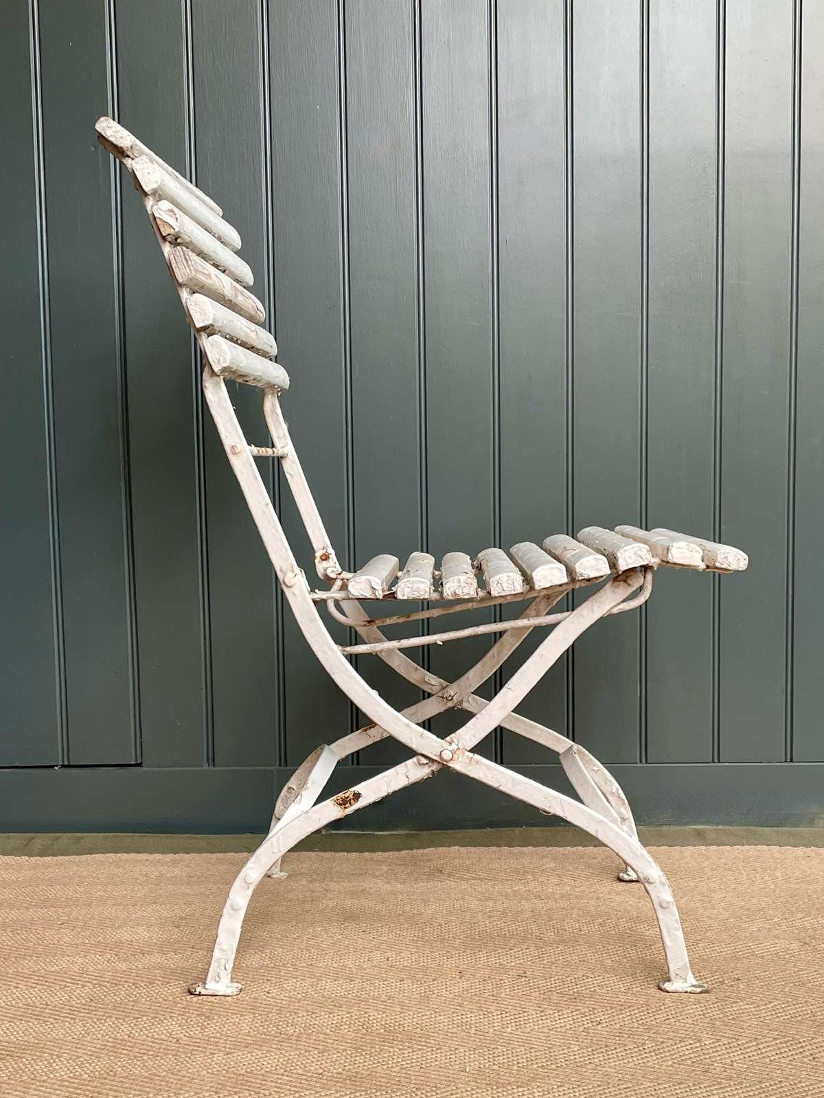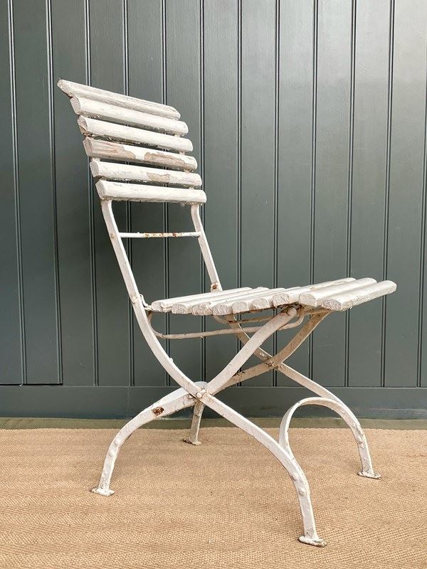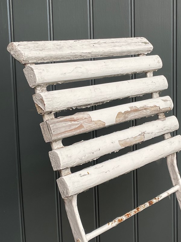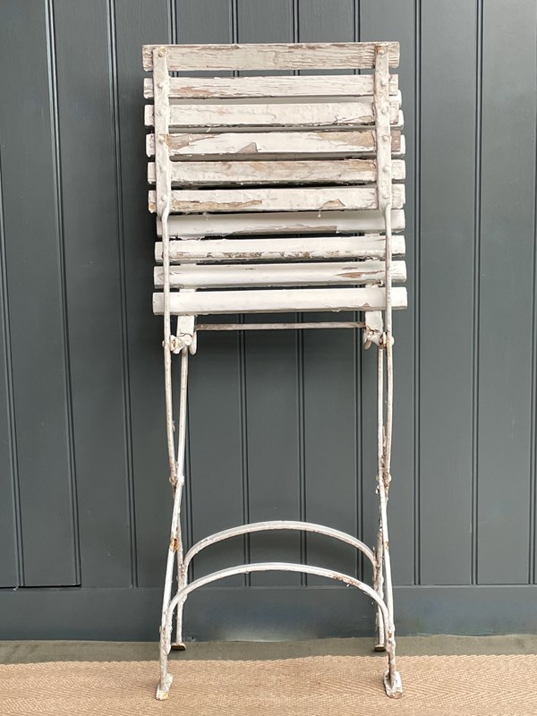 Four lovely French folding terrace chairs, in weathered chippy white paint. A nice elegant shape and a fairly early example with riveted bases. Can be folded for winter storage. Happy to sell in pairs. There is currently a matching bench listed separately. Price is per chair, and the seat height is approximately 42cm.