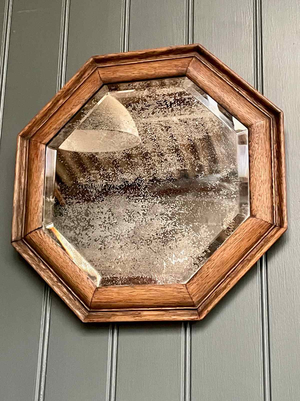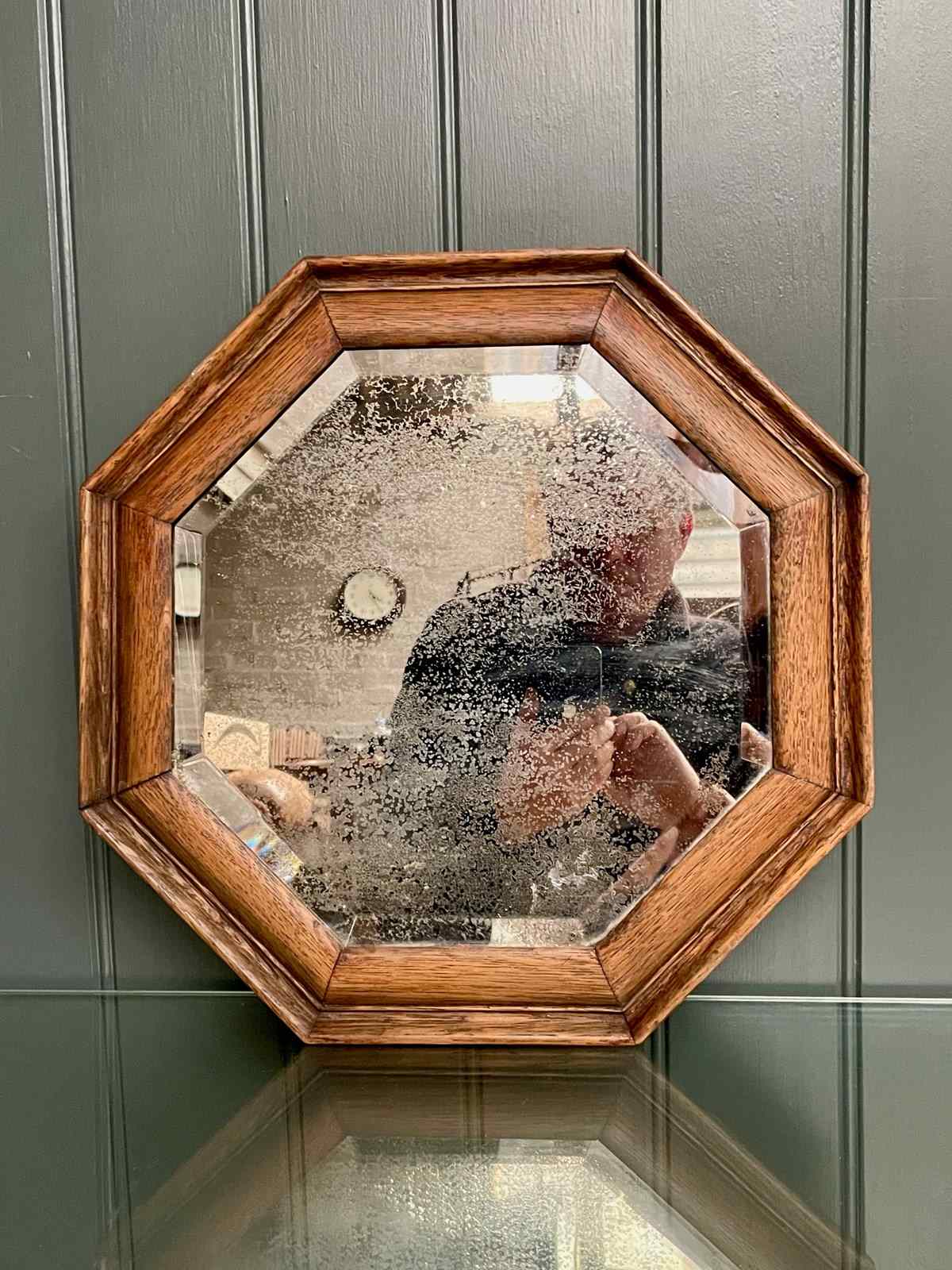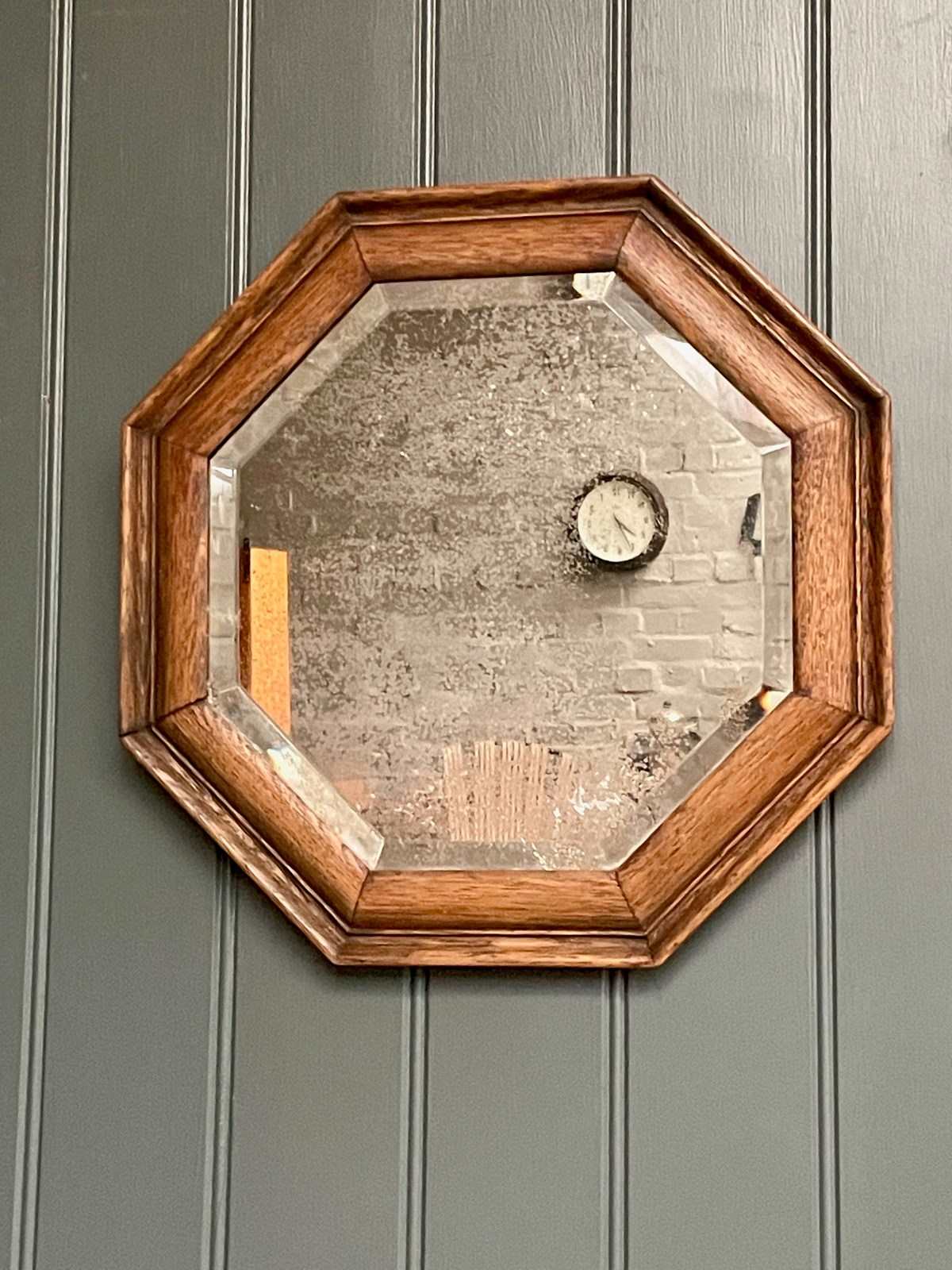 A simple but appealing English octagonal mirror, with both a bevelled edge, and the most appealing distress to the mirror backing. The foxing to the glass is near perfect – enough to reflect the room, but not enough to reveal your wrinkles! The original chain is present to the reverse, so ready to hang.