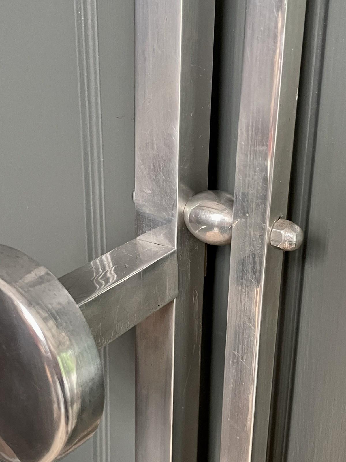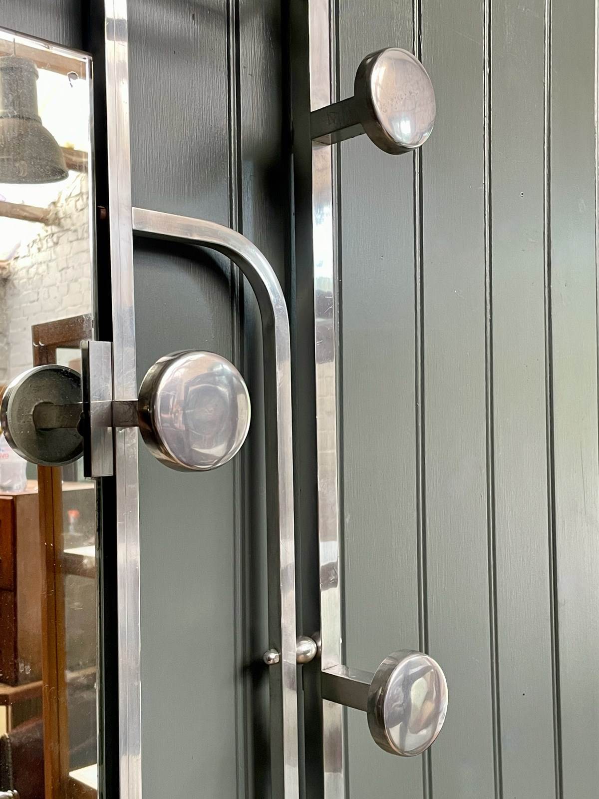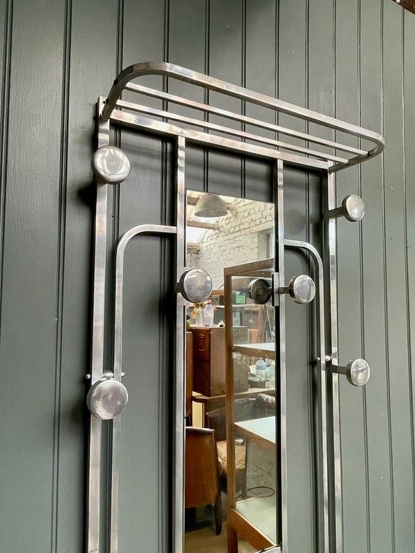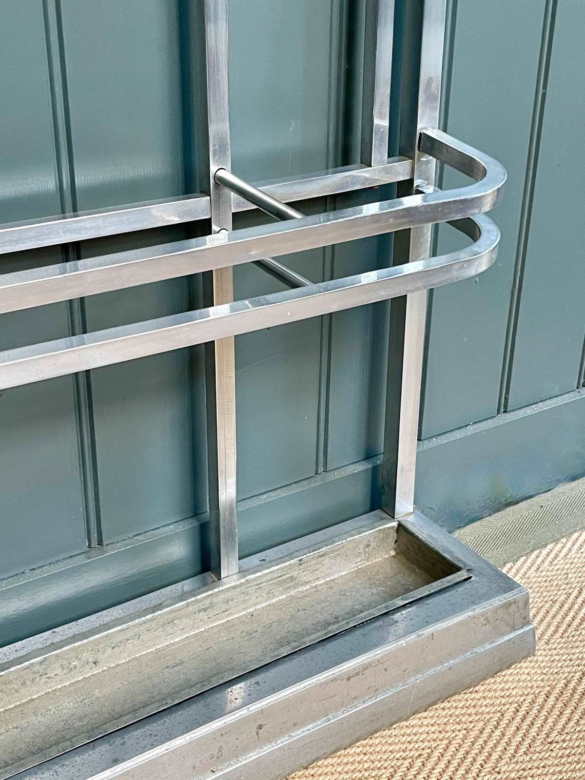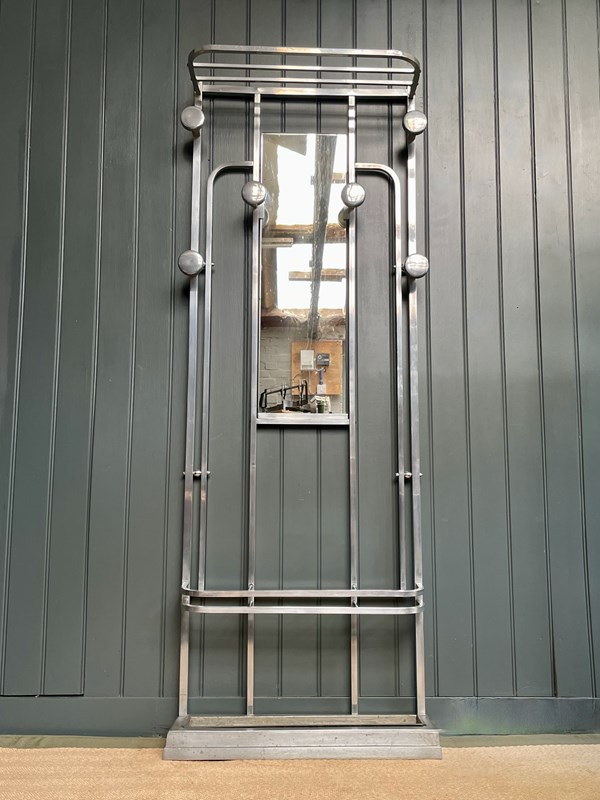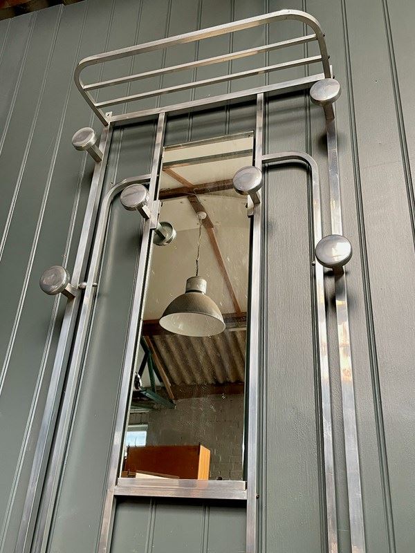 A particularly nice French aluminium hallstand, with a central mirror flanked by large circular hooks, a hat-shelf above, and an umbrella tray to the base. A very stylish example, with curved square-section members, and some elegant ovoid spacers between the uprights. Lovely condition, with just very light wear consistent with age, and requires just two screws for wall fixing. A lovely addition to any hallway.