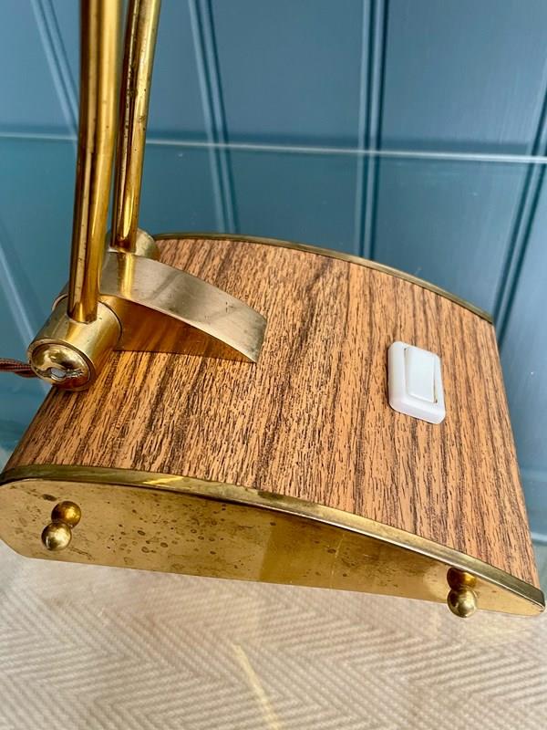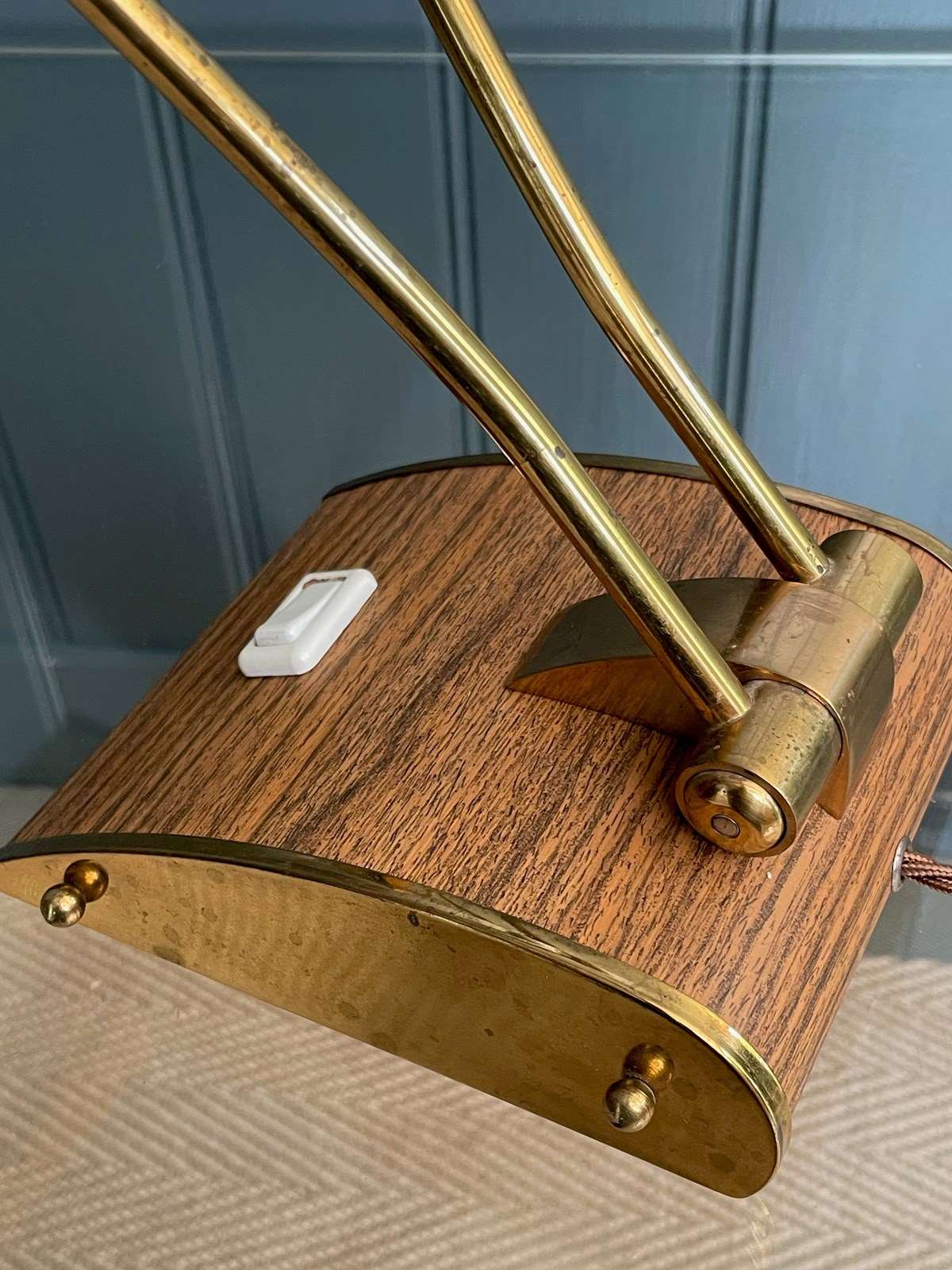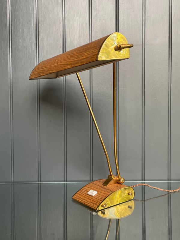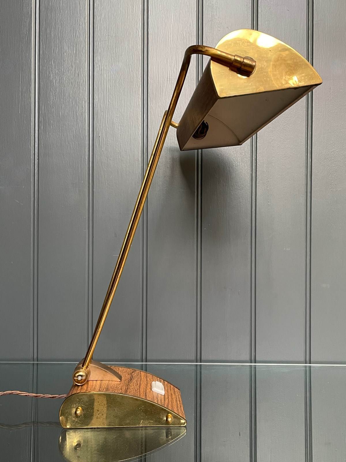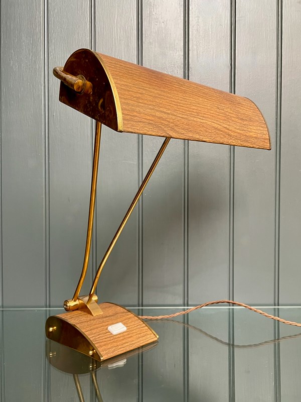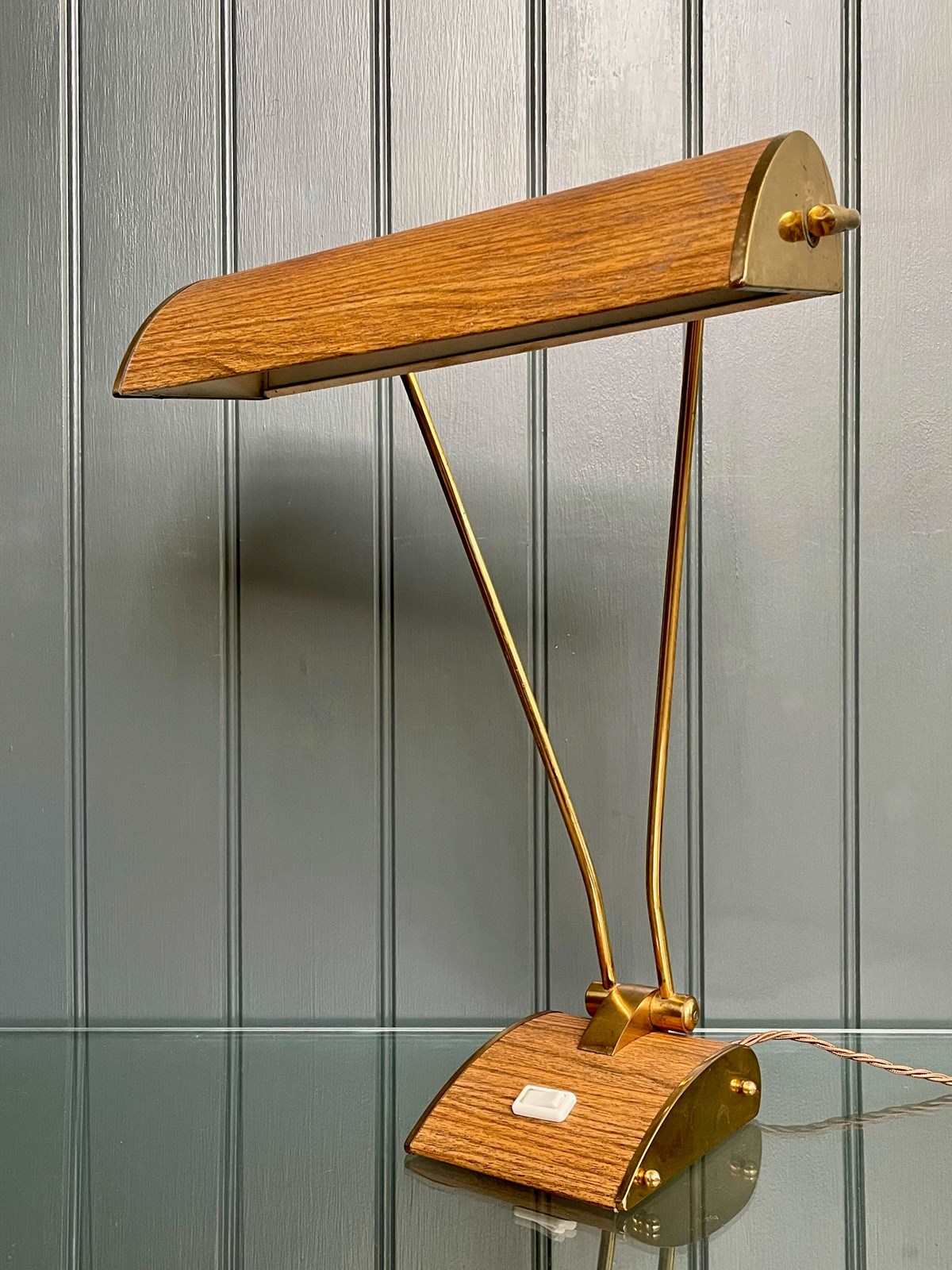 Elegant Eileen Gray designed desk lamp for Jumo, with brass and oak-effect shade and base in lovely original condition. Newly rewired in braided flex, and preserving the original switch, it accepts two candle-style BC bulbs. A beautiful design by a world-renown designer, and can be adjusted for rake, as well as the head being angled.