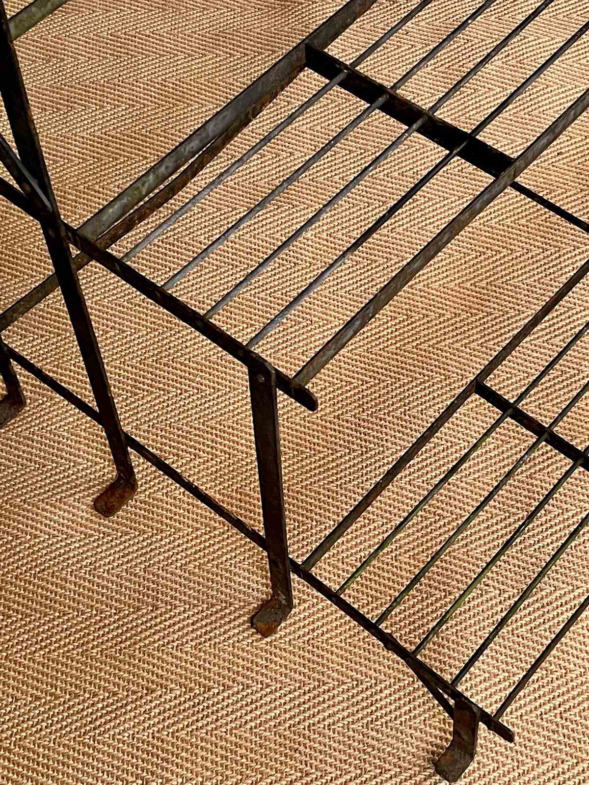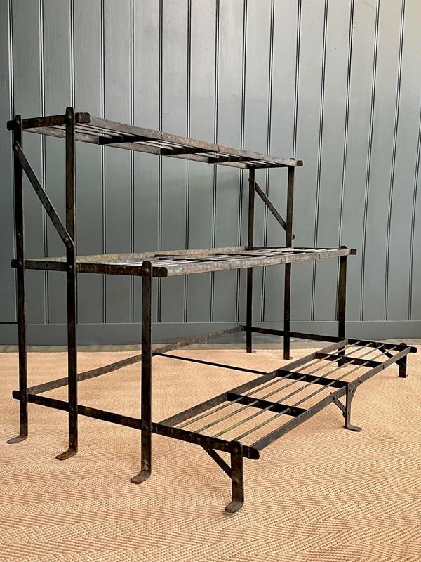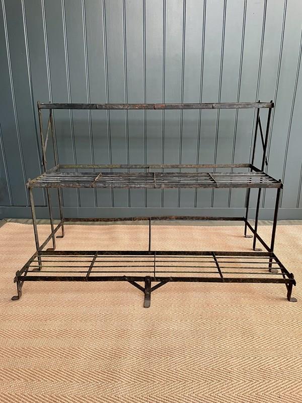 French metal florist’s stand, with three levels, and in original faded paint, with wear consistent with age. A lovely way to add height to a display of plants on a small terrace or balcony.