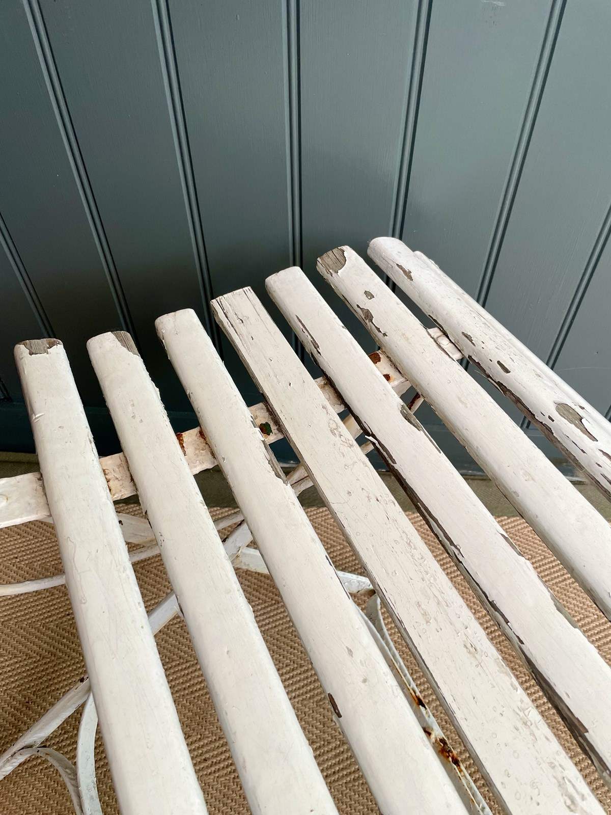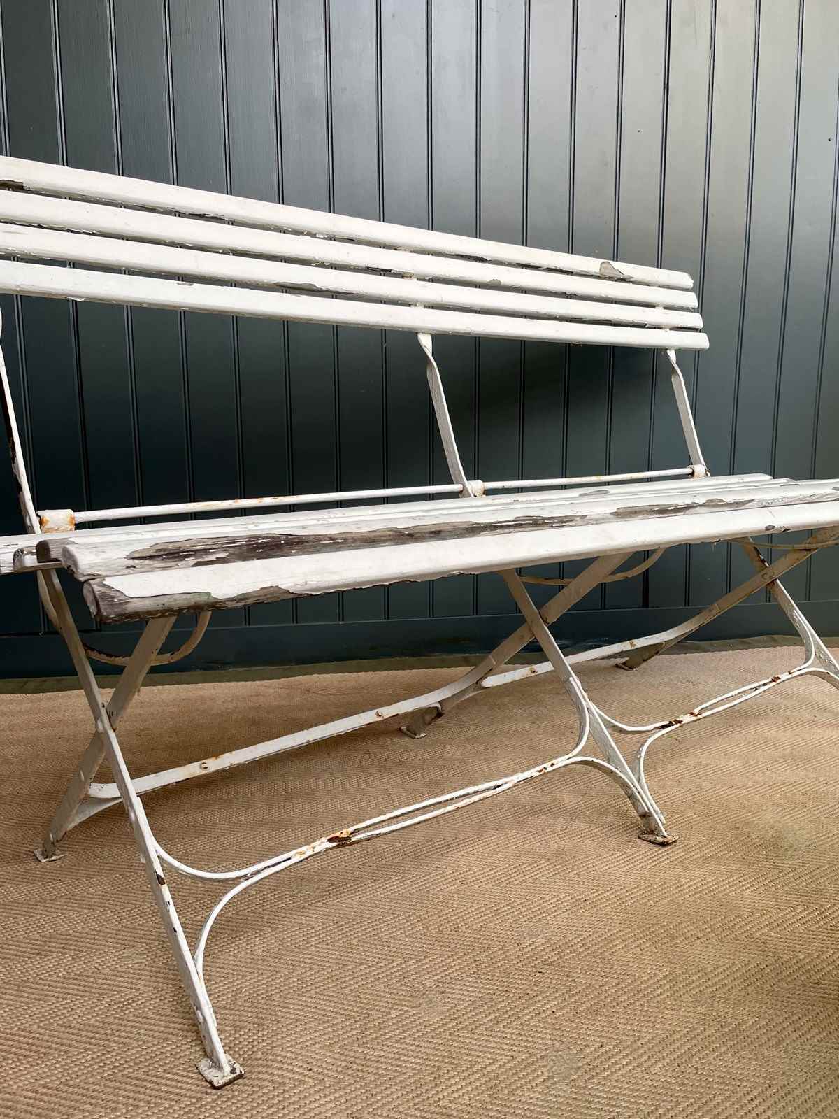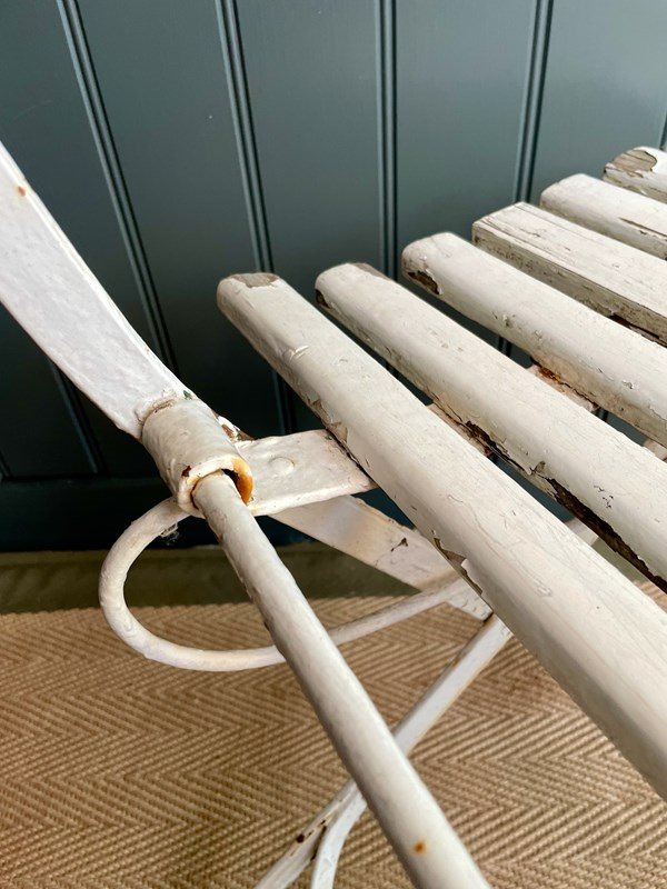 A classic French folding garden bench, in lovely weathered chippy paint. The wooden slats are all in good vintage condition, and the steel riveted base folds easily for winter storage. Given the riveted base I think this is quite an early example, from the second quarter of the 20C. I have a set of four matching chairs that I will list separately, and happy to sell in pairs. The seat height is approximately 43cm.