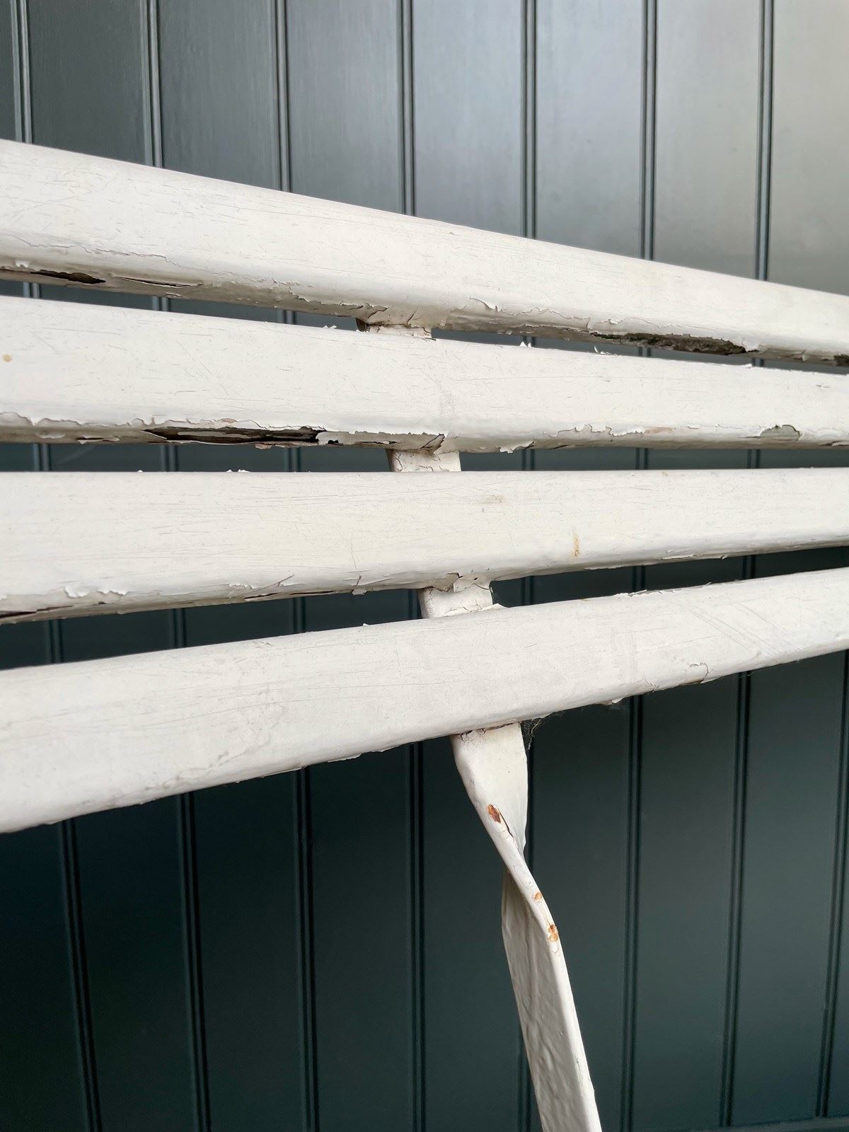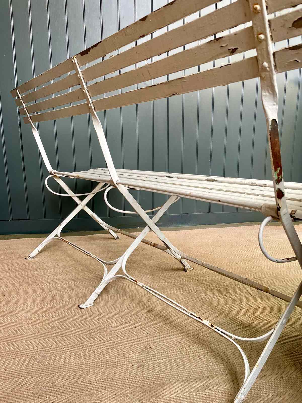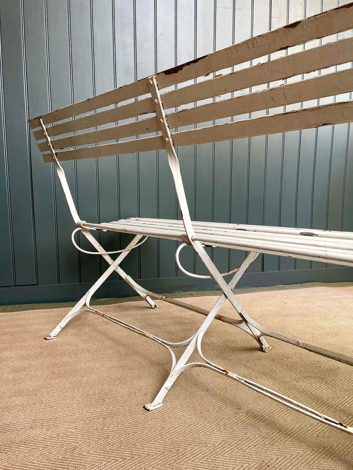 A classic French folding garden bench, in lovely weathered chippy paint. The wooden slats are all in good vintage condition, and the steel riveted base folds easily for winter storage. Given the riveted base I think this is quite an early example, from the second quarter of the 20C. I have a set of four matching chairs that I will list separately, and happy to sell in pairs. The seat height is approximately 43cm.