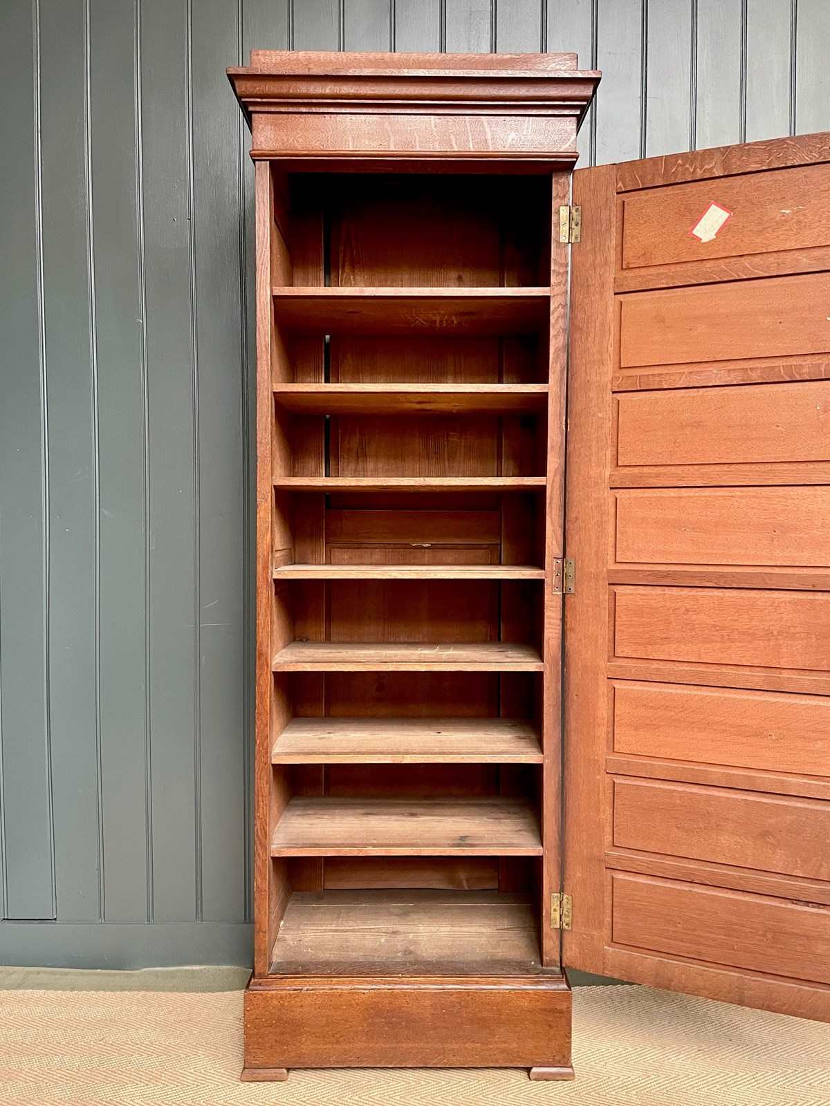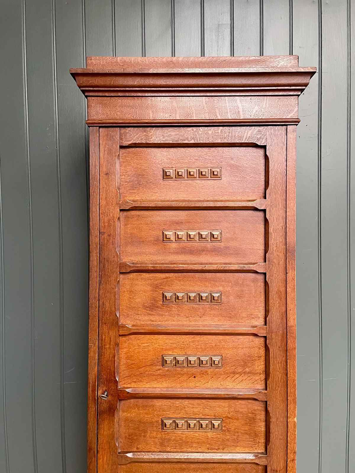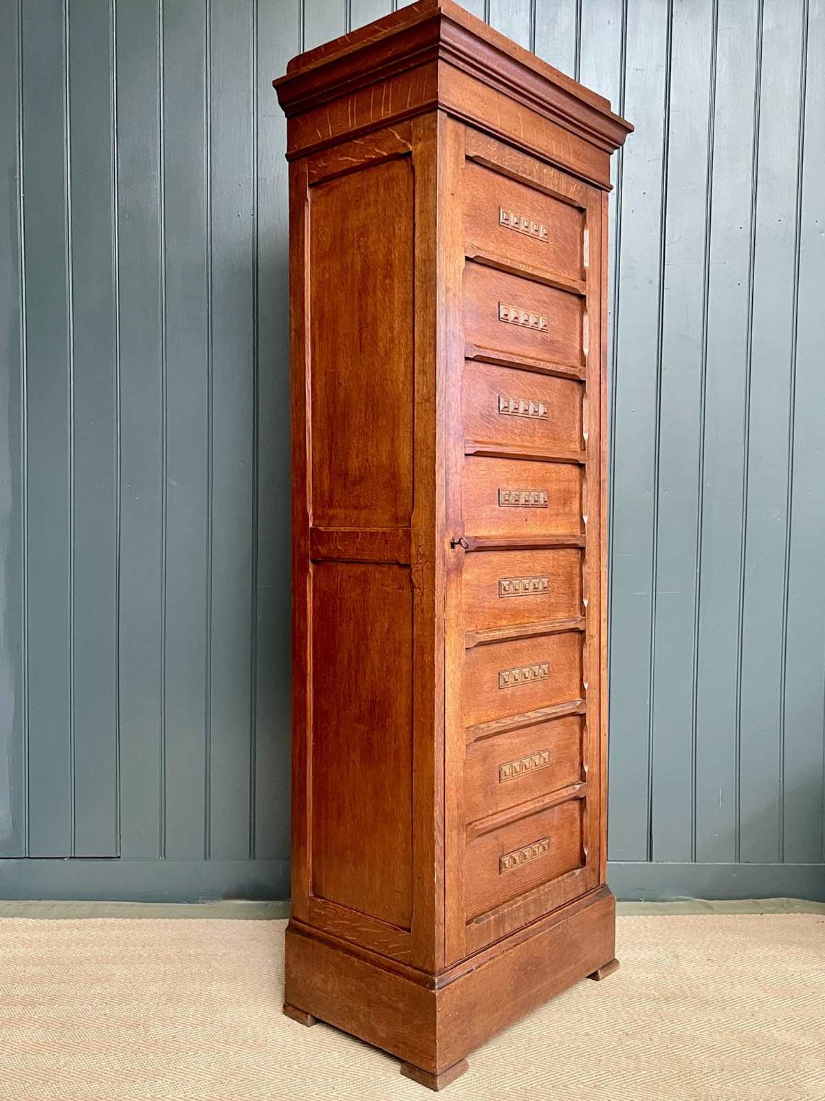 A handsome French oak notaire’s cupboard, with a panelled door and shelved inetrior. Lovely vintage condition with original working lock and key, and a really neat compact footprint. The internal dimensions for each shelf are H: 14.5cm x W: 46.5cm x D: 29.5cm