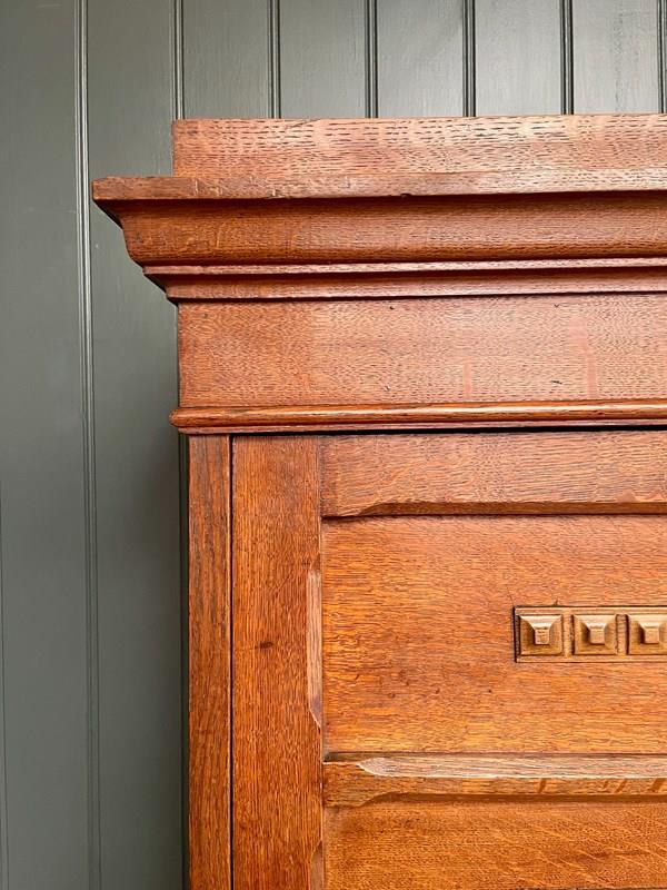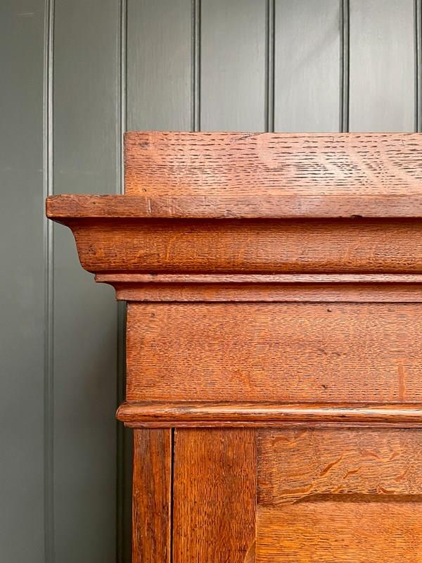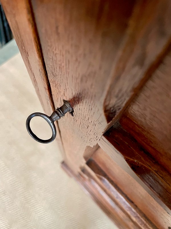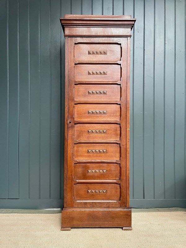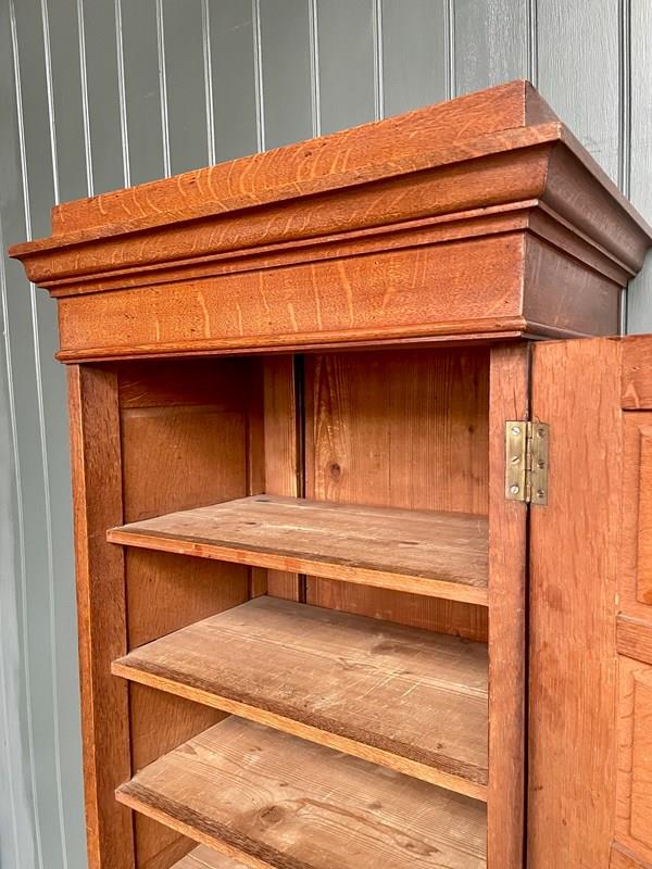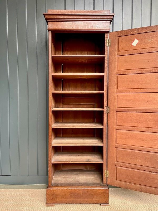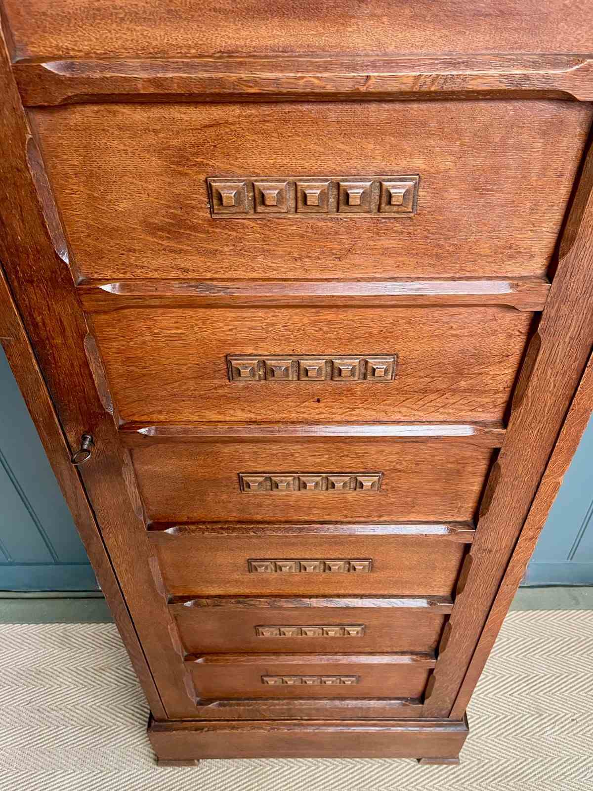 A handsome French oak notaire’s cupboard, with a panelled door and shelved inetrior. Lovely vintage condition with original working lock and key, and a really neat compact footprint. The internal dimensions for each shelf are H: 14.5cm x W: 46.5cm x D: 29.5cm
