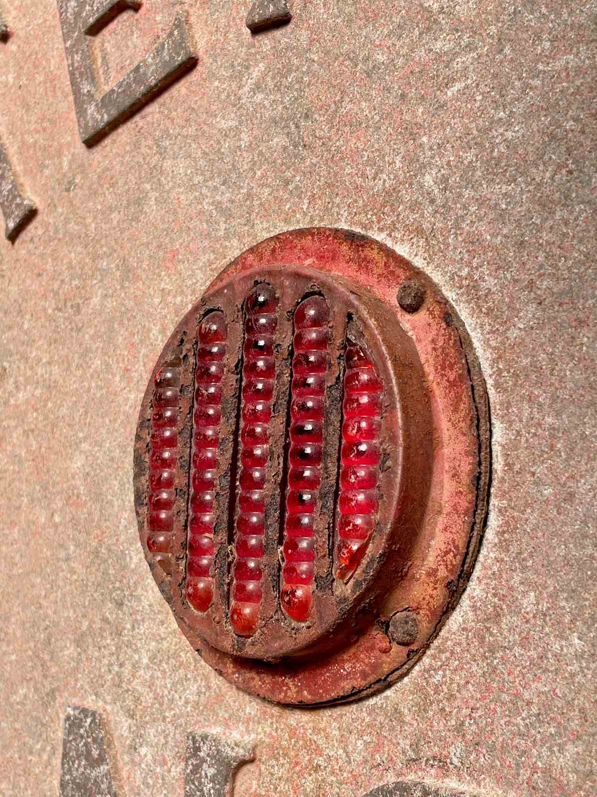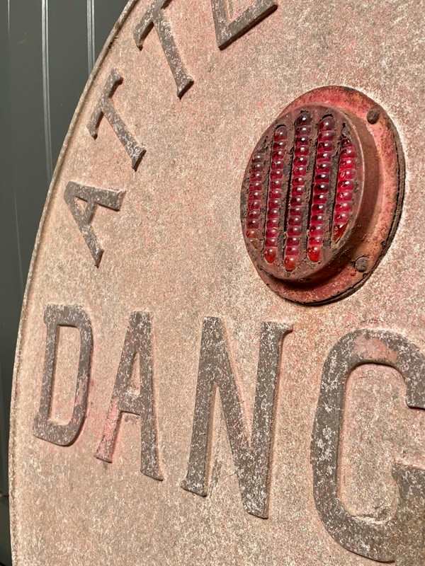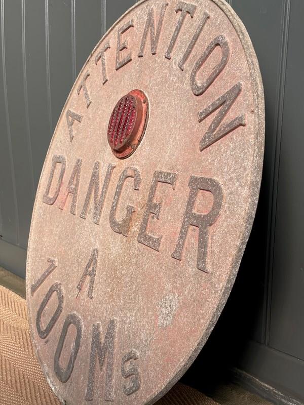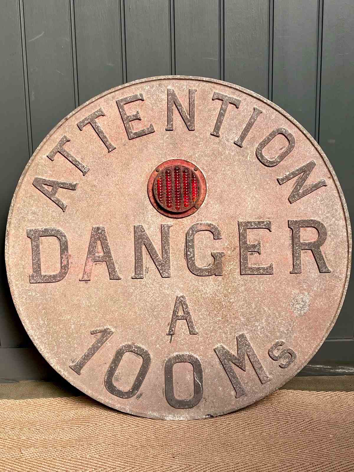 Lovely French road sign warning of Danger ahead, and complete with red reflective ‘beads’ to catch the headlight’s beam. Beautiful patina, with just the last hints of the original paint still visible.