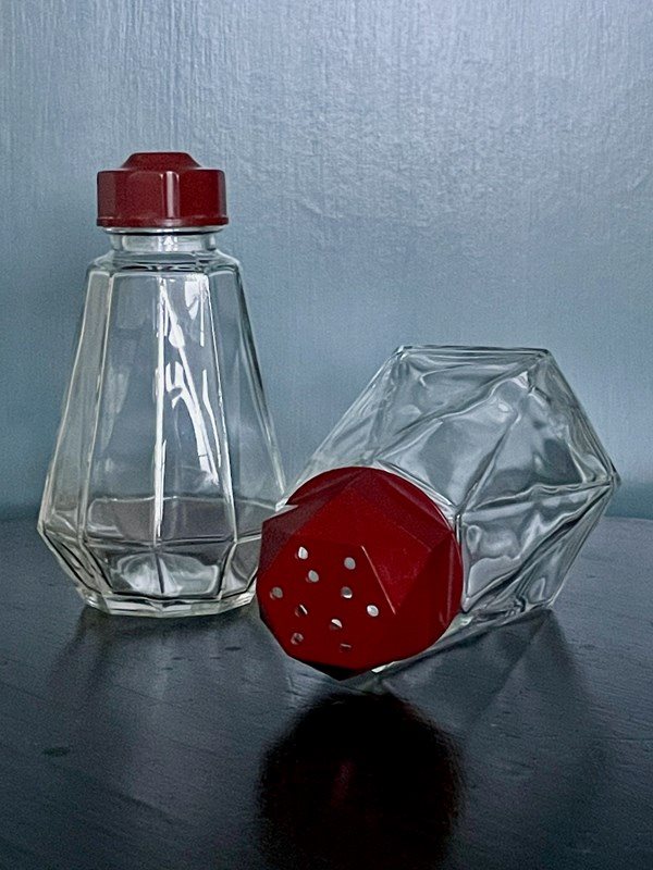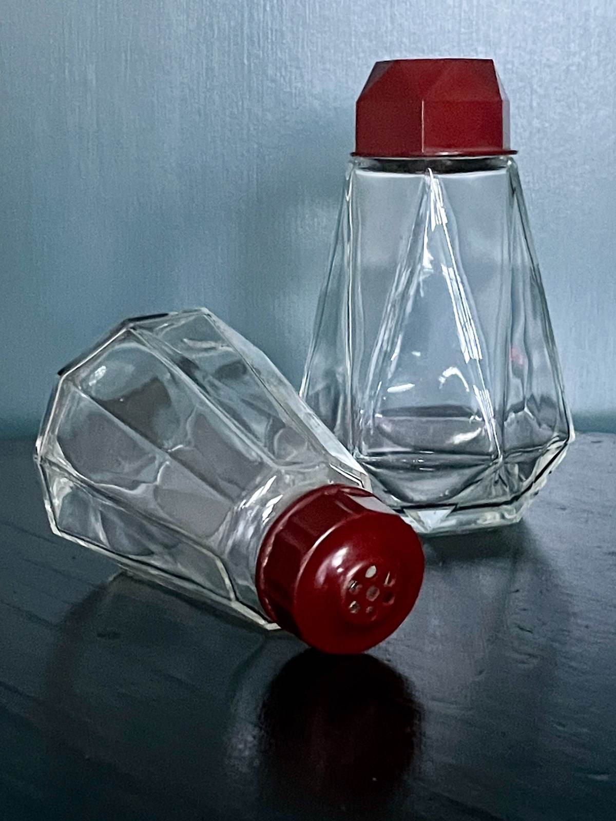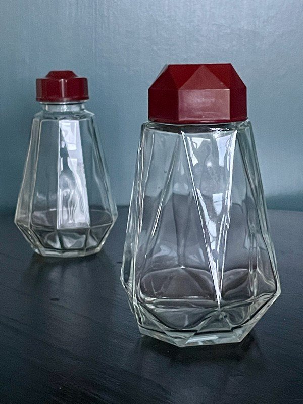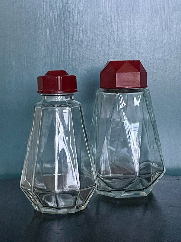 Stylish french sugar shakers, with faceted glass and lovely red bakelite tops. Beautiful condition with no knocks or chips. Price is £28 for the smaller.