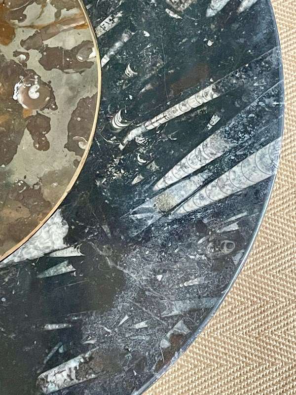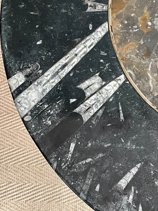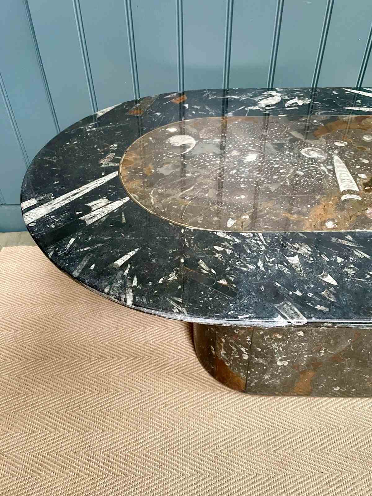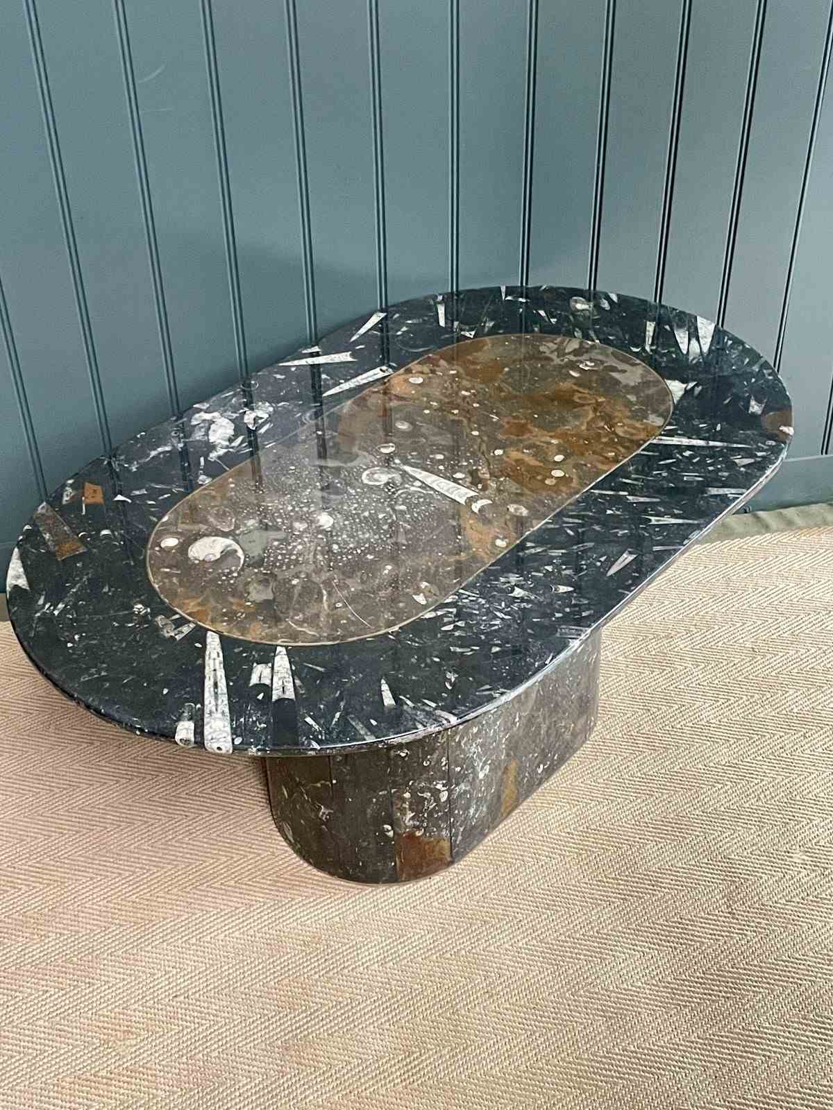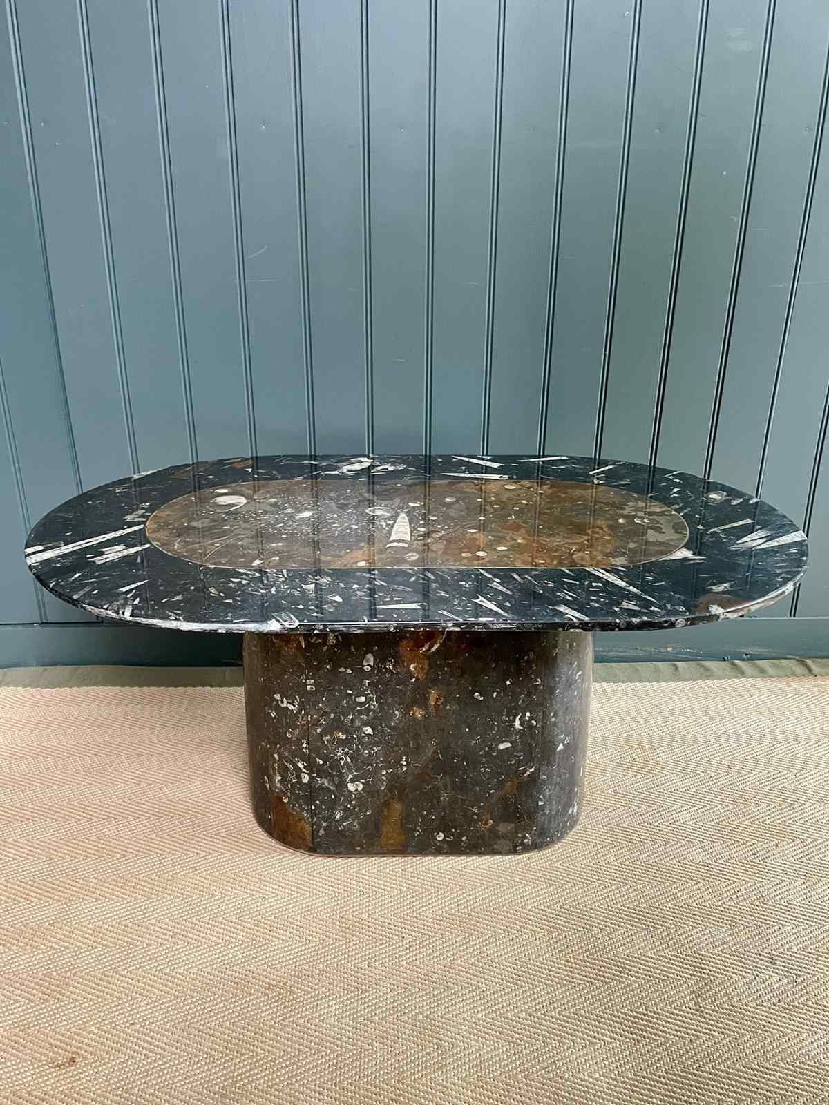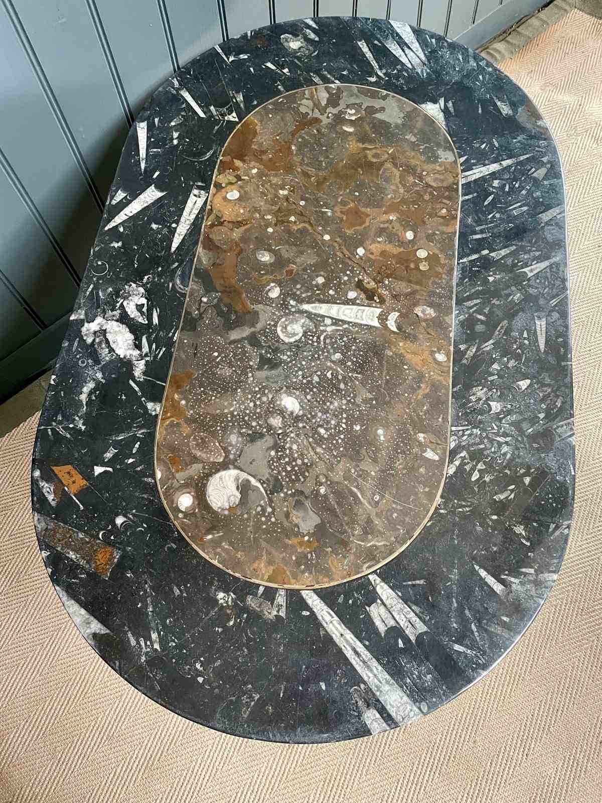 Stylish oval marble coffee table with some truly beautiful fossils. The centre is a lovely palette of browns, separated from the perimeter of charcoal tones by a fine brass inlay. No knocks or chips to either the top or the base, and just light wear consistent with age.