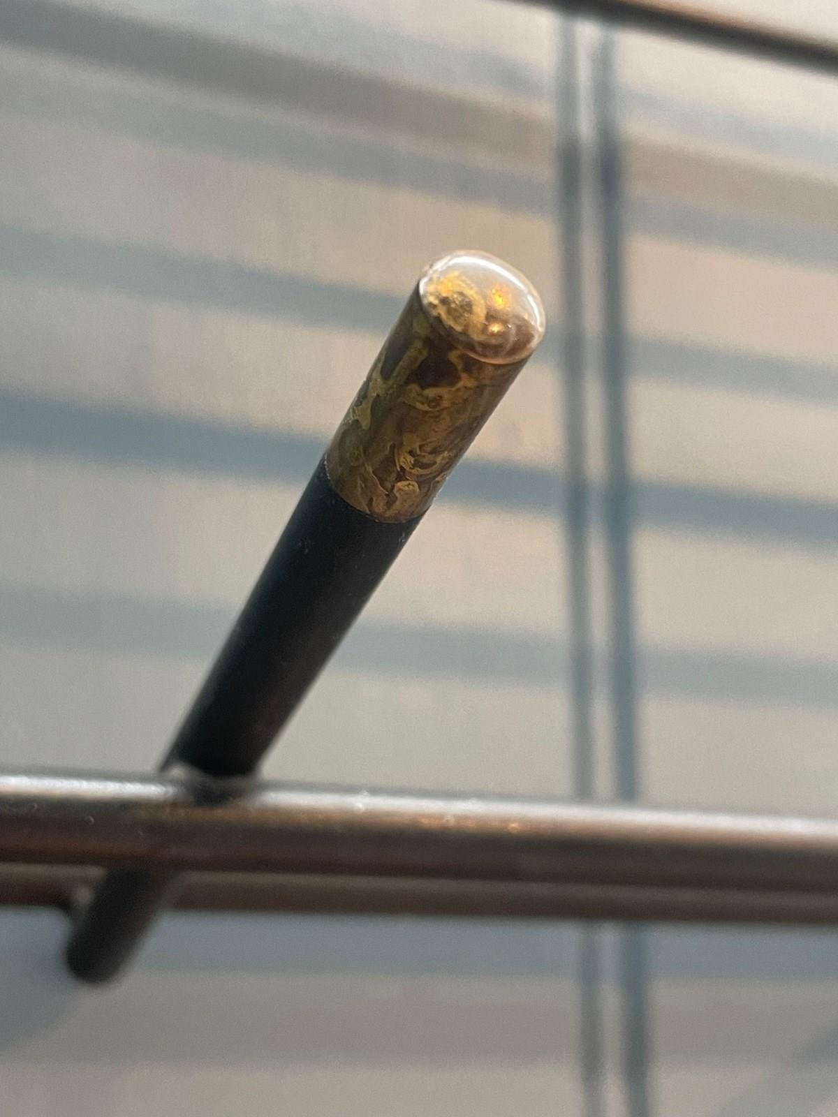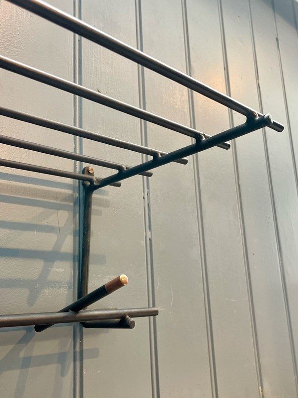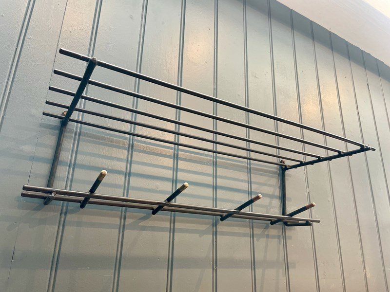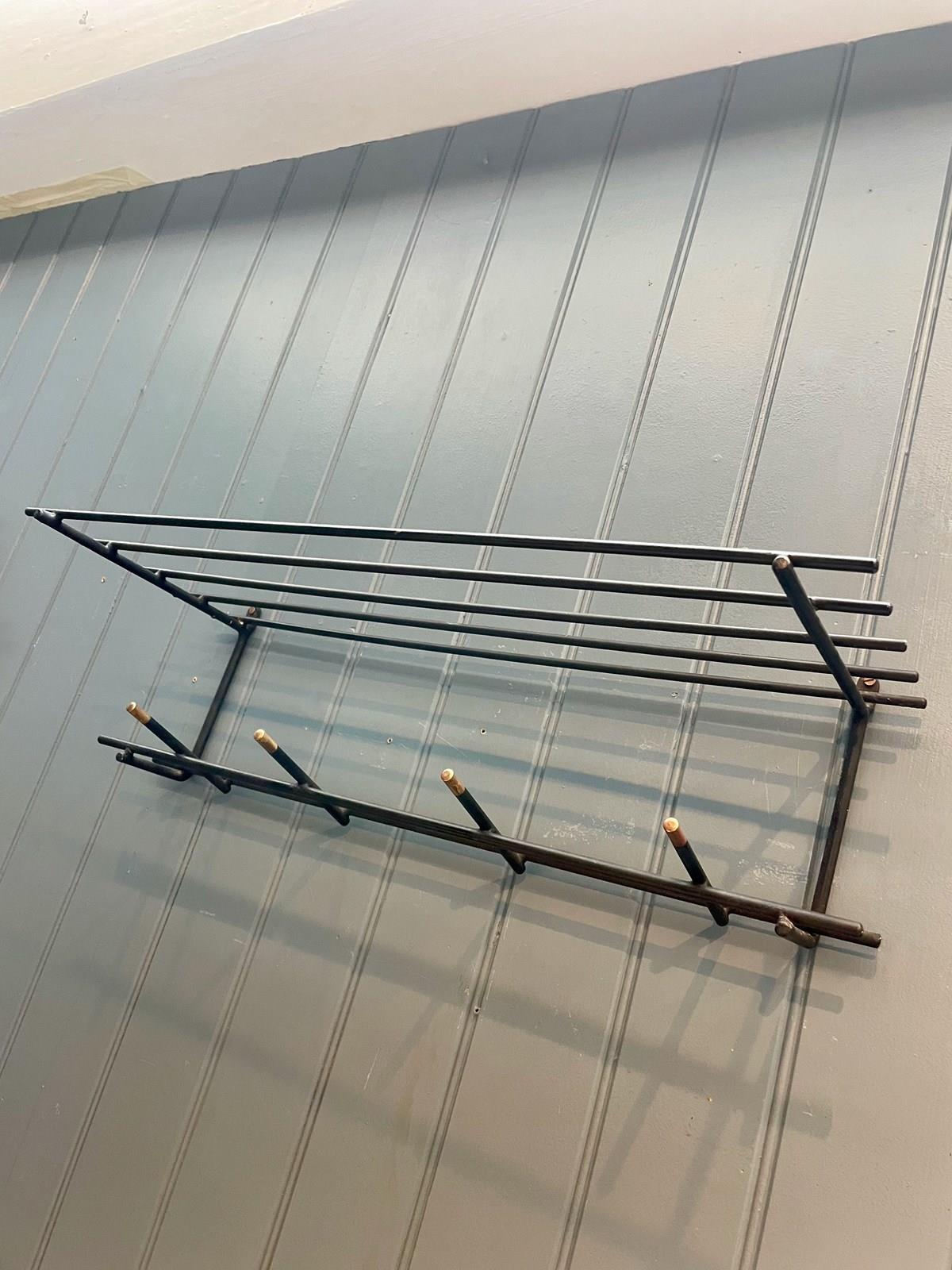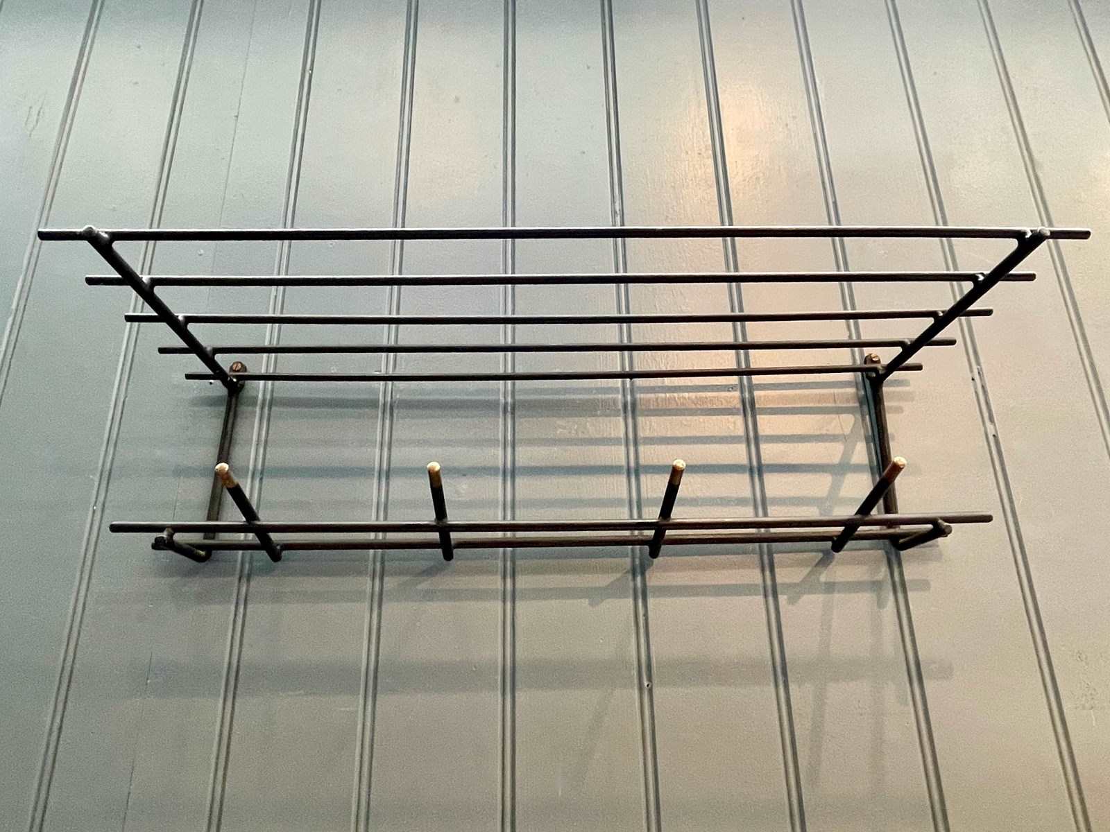 A simple but very stylish mid-cenury coat rack, with four brass-tipped hooks below a 5-bar shelf. Lovely condition to the original black paint, and requires just two screws for wall-fixing.