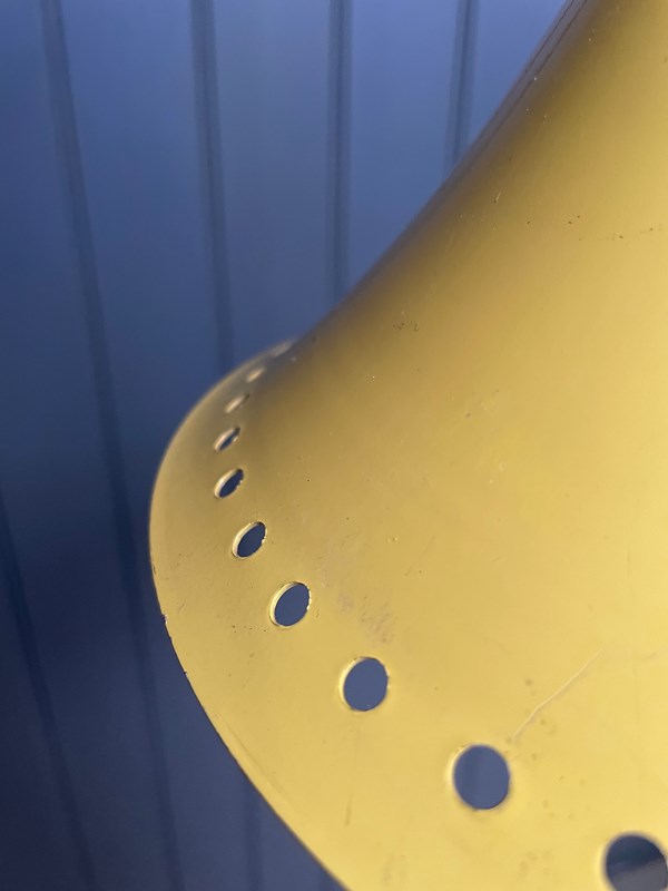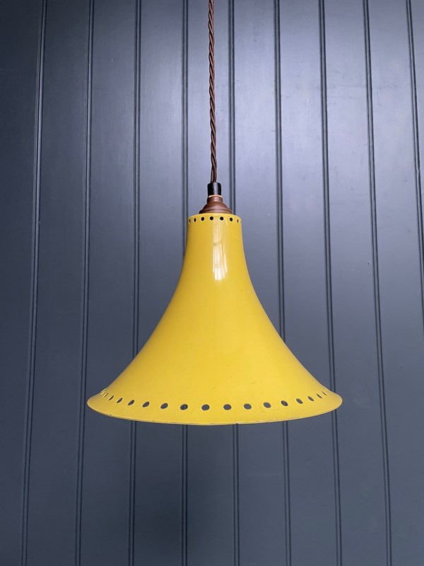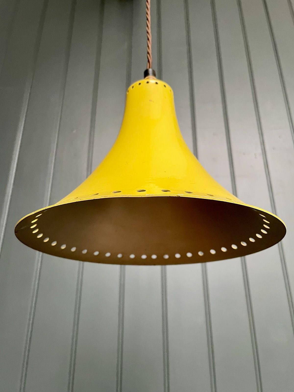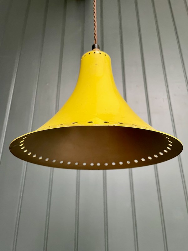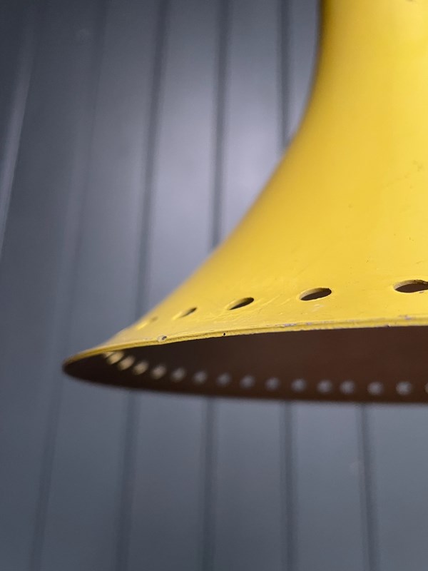 A simple and stylish aluminium ceiling lamp with a perforated perimeter. A simple flared design in a striking colour. Newly rewired with a metre of braided flex, and a bulb-holder that accepts standard BC bulbs.