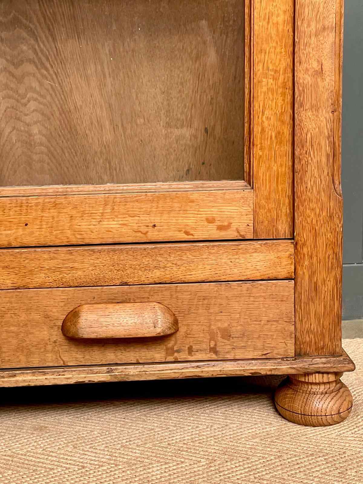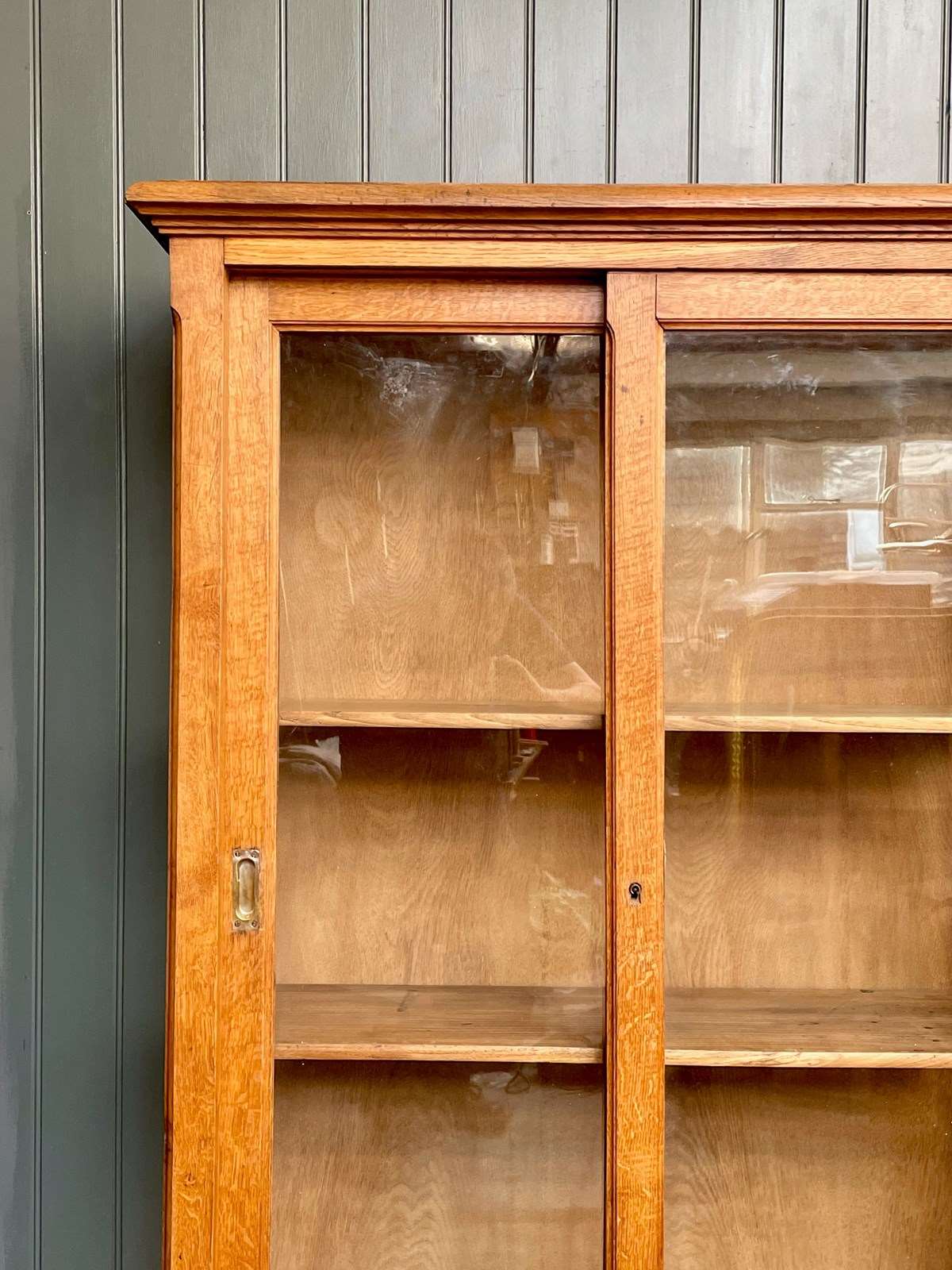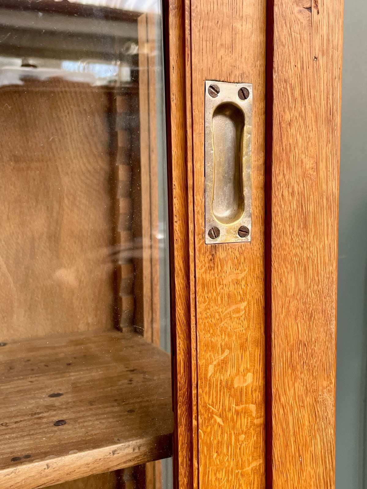A handsome oak cabinet with two sliding glazed doors and adjustable shelves to the interior. Nice colour and condition to the oak, and original recessed brass handles. The original glass to the left hand side is made from two pieces, but barely registers. There are a couple of small drawers and two original shelves, which measure 90cm x 27cm.