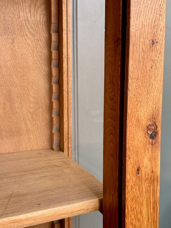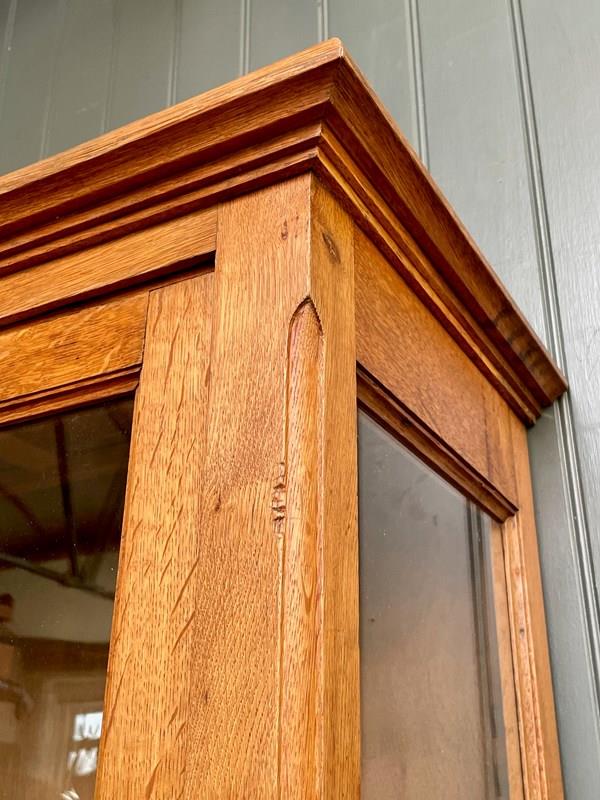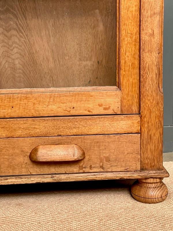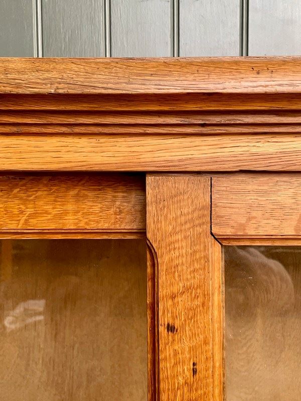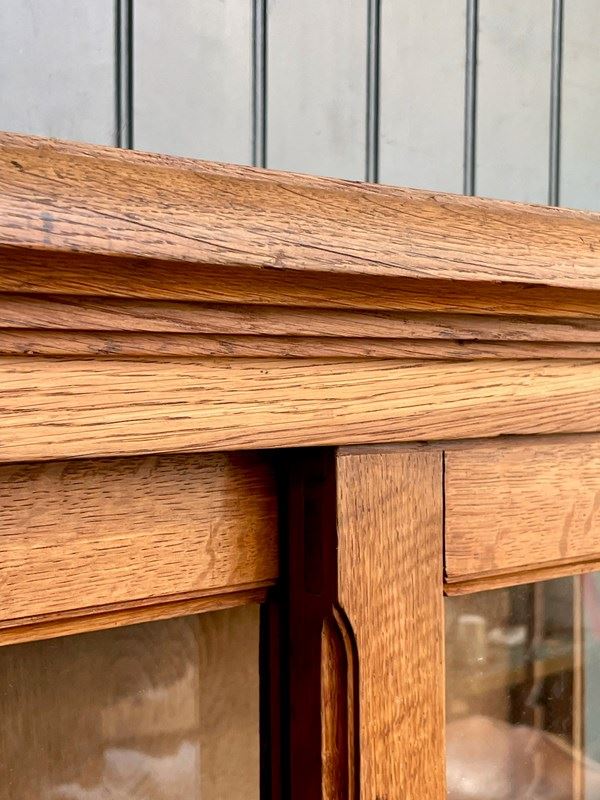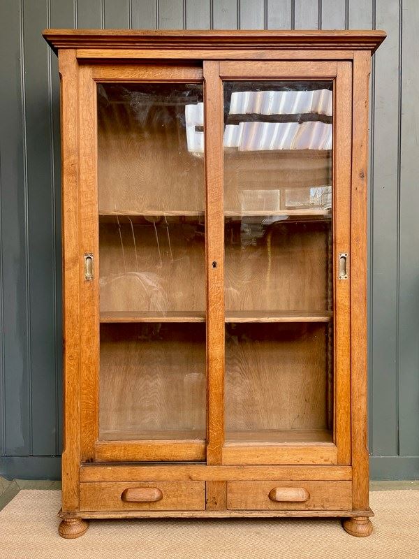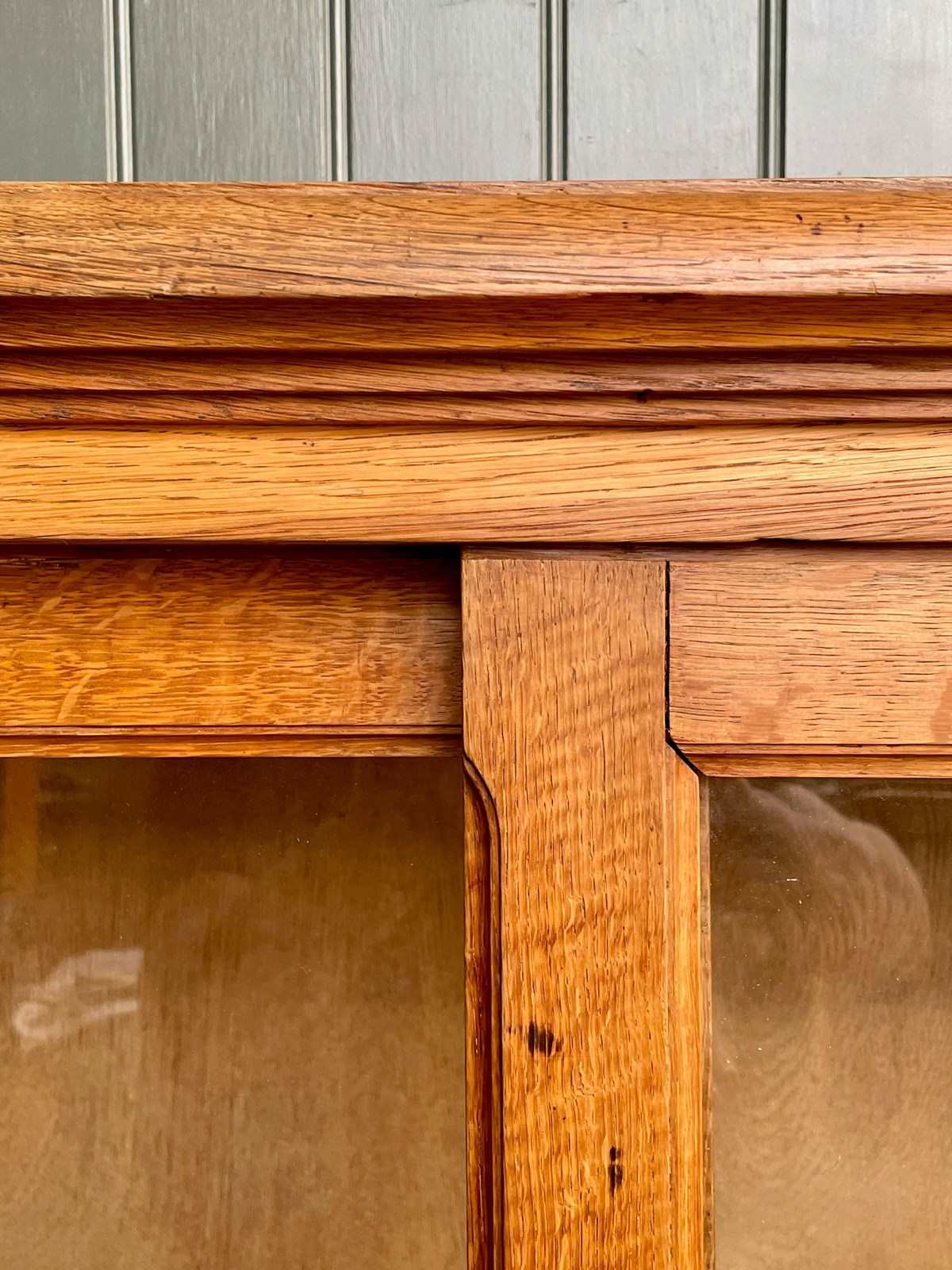 A handsome oak cabinet with two sliding glazed doors and adjustable shelves to the interior. Nice colour and condition to the oak, and original recessed brass handles. The original glass to the left hand side is made from two pieces, but barely registers. There are a couple of small drawers and two original shelves, which measure 90cm x 27cm.