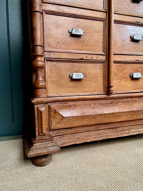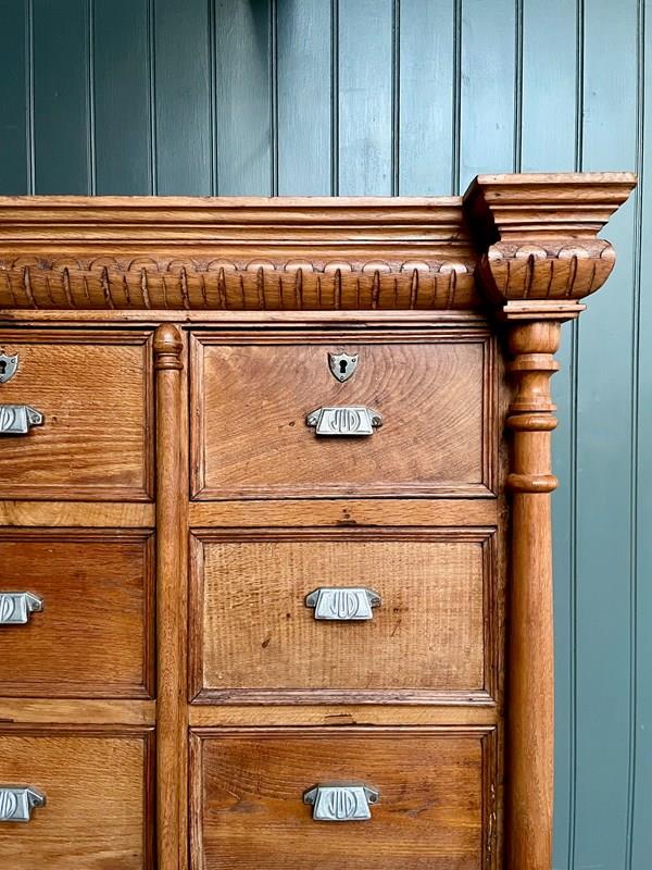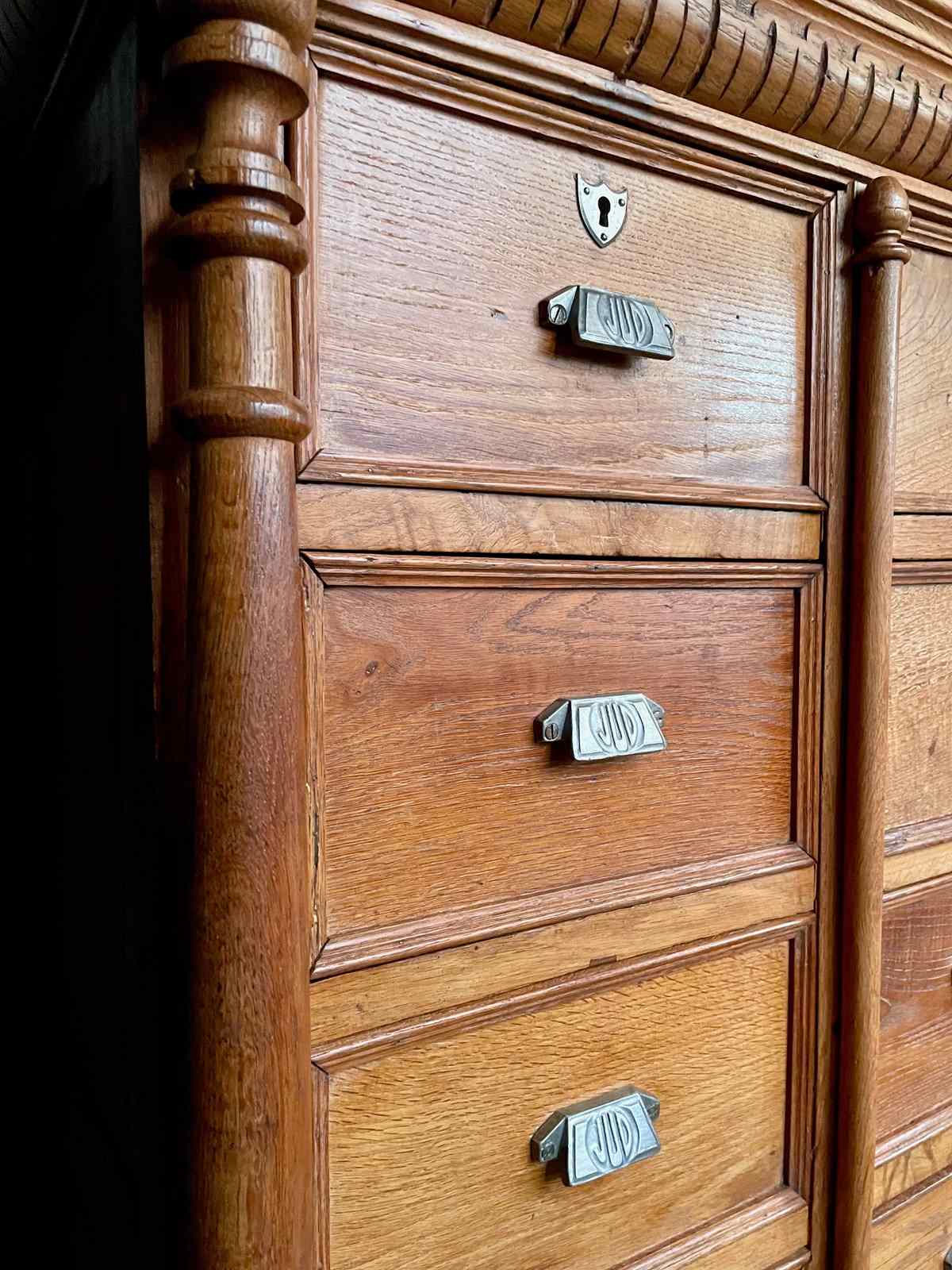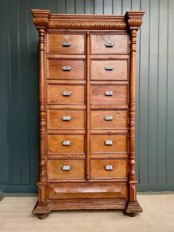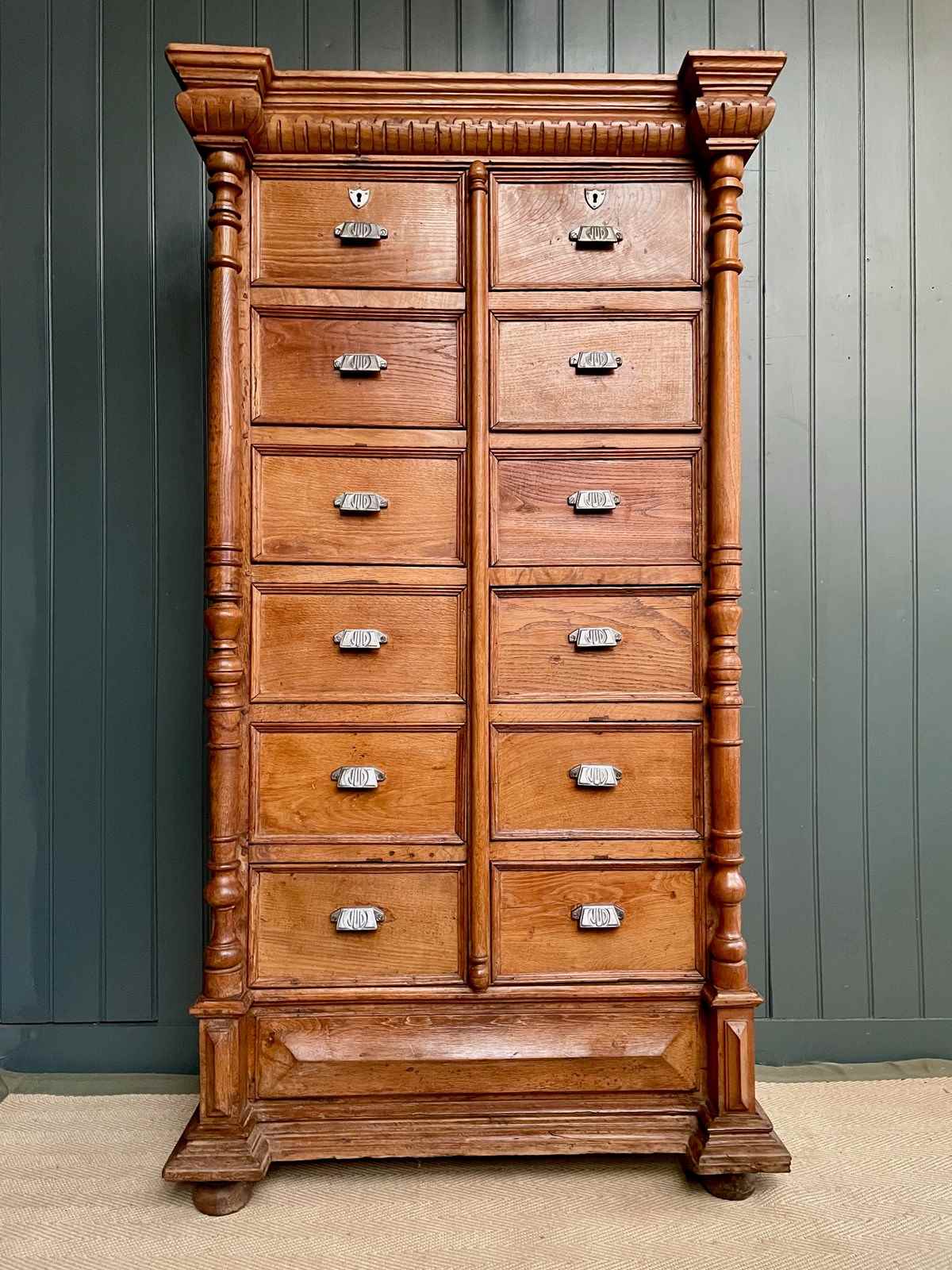 A really handsome oak shop-keeper’s chest of drawers from a Belgian store. Some lovely almost architectural details, such as the heavily moulded plinth and cornice, and unusual turned columns to each side. The twelve drawers all have cast alloy handles bearing the letters JUD, and the upper two still retain the original escutcheons, although the locks are no longer present. A good colour throughout, and with patination and wear consistent with age. The internal drawer measurements are: H: 16.5cm W: x 31.5cm x D: 32cm. A striking and useful piece, with a relatively small footprint that would work well in any number of settings.